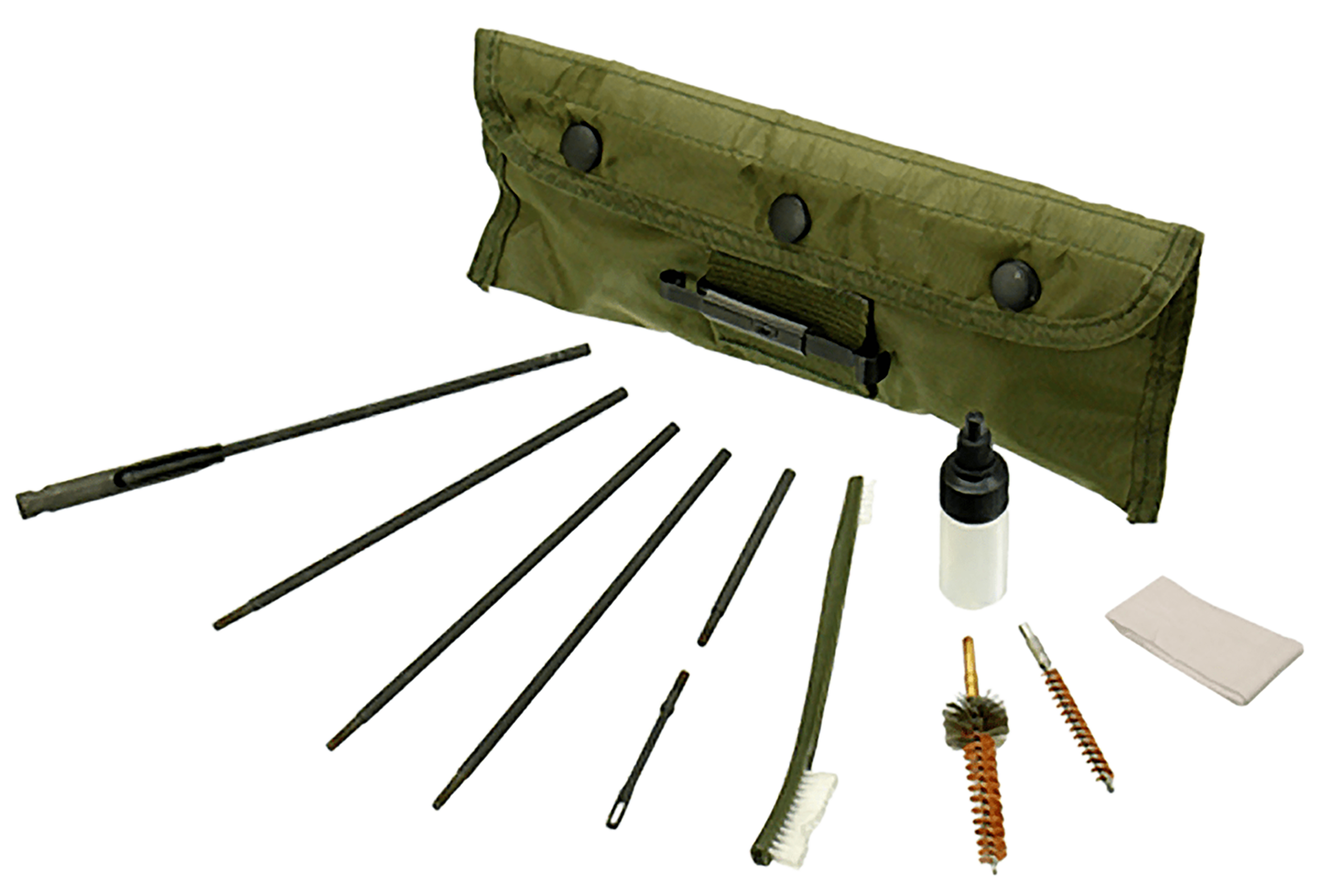 Complete Model 15/16 Cleaning Kit with 5 Piece Rods (Includes Loop), Adaptor, Bronze Bore Brush, Chamber Brush, Dual-Ended Nylon Brush, Oil Bottle and Cleaning Cloth. 8.6 oz Cleaning Kit Replaces Conventional Hefty Weight Cleaning Gear, Great for Field Operations or At-home Cleaning. Standard 8-32 Threads for any Compatible Components on the Market. Neatly Stored In a 2-Compartment Lightweight Nylon Storage Bag with Hook-and-loop Closure, can be Easily Stored In the A-2 Buttstock as well. Pouch Includes Belt Loop and Alice Clip for Attachment to Belt or Web Gear