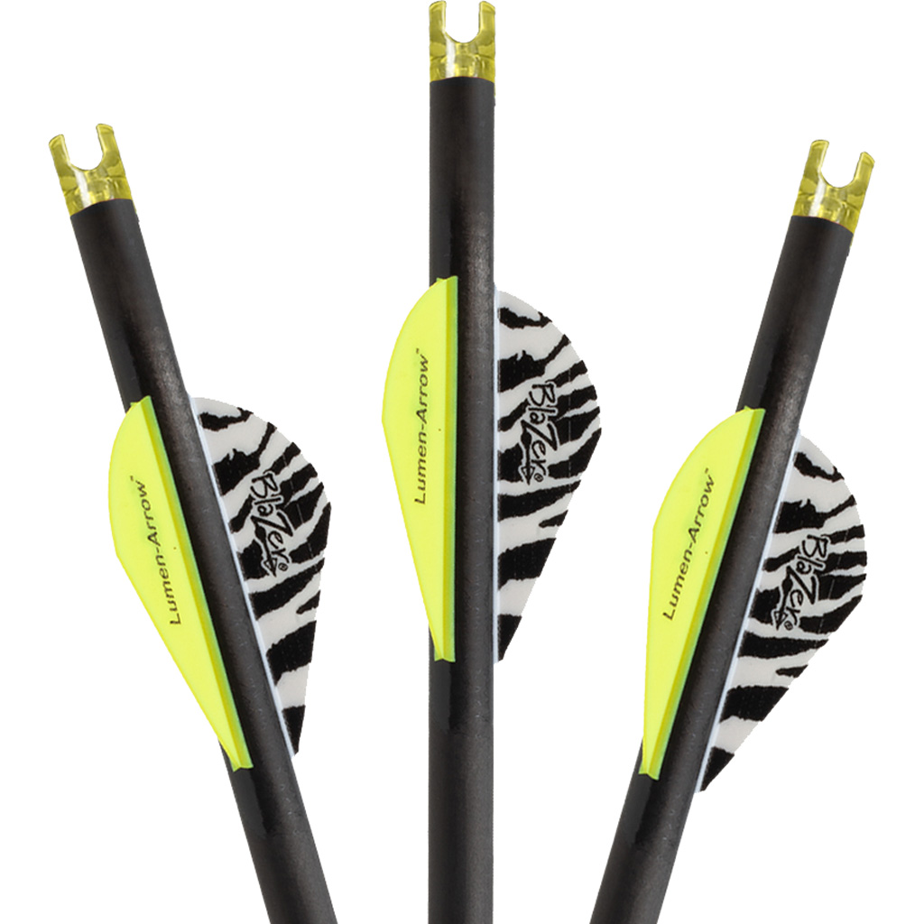 100 percent carbon crossbow bolt with Lumenok lighted nocks installed. Bolts are squared on the nock end to ensure proper functioning of the lighted nock. Factory fletched with 2" Blazer vanes. Length: 20". Includes brass inserts. Weight: 338 gr. (without point).