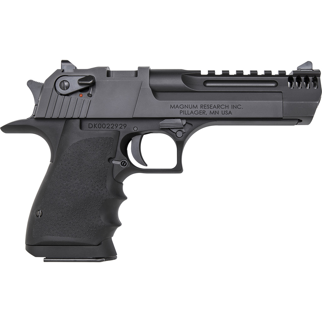 The Mark XIX L5 in .50 AE is a lightweight pistol offered with an all 5-inch barrel length and feature hard coat anodized black aluminum frame, black carbon steel slide and barrel, and Hogue finger groove rubber grip. This pistol also has Magnum Research’s integral muzzle brake, and a fluted barrel with Picatinny Style acessory rail. The overall length is 9.75”, height is 6.25” and the slide width is 1.25”.