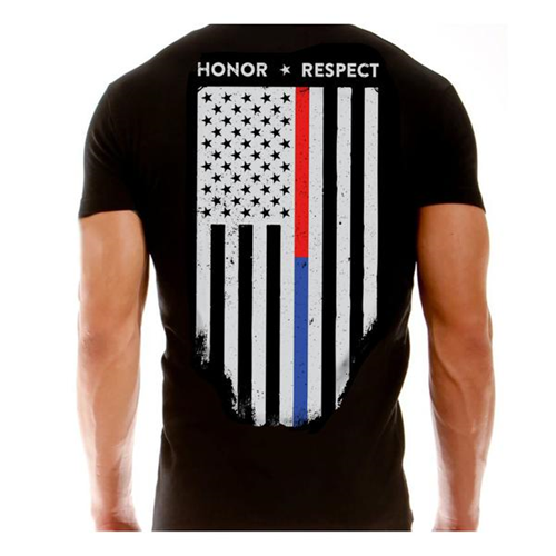The Thin Dual Line Flag T-shirt shows support for both our nation's law enforcement officers and firefighters. This unique design combines the sleek style of the Thin Dual Line with a tattered American flag; showing the struggle and fight behind our country. The back displays a larger visual, with the words Honor and Respect written proudly. Wearing this shirt honors our defenders through public support, and the donation given with every order respects the work they do.