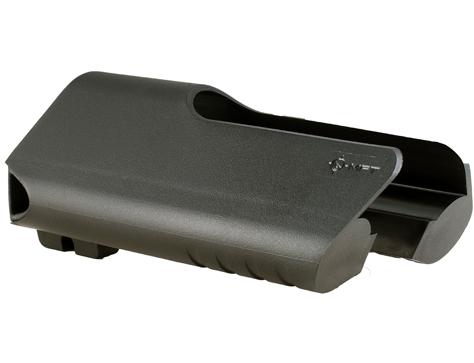 The E-volv Battle Stock Attachment securely mounts to the standard collapsible stock with no modifications. The E2BSA provides a comfortable surface that allows an enhanced cheek weld and allows both standard and quick-detach sling mounting options. In addition two watertight compartments provide silent and cushioned battery storage that eliminates the possibility of contact resulting in discharged batteries.