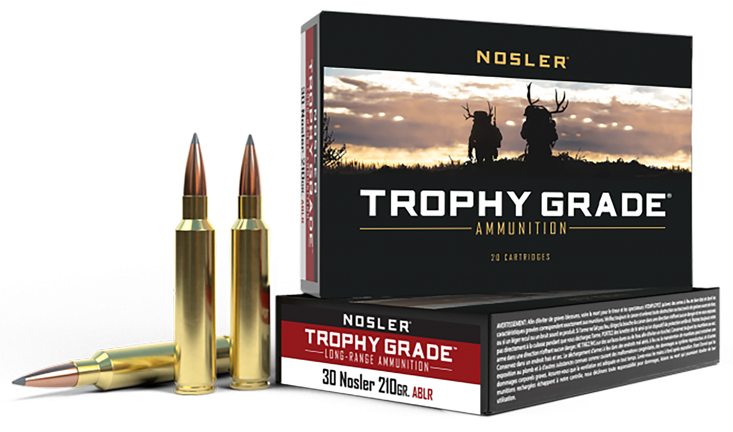 Loaded with the AccuBond-Long Range bullet, Trophy Grade Long-Range ammunition is designed for hunters and shooters looking for high-performance ammunition loaded with an ultra-high B.C. bonded-core bullet. Developed through a combination of bullet manufacturing techniques that are unique to Nosler, the design of the AccuBond-LR allows for the highest B.C. possible in a bullet of the same caliber and weight. The high-performance boat tail, long ogive, and polymer tip combine to make the AccuBond-LR the sleekest, flattest- shooting, bonded, hunting bullet ever created. Loaded in Nosler Custom brass, the quality, consistency, and accuracy of Nosler's Trophy Grade Long-Range ammunition rival that of the finest custom loads.