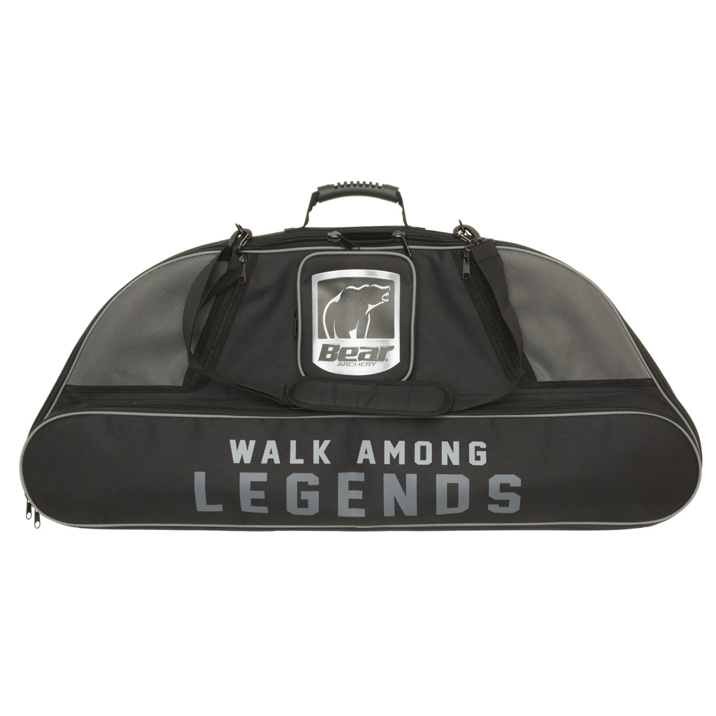 The Bear Archery Legends Bow Case features a fleece interior, multiple accessory pockets with tube pocket, internal bow tie downs, shoulder strap, carrying handle and skid plates. Interior dimensions: 39”x15”x3”.