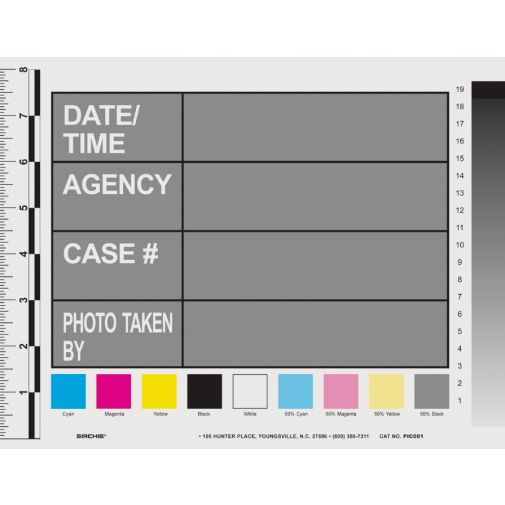 Each card has a color scale and a gray scale, as well as a space for identifying the photographer, agency, and date. The side scales permit relative size of objects of evidence.