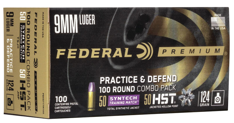 Federal, MFG# P9HST1TM100, UPC: 604544653595, UOM: BOX, Practice & Defend, 9mm Luger, 124 grain, HST JHP/Syntech TSJ, 100/bx, FEDE, FEDEAM40, FEDEAMALL, AM40, AMALL, Case: 5