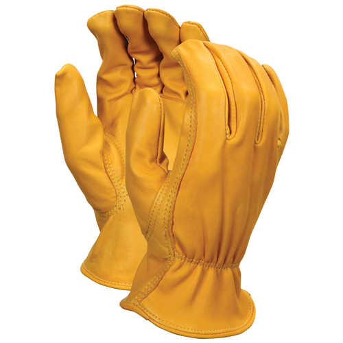 This supple leather contains natural lanolin that helps create a very soft feel. Characteristics include strongest tensile strength and excellent tactile sensitivity. Best combination of flexibility and comfort. The 3620 series features Premiun Grade gold/yellow grain goatskin leather, shirred elastic back, rolled leather hem and keystone thumb.