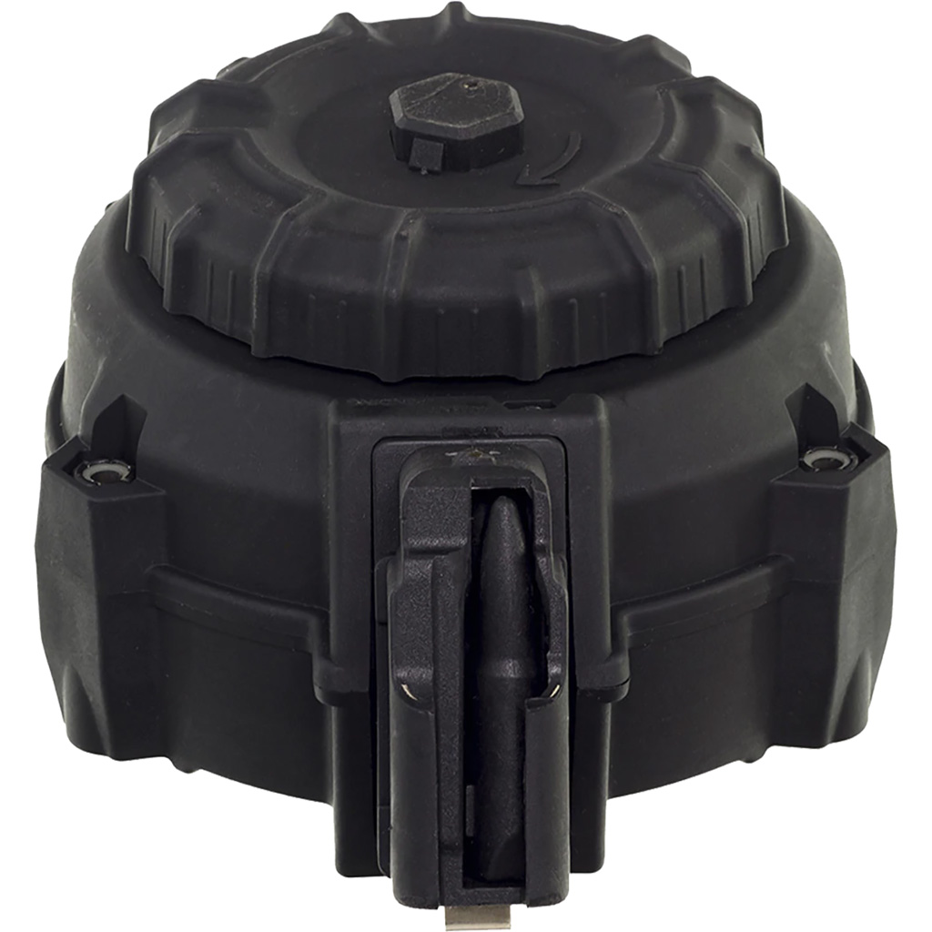 This AK-47 drum from ProMag has a body constructed of a proprietary DuPont Zytel based polymer. It has over molded stamped feed lips made of steel, along with front and rear magazine catch. Additional components include an injection molded magazine follower and a spring formed from heat-treated chrome silicon wire. FIts most common variants of AKs in 7.62x39mm. Does not fit unconverted Saiga rifles.