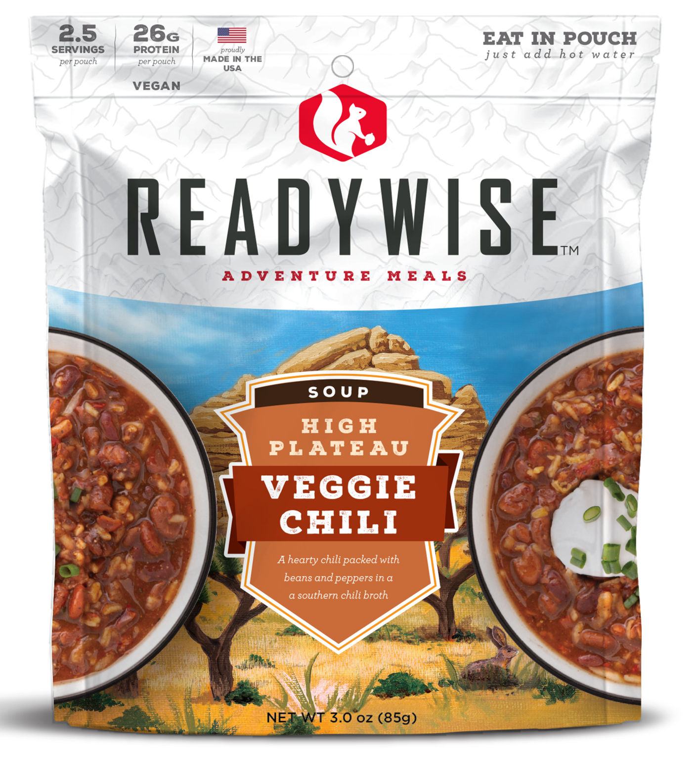 ReadyWise Company provides dependable, simple and affordable food options for out of kitchen situations. With a wide variety of options for families and individuals interested in storing long-term foods in case of emergency, on a camping or road trip, or at the lease, you may never miss the kitchen at all. There is an assortment of great-tasting gourmet entrees, vegetables and fruits you and your family will love to eat. These ready-made, freeze-dried and dehydrated meals are nitrogen-packed in mylar pouches to maintain freshness and are prepared in minutes simply by adding boiling water. Each pouch of the High Plateau Veggie Chili Soup contains 2.5 servings and is resealable. These pouches are lightweight making them easily portable on any outdoor adventure. Just add water and you can eat directly from the pouch.