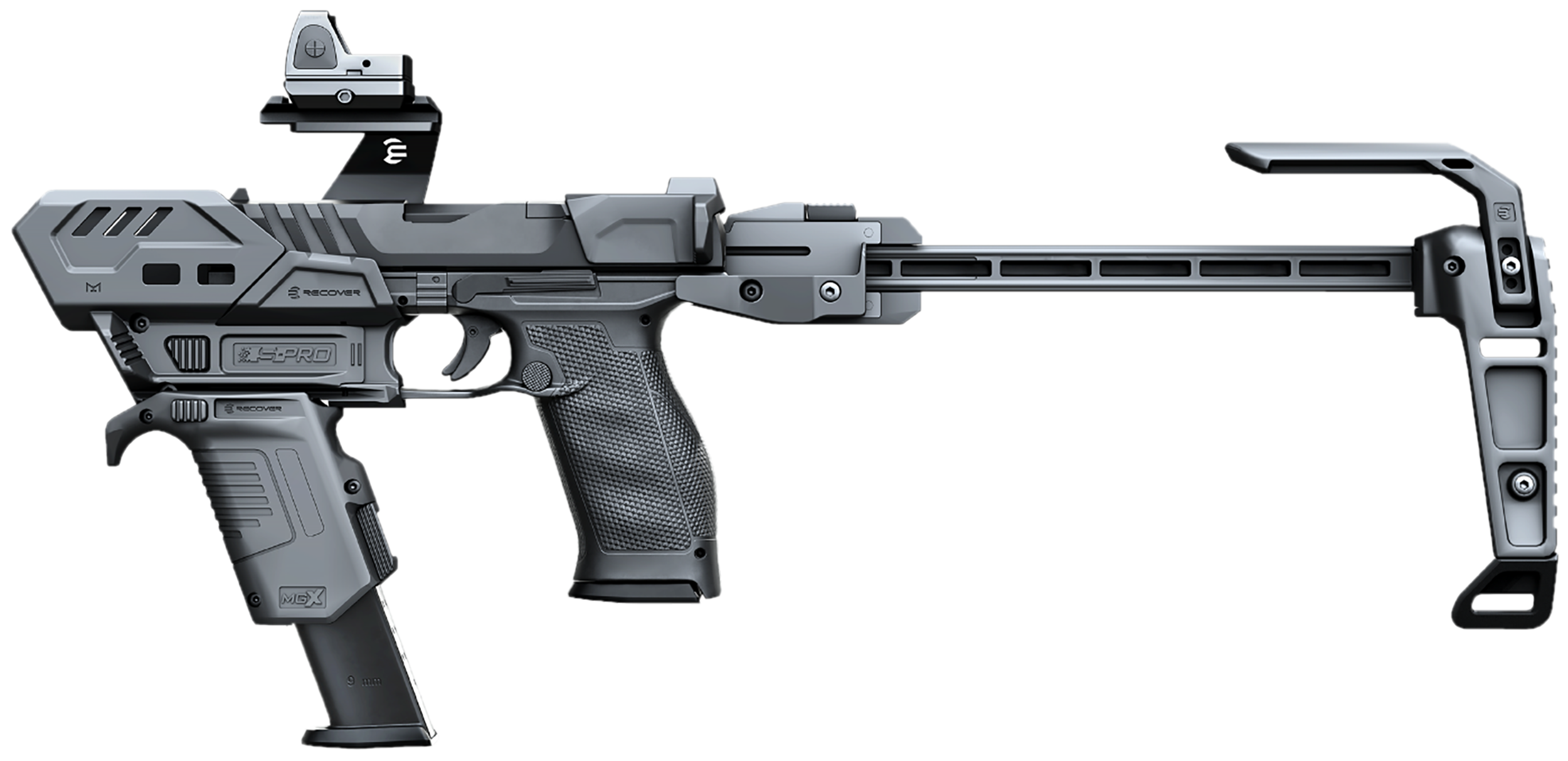 S-PRO is next-level pistol conversion kit, featuring a spring-loaded stabilizer (which can be converted to a buttstock by removing the included brace attachment), MLOK mounting options, and broad compatibility.
