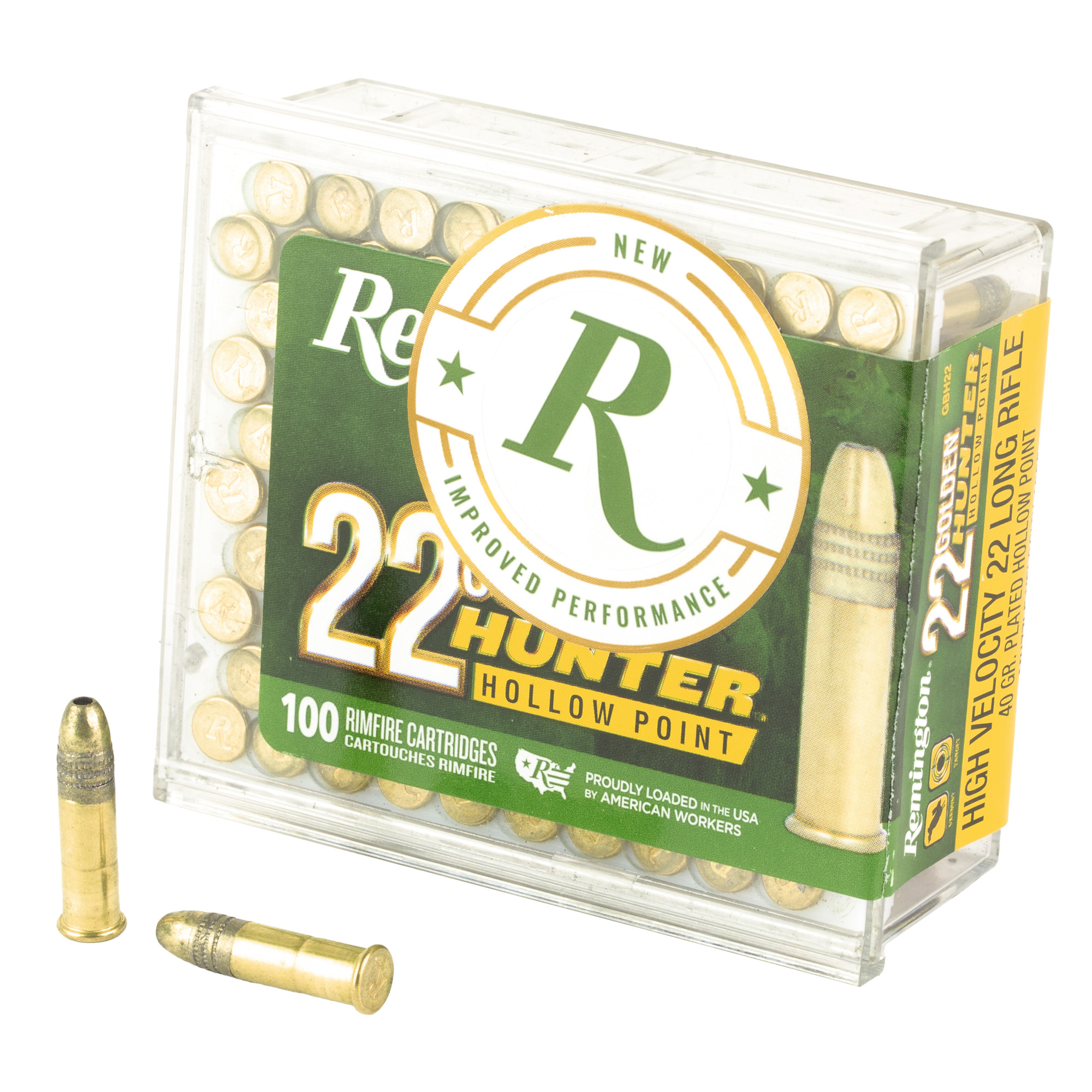 Small game beware! Golden Hunter's plated hollow points are ready for a 22LR takedown. At home on a squirrel, rabbit, or any small game hunt, 22 Golden Hunter reliably expands for quick force transfer on target. Available in 40-grain, 100 or 550-round cartons.Features :