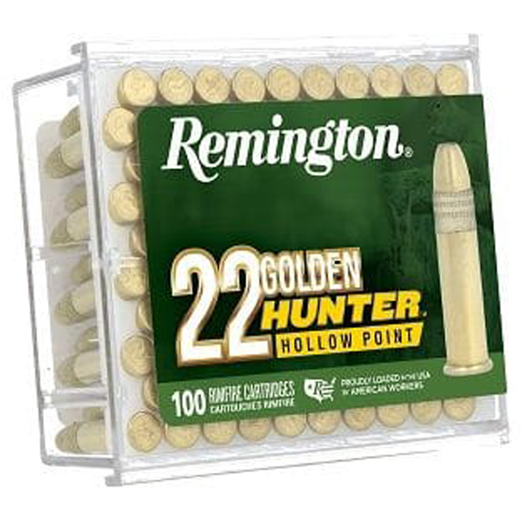 Remington's Golden Hunter Rimfire Ammunition is the gold standard in .22 LR rounds, designed for precision and reliability in the field. This 100-round pack contains 40-grain plated hollow point bullets engineered to expand on impact, providing maximum energy transfer for hunting small game. With improved rimfire technology, these rounds offer consistent high-velocity performance and accuracy.