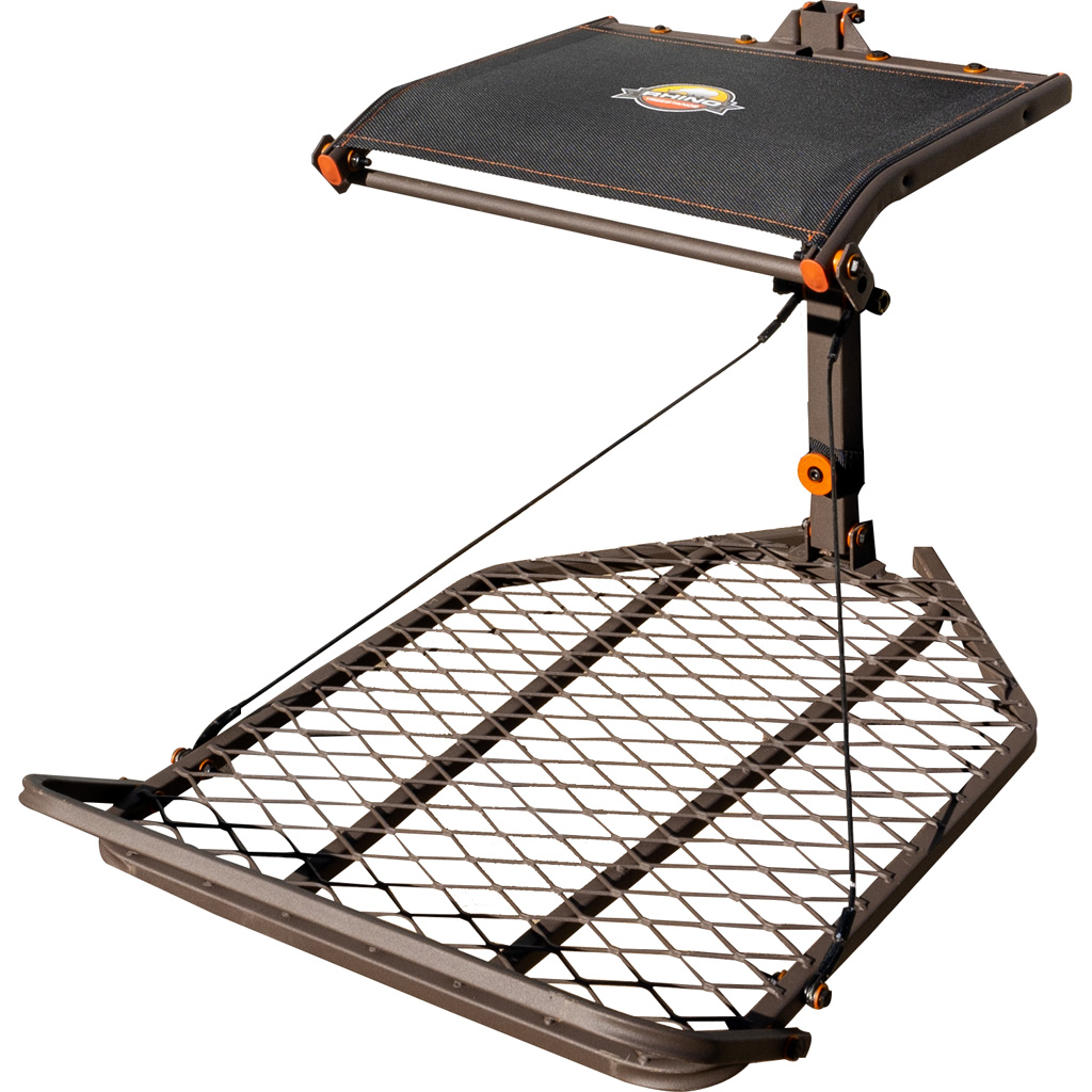 The Rhino Hang On Stand is engineered for the hunter prioritizing comfort and stability in their hunting setup. This stand features a spacious 24" x 32.5" foot platform with an updated V-Bar for improved tree grip and a leveling system to ensure an even stance. The comfort mesh seat measures 20" x 14" with a 21" seat height, offering a comfortable perch with a leveling mechanism for the seat and foot platform.