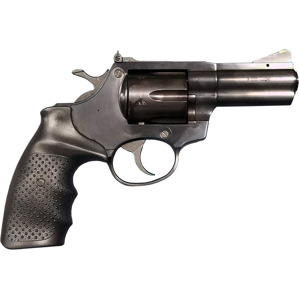 Rock Island AL9.0 Standard DA/SA Revolver in 9mm. 3 in. barrel. Blued and black frame. Black rubber grip. 6 rd. cylinder. Fixed front ramp sight with highlighting. Adjustable rear sight.