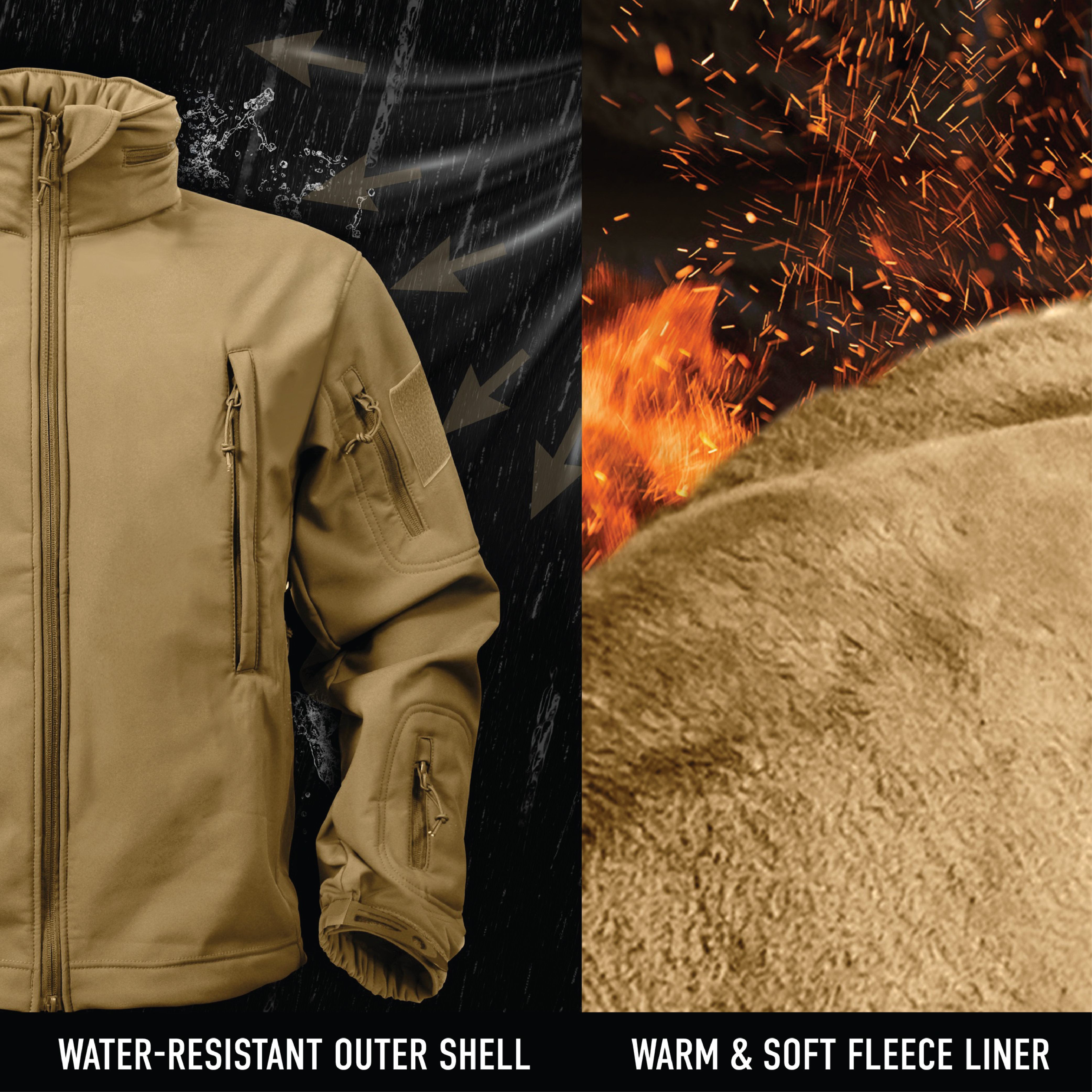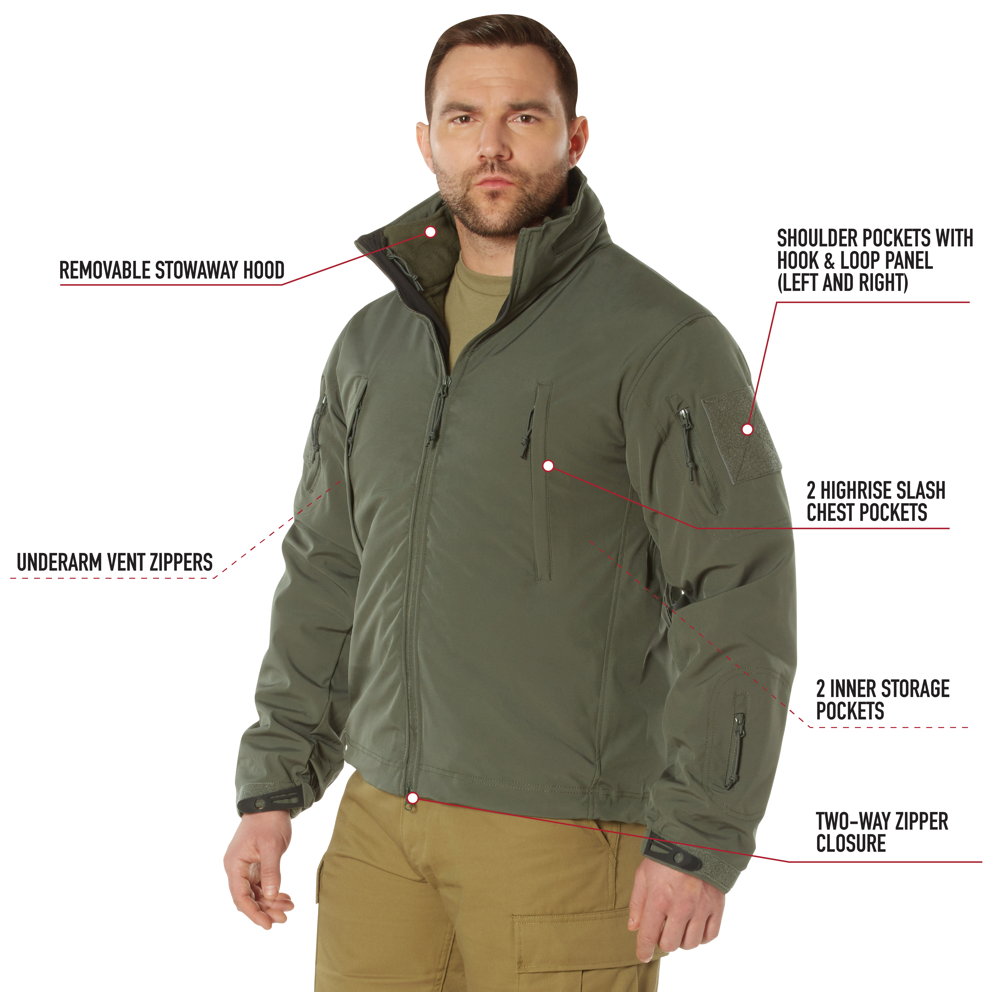 Defend yourself against the toughest weather with the Spec Ops 3-in-1 Soft Shell Jacket. The tactical military jacket features a waterproof outer shell and a removable fleece liner. You can wear both layers together or separately as a windbreaker and a fleece jacket. As part of Rothco’s rugged Soft Shell outerwear series, the high-performance jacket shields you from cold and wet weather. The Soft Shell waterproof 3-layer fabric system deflects wind, retains heat, and releases moisture. Warm & Soft Fleece Liner: Made of 100% polyester fleece, the removable liner keeps your body warm and comfortable in a variety of environments as a standalone jacket or as an inner layer. The fleece jacket features a full-length zipper, its own loop hanger, along with 2 interior mesh drop pockets and 2 front zipper pockets for storing small everyday carry items like your cellphone and wallet. High-Capacity Storage: These tactical jackets feature a variety of pockets. The 2 shoulder zipper pockets and 2 chest zipper pockets each have an opening for wired headphones, where you can store and connect your audio device or phone inside. The outer shell consists of 2 interior zipper pockets and a left forearm utility pocket for small items, and a double zipper back pocket that’s ideal for gloves and other cold weather accessories. Protection from the Elements: These winter coats also feature a removable stowaway hood that conveniently stores inside the collar, and is easily accessible when needed. The adjustable elastic wrist cuffs and drawstring waist help block the wind and cold weather while retaining your body temperature. Utility at the Forefront: The front full-length dual zipper allows you to open the jacket from both the top and bottom for quick and easy access to your items, while reinforced forearm yokes enhance the jacket’s durability and performance. The zippered underarm vents provide additional ventilation and breathability when needed. Display your flag and morale patches on the 2 shoulder loop fields.