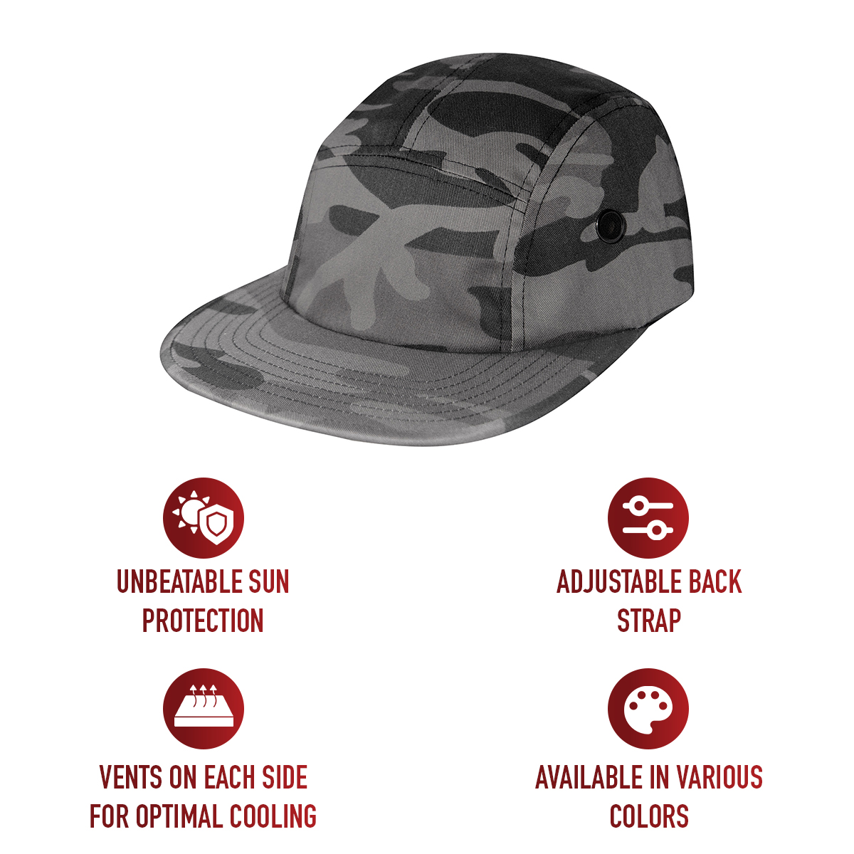Embrace retro flair with Rothco’s 5 Panel Street Cap. This active-duty cap features a classic design, ideal for screen printing and embroidery. Enjoy optimal airflow with vents on each side. It's one-size-fits-most with an adjustable back strap. Choose between poly-cotton with a leather strap or ripstop with a plastic buckle. Keep your head in the game with Rothco’s collection of headwear and accessories. Designed with precision and purpose, our headgear is built to withstand the harshest conditions. Whether you’re tackling the cold in one of our Watch Caps or Balaclavas, or out on a mission in a Boonie Hat or Fatigue Cap, our diverse range of headwear provides unmatched comfort and protection for everyone from active-duty personnel to outdoor enthusiasts.