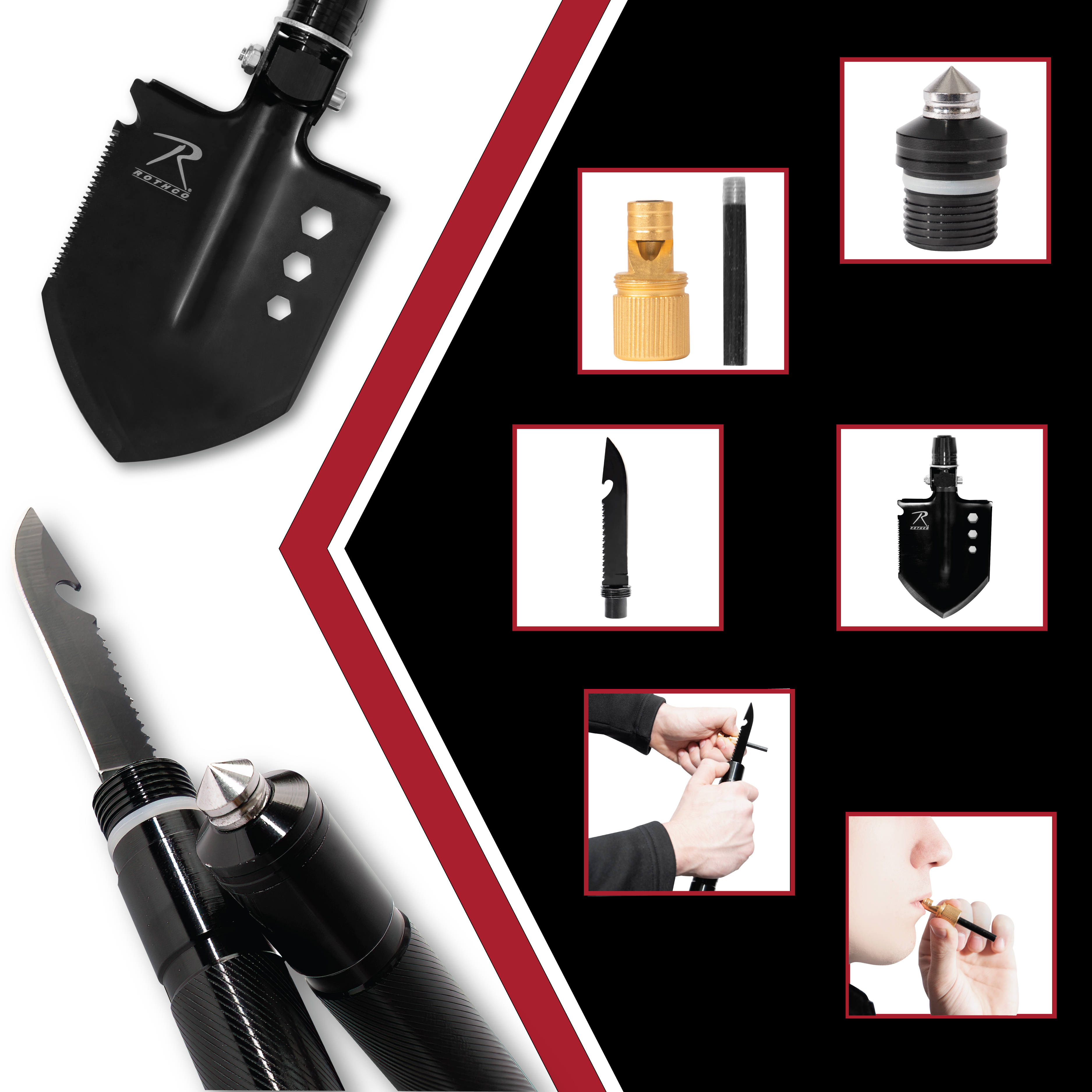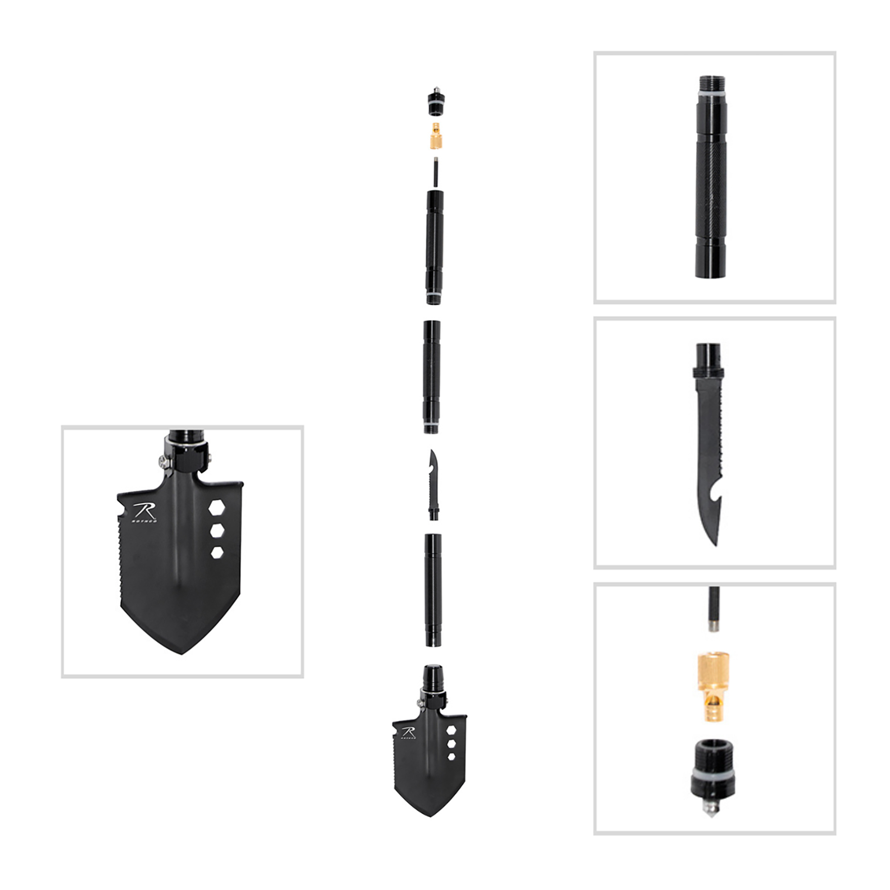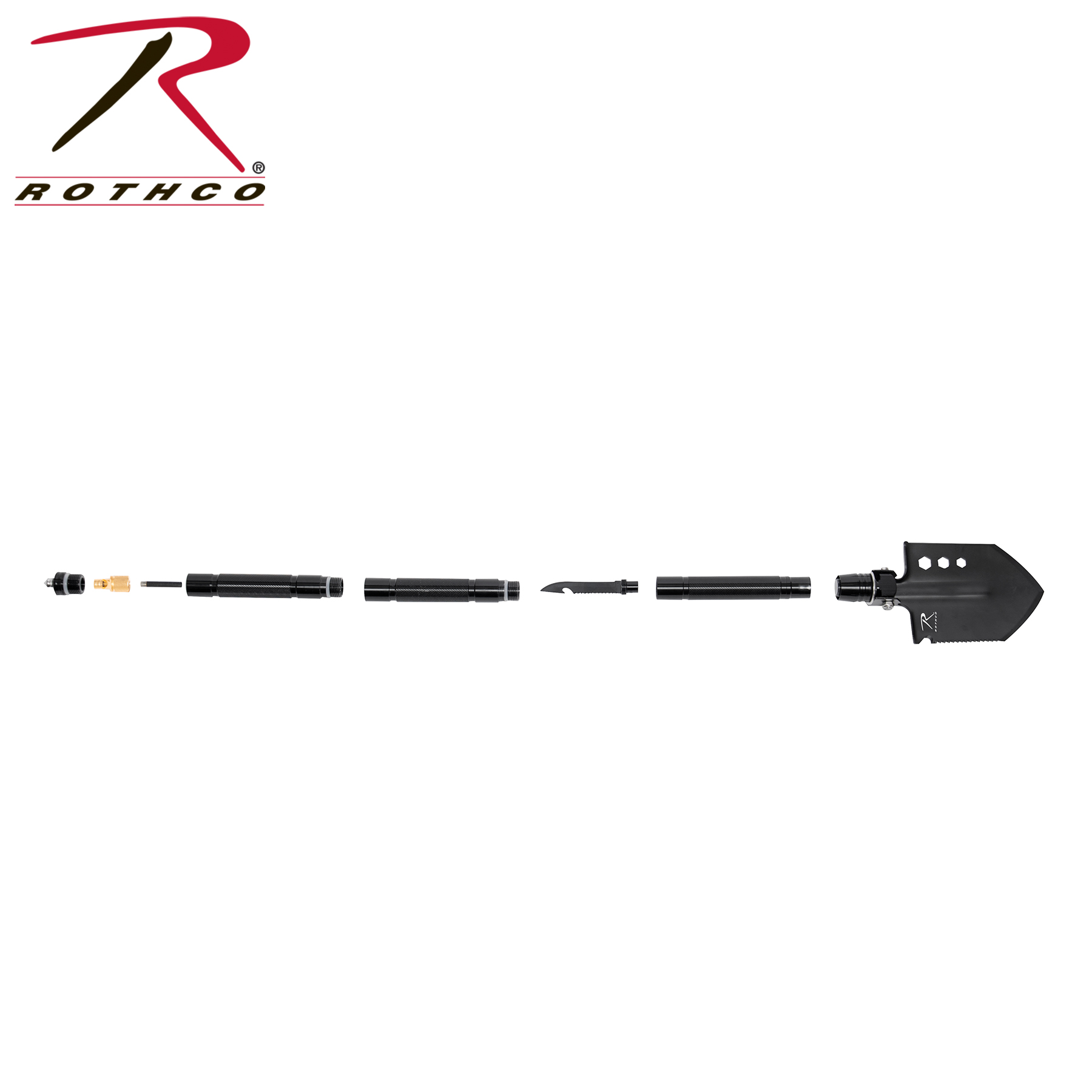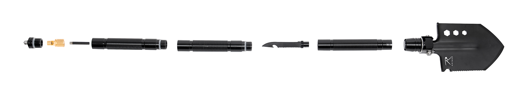 Rothco’s Steel Multi-Tool Survival Shovel features everything you need for backpacking and survival, including a knife, sawblade, whistle, fire rod, window breaker, hex wrench, rope cutter, and a hollow handle for dry storage. The knife, sawblade, whistle, and fire rod are stored in the handle for optimal packing capability. The shovel attachment features a saw edge, rope cutter, and a blade that can be sharpened for long-term use (shovel attachment measures 6.25 inches X 5 inches). The multitool shovel breaks down into three sections for compact storage. The survival whistle also acts as a handle for the fire rod, while the multifunction knife features an additional saw blade. The window breaker at the base of the handle makes the survival tool great for storing in the car. The hollow handle is great for storing fire starting materials. The survival shovel breaks down for storage in a two-piece polyester sheath. The total assembled length is 29.5 inches.