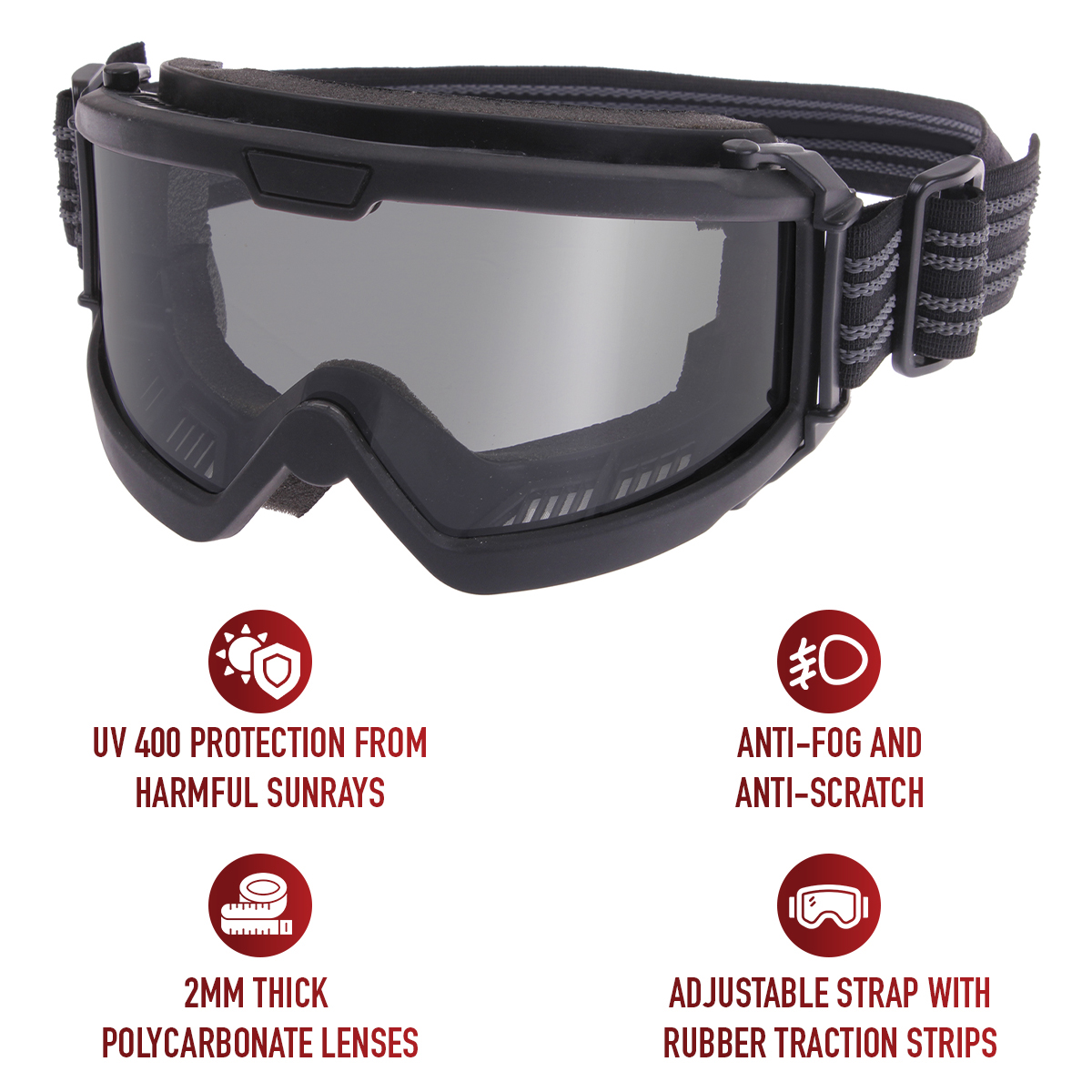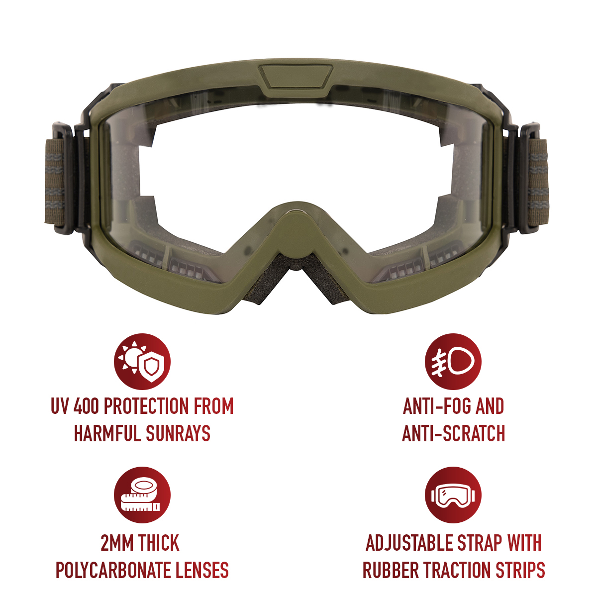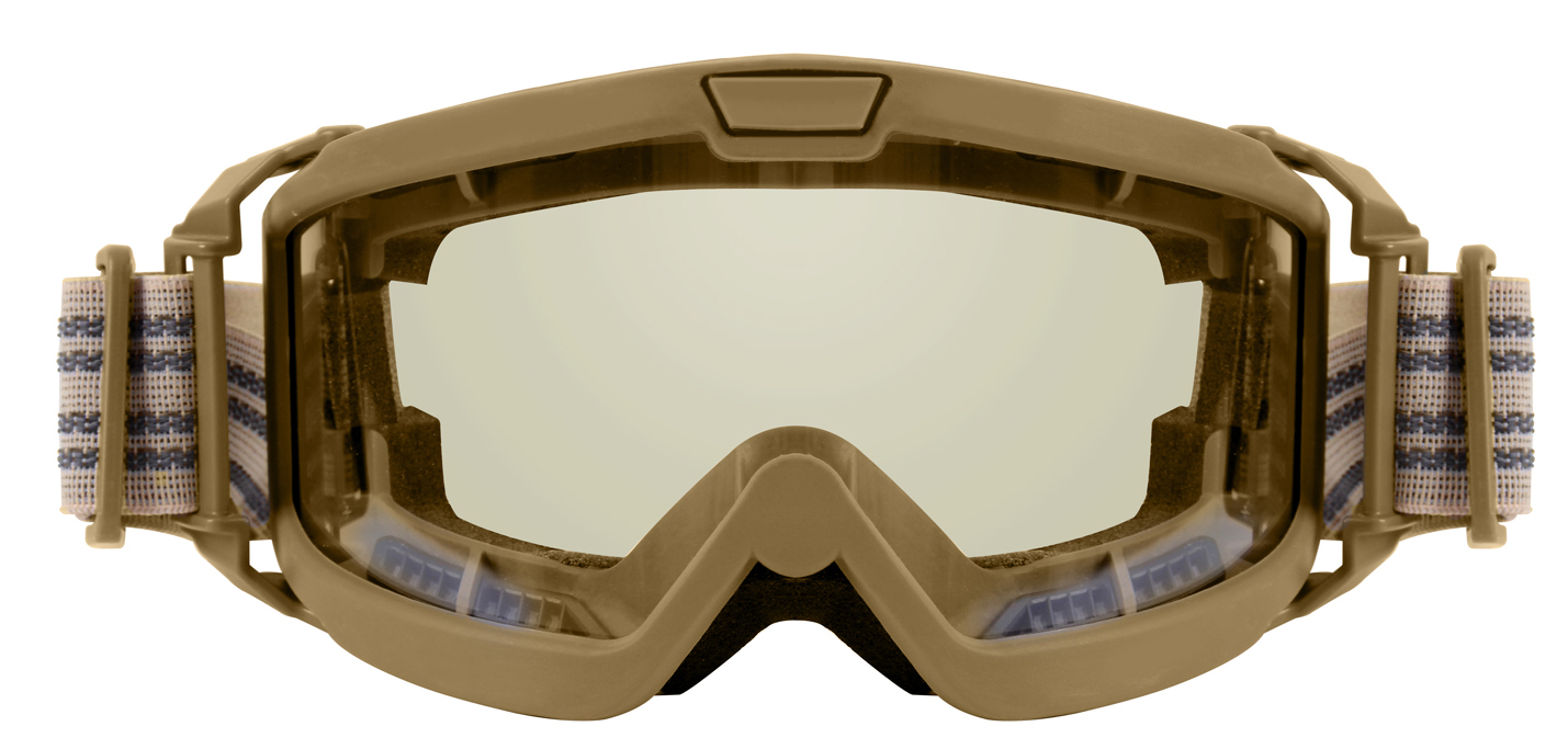 Upgrade your tactical loadout with our ANSI Rated OTG Goggles. From military personnel to shooting sport professionals, the high-performance goggles shield your eyes from dirt and debris while ensuring top-tier impact protection out in the field. The goggles meet ANSI Z87-1 and MIL-DTL-43511D standards. Trust in Rothco's commitment to quality for unparalleled eye protection in challenging environments. Over-The-Glasses Design: These tactical goggles feature a 7/8-inch temple cutout on each side that fits over glasses, sunglasses, and prescription eyewear. The 3/8-inch foam padding creates an additional seal while remaining comfortable against skin. Premium Lens Quality: The tactical OTG goggles come equipped with 2mm thick polycarbonate lenses that offer anti-fog, anti-scratch, and UV 400 protection for years of reliable use in any weather or lighting conditions. The military goggles come with a cleaning cloth and cover. Tactical Utility: The protective goggles feature a dual ventilation system that utilizes top and bottom vents, preventing the lenses from fogging over while delivering optimal airflow for breathability. The movable dynamic hinges and adjustable strap with rubber grip allows you to comfortably wear the airsoft goggles with a variety of tactical helmets while ensuring it stays in place. Ready for Action: Whether you are heading out to the range or out on a mission, the shooting safety goggles are great for tactical operations, field use, airsoft, paintball, shooting competitions, hunting, and other outdoor activities.