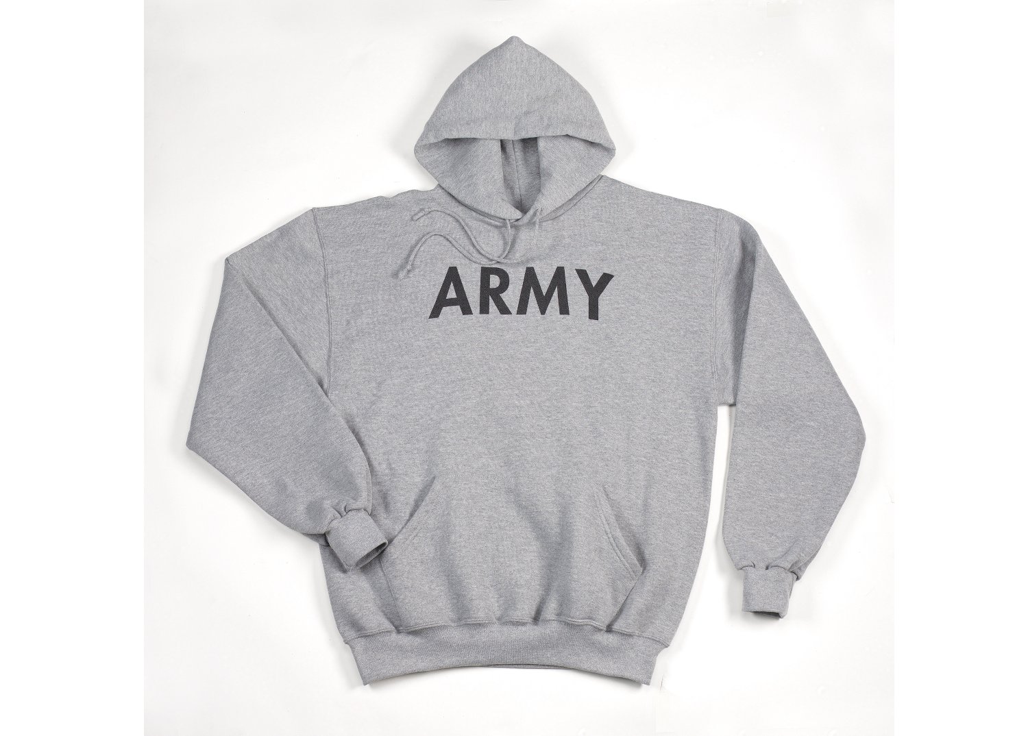 Get ready for an intense workout with Rothco's ARMY PT Pullover Hooded Sweatshirt. Featuring bold ARMY print, pair it effortlessly with Rothco’s Physical Training Sweatpants for a complete ensemble. Crafted from a soft yet durable poly-cotton blend, this sweatshirt offers optimal comfort and performance for athletic wear. The hoodie’s fleece lining ensures warmth during tough workouts and outdoor activities. With a convenient front pouch pocket, it provides easy storage for essentials on the move. Designed with a drawstring hood and elastic wrist cuffs, it offers a snug fit and added protection against the cold. Whether you're hitting the gym or braving the elements, this hoodie is your reliable companion for any physical training regimen.