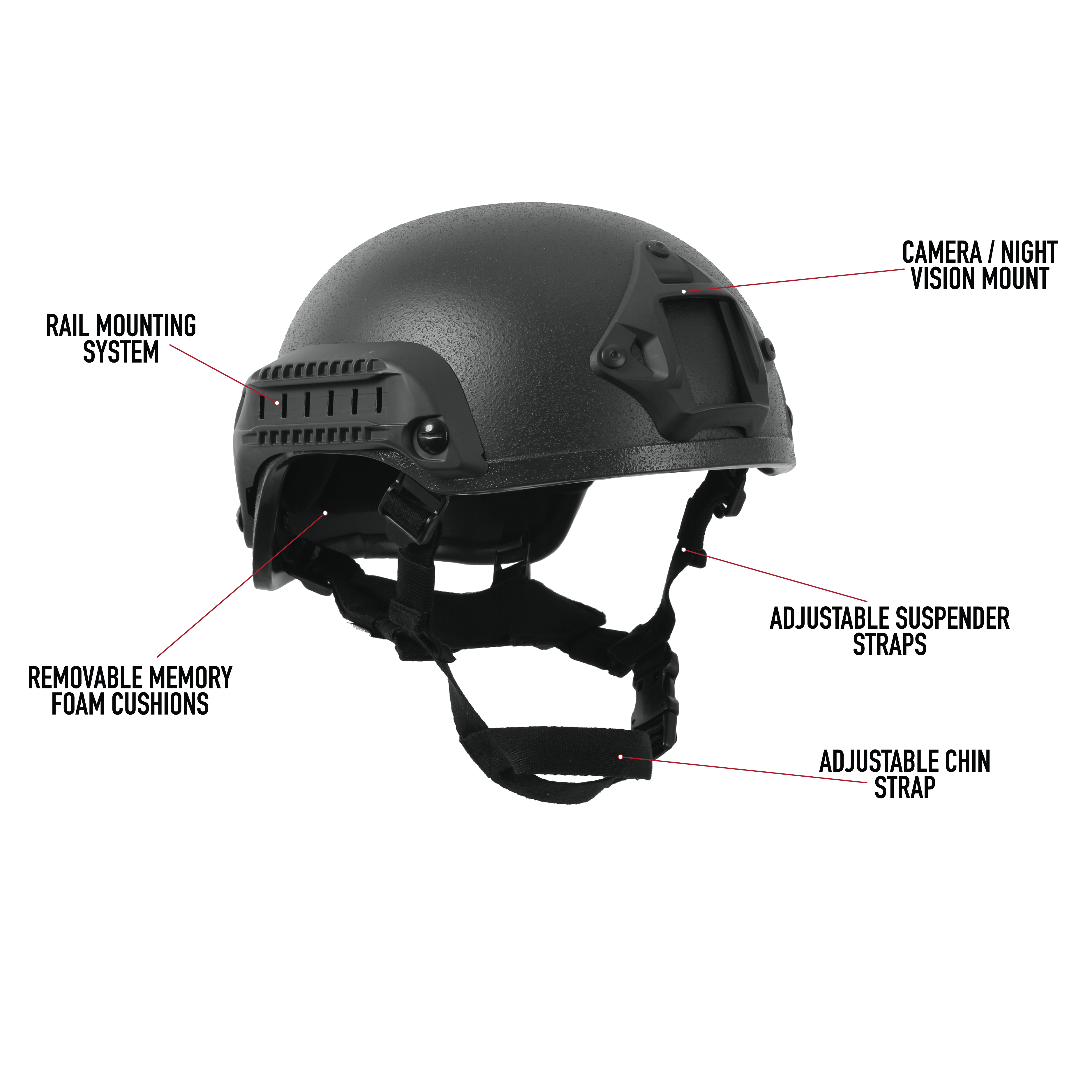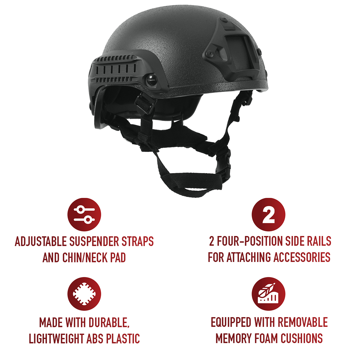 Gear up with Rothco's Base Jump Helmet, crafted from durable yet lightweight ABS plastic. Its construction maintains comfort, with removable memory foam cushions enhancing the wearer's experience. This helmet features two 4-position side rails for accessory attachment, allowing users to customize their gear with lights, cameras, or night vision devices. The adjustable suspender straps and chin/neck pad provide a secure and comfortable fit for all-day wear. Additionally, the helmet comes with a fully customizable 7-piece loop kit with adhesive backing, enabling users to attach patches or illuminators as desired. Perfect for outdoor enthusiasts, this tactical helmet is designed to meet the demands of various activities. One size fits most, ensuring a versatile fit for a wide range of users.