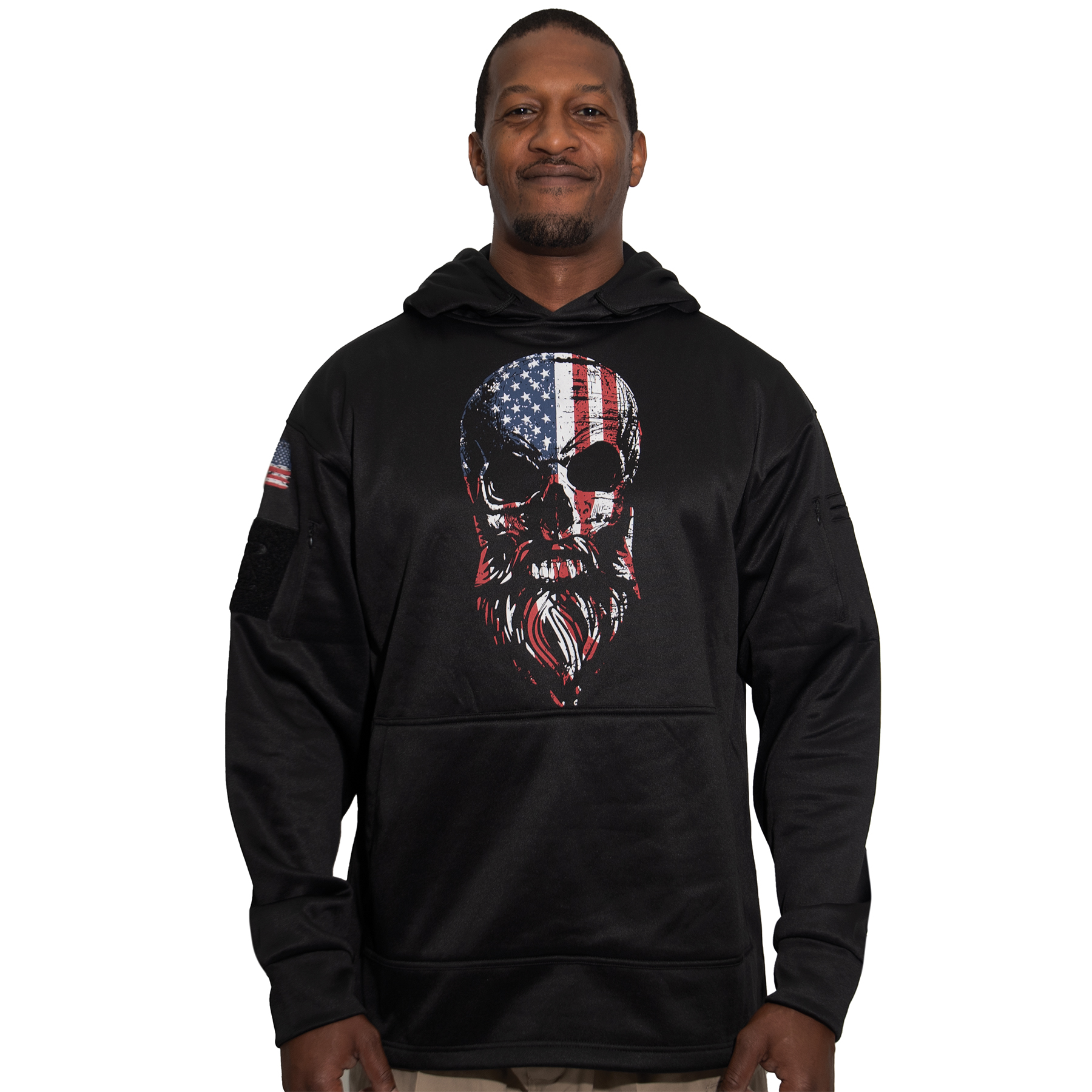 Rothco’s Bearded Skull Concealed Carry Hoodie provides comfortable, stylish, and effective access to your waistband carry weapon with a passthrough kangaroo pocket. This concealed carry sweatshirt features a red, white, & blue bearded skull print on the chest and a red, white, and blue distressed US flag on right shoulder of concealed carry sweatshirt is reverse oriented in accordance with US military regulations. The patriotic sweatshirt is made with a high-performance moisture-wicking composition. The left sleeve features a zippered pocket and two pen pockets, while the right sleeve features an additional zippered pocket and a loop field for mounting flags and morale patches. The cuffs come equipped with thumbholes that provide additional warmth and keep the sleeves from riding up your arms.