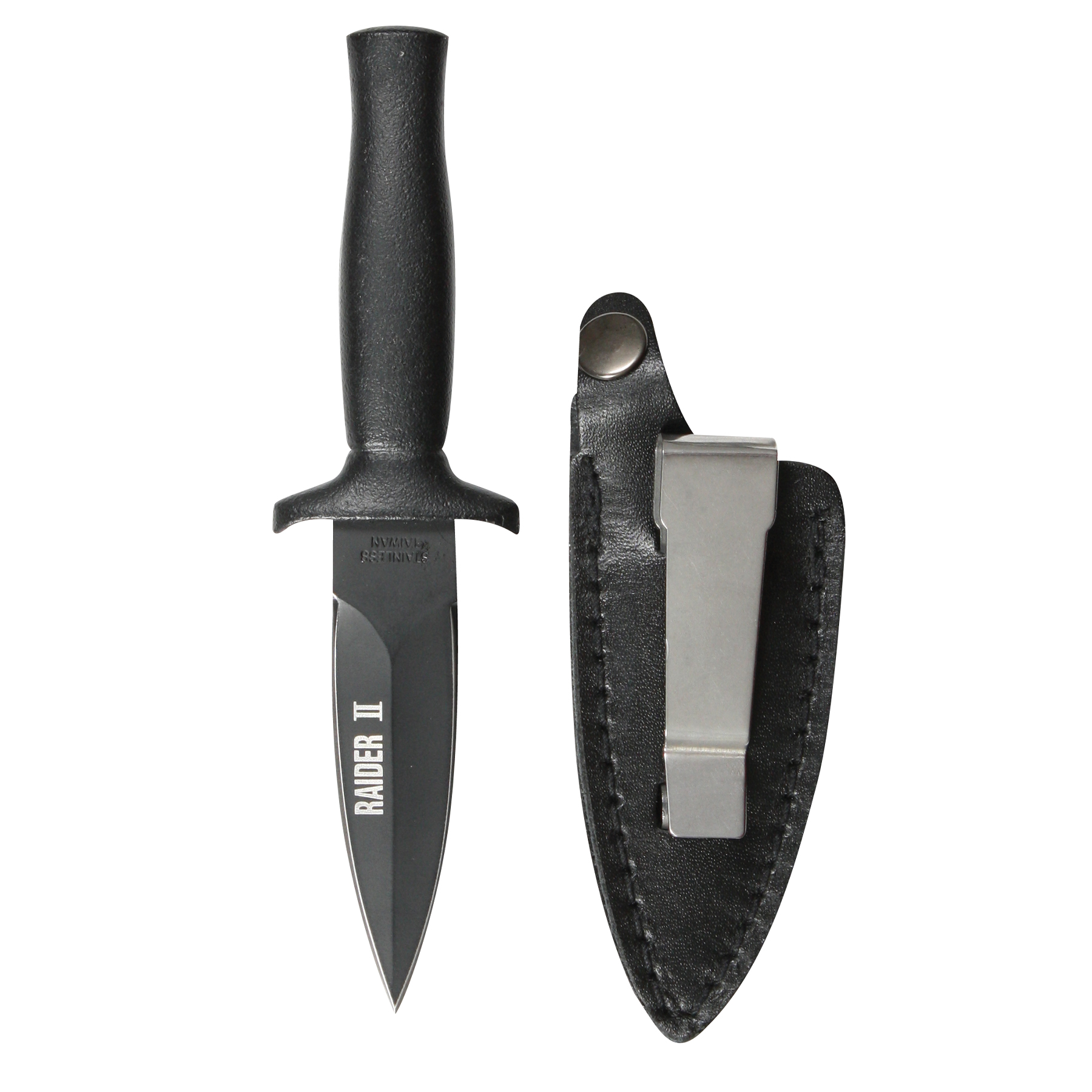 Rothco's Black Raider II Boot Knife is a versatile and reliable tool designed for everyday carry. The tactical knife features a durable 3-inch matte black stainless steel blade, crafted in a classic dagger style for precision and effectiveness. The sleek black finish adds an extra layer of protection against corrosion and wear. The included leather sheath with a clip and snap closure ensures the combat knife is securely stored and easily accessible. This sheath can be conveniently attached to your tactical boot, duty belt, utility pocket, or hiking backpack, making it an ideal choice for those who need a dependable utility knife on the go. The compact design of the Black Raider II Boot Knife, with an overall length of 6 ½ inches, makes it easy to carry without adding unnecessary bulk. Whether you're hiking, camping, or just need a reliable tool for everyday tasks, Rothco's Black Raider II Boot Knife delivers the performance and durability you need.