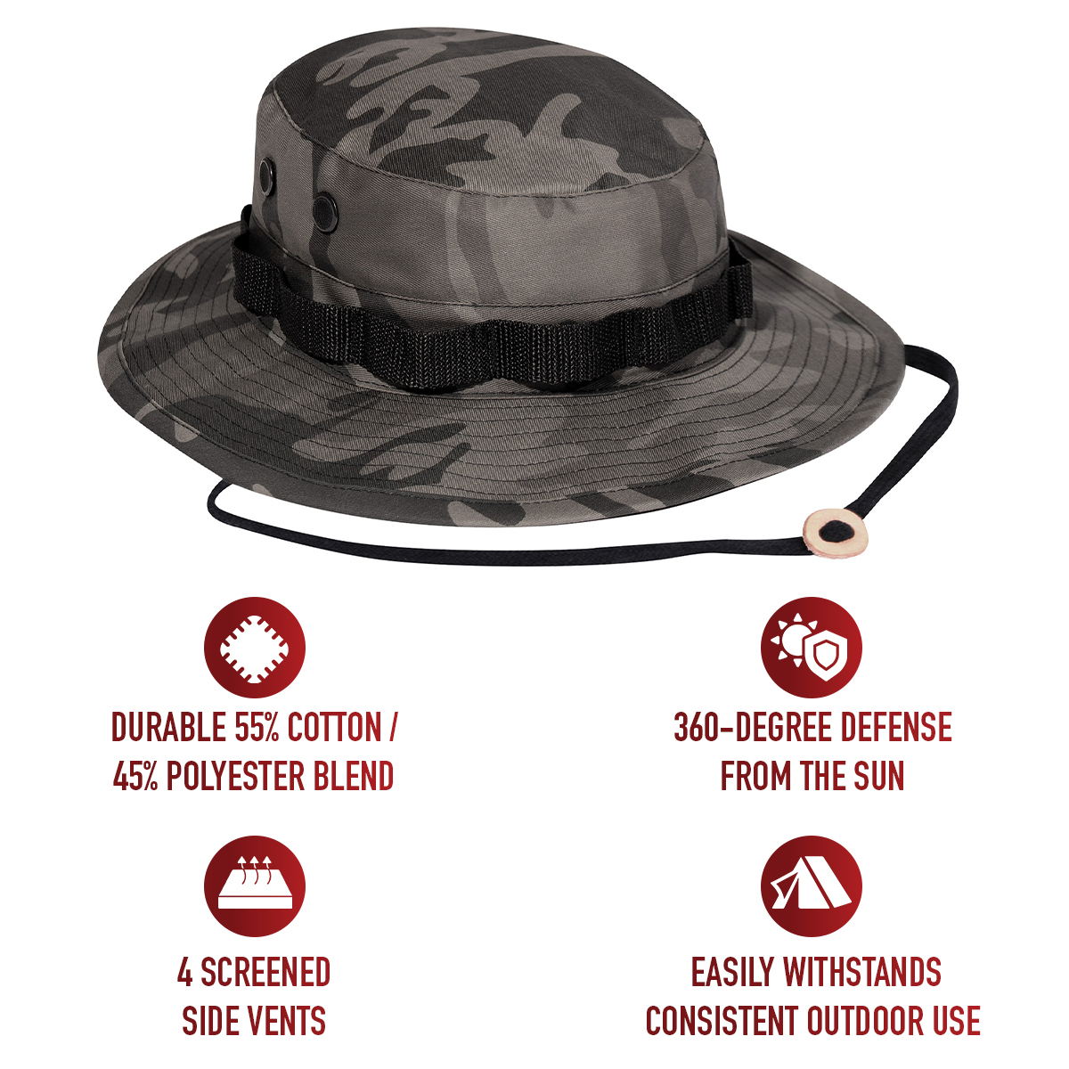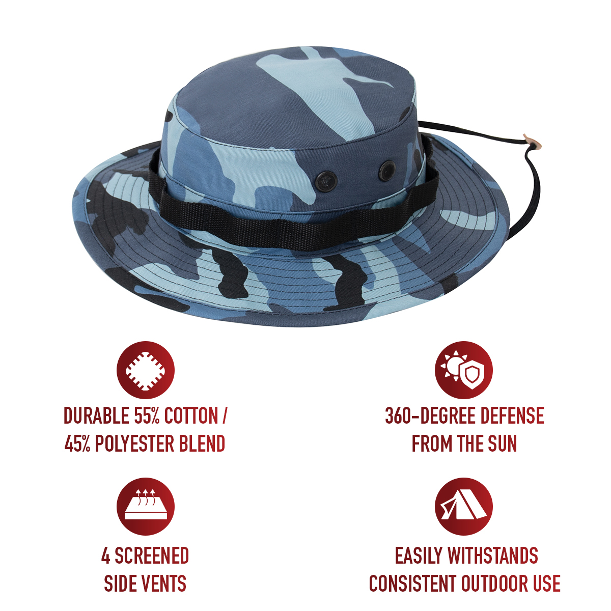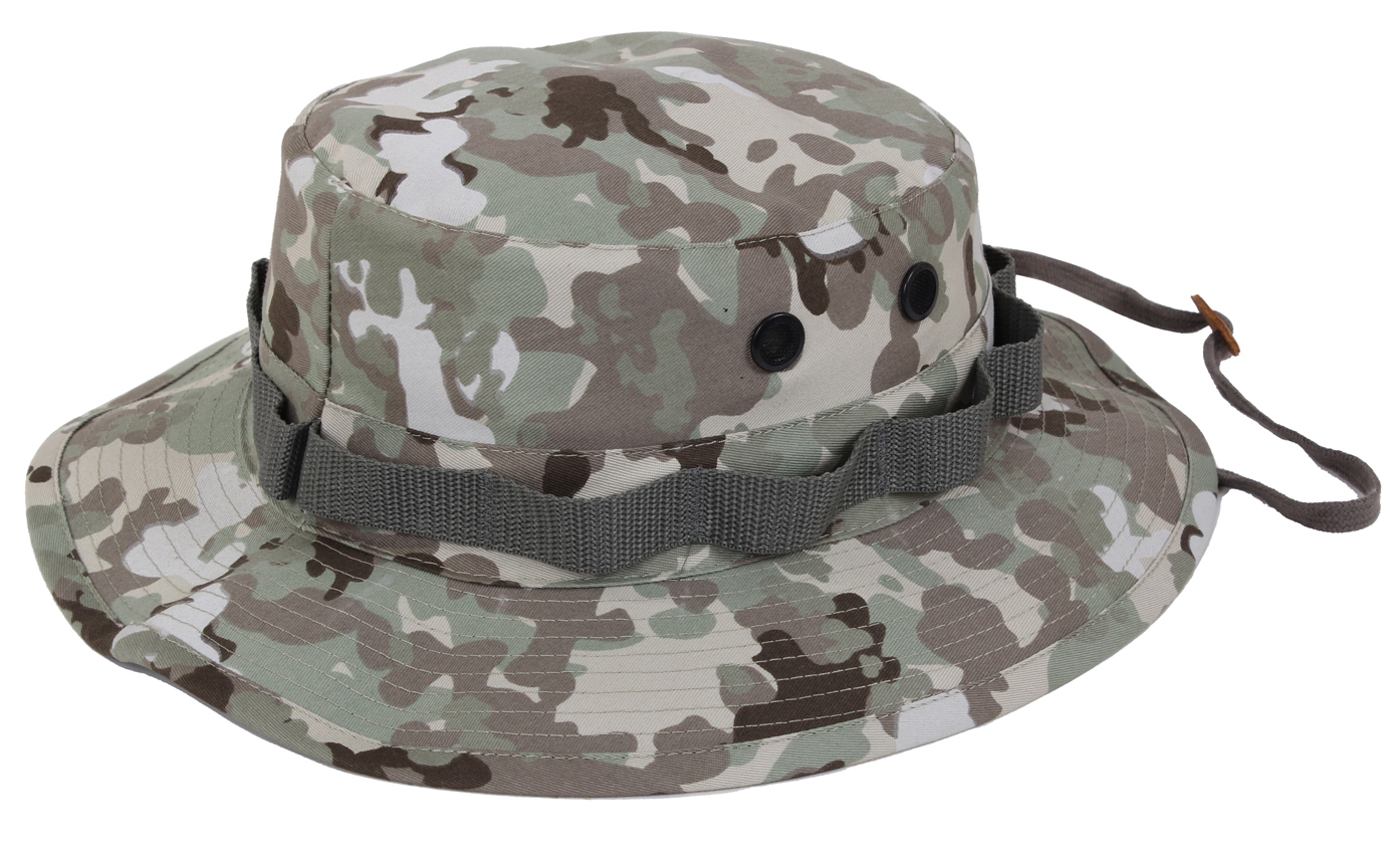 - Go ahead and wear your camouflage boonie hat without a worry! Constructed from a durable 55% cotton / 45% polyester blend, these camo hats easily withstand consistent outdoor use and sun exposure while providing a comfortable fit and feel.