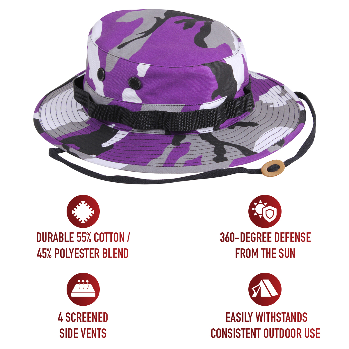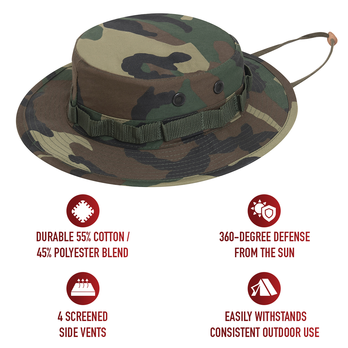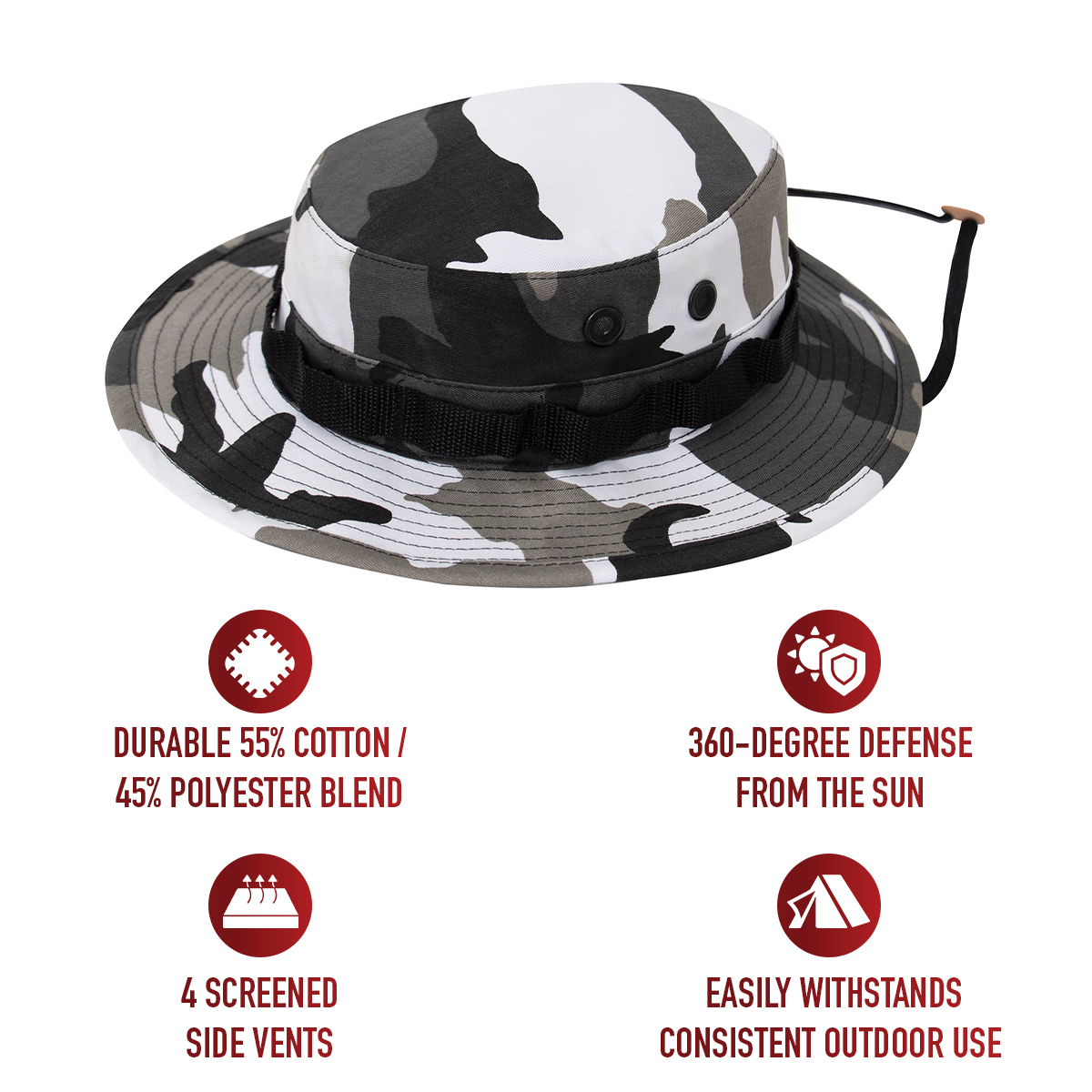 - Go ahead and wear your camouflage boonie hat without a worry! Constructed from a durable 55% cotton / 45% polyester blend, these camo hats easily withstand consistent outdoor use and sun exposure while providing a comfortable fit and feel.