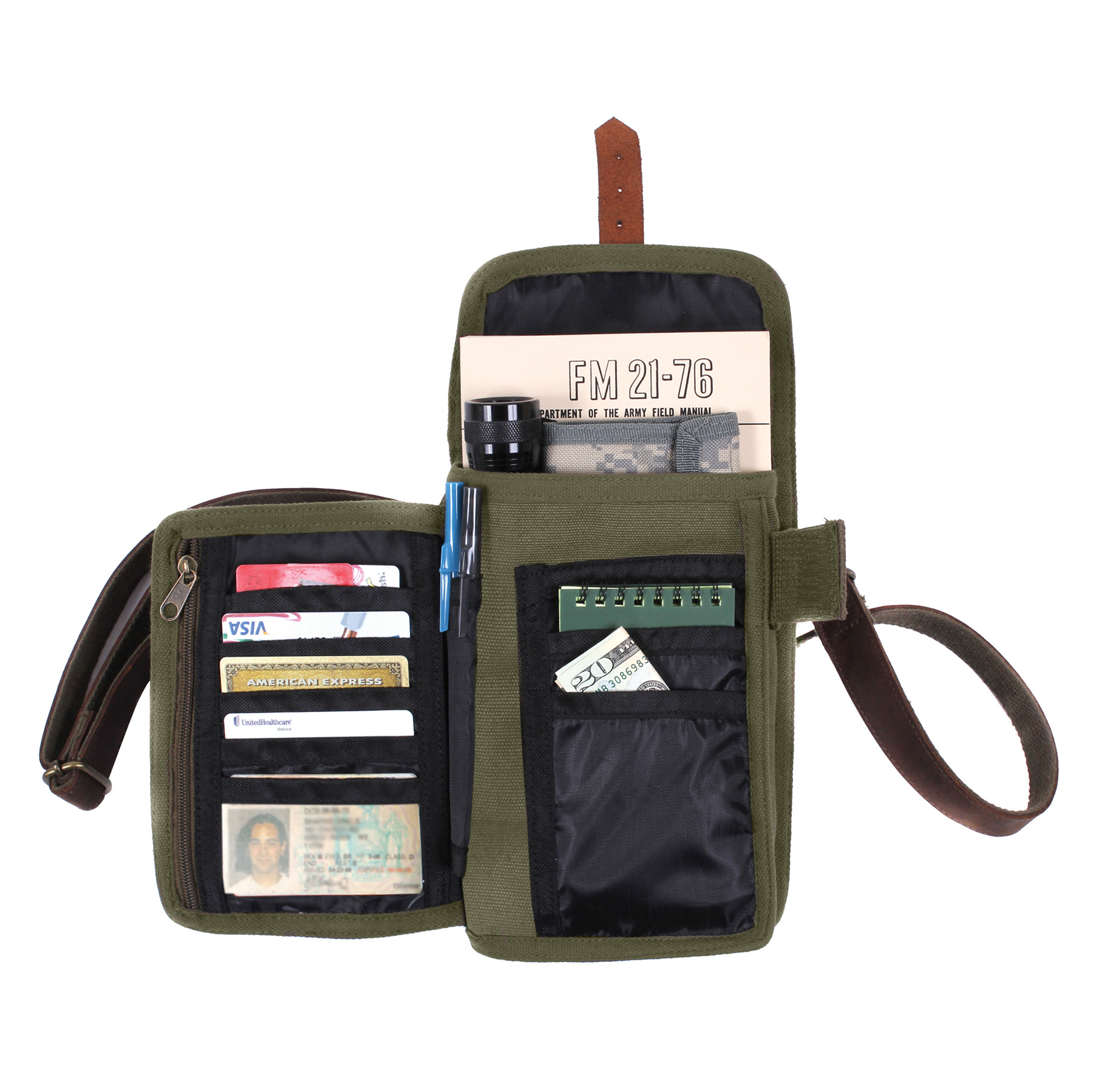 Don't leave home without your Canvas Travel Portfolio Bag! This Every Day Carry Bag (EDC) is perfect for daily errands or your next adventure. It features ample internal storage, including a 7-card organizational compartment and an ID holder. The large main compartment has hidden map and document holders, while the front pocket securely holds essentials with a hook and loop closure. Comfortably sized at approximately 8.5 inches x 6.25 inches x 2 inches, it can be worn over the shoulder or cross-body with its fully adjustable and detachable shoulder strap. The bag is made of heavyweight, durable cotton canvas with leather and metal accents, ensuring longevity. It's also nylon-lined for added durability while traveling and includes internal pen or pencil holders and two side organizational pockets. The improved leather closure strap keeps the front flap securely in place, while the back belt loop provides additional security and stability during travel. Made from Rothco’s durable heavyweight canvas fabric, this superior material is naturally water-resistant, rugged, and is built for the long haul. No one comes close to Rothco’s collection of ultra-premium canvas bags and packs.