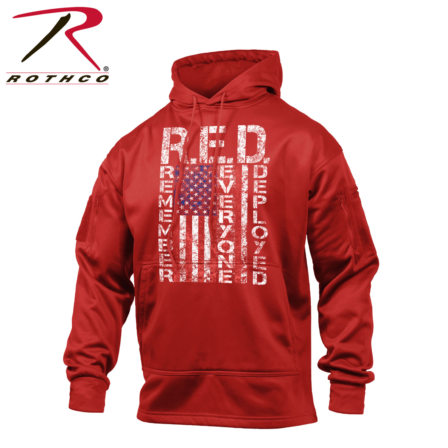 Rothco’s R.E.D. (Remember Everyone Deployed) Hoodie combines functionality with a heartfelt message of solidarity. Featuring the R.E.D. graphic on the front, this hoodie honors and supports deployed service members. Designed for practicality, the kangaroo pocket includes an internal access point. The right sleeve showcases a US flag graphic with stars facing forward, echoing a uniform. Additional features include zippered pockets on both sleeves, pen slots, and a loop field for patches. The left sleeve also has a wire passthrough port for your headphones. Thumb holes in the cuffs keep the sleeves in place and offer extra coverage. Made from high-performance moisture-wicking material, this hoodie ensures you stay comfortable and dry. The drawstring hood adds to the overall functionality and style, making this sweatshirt a perfect blend of utility and tribute.