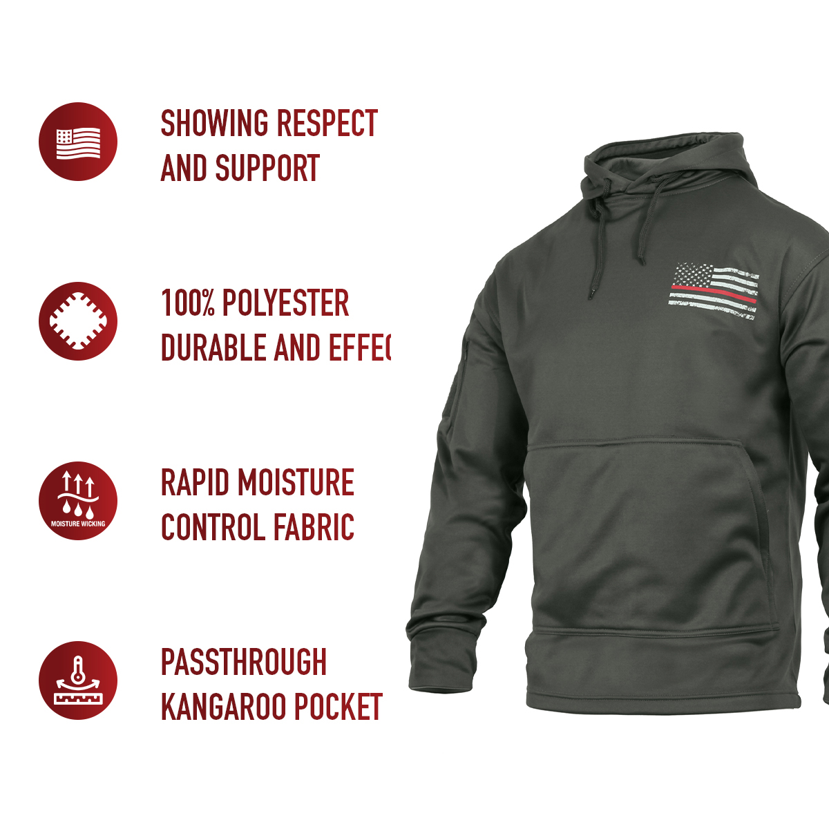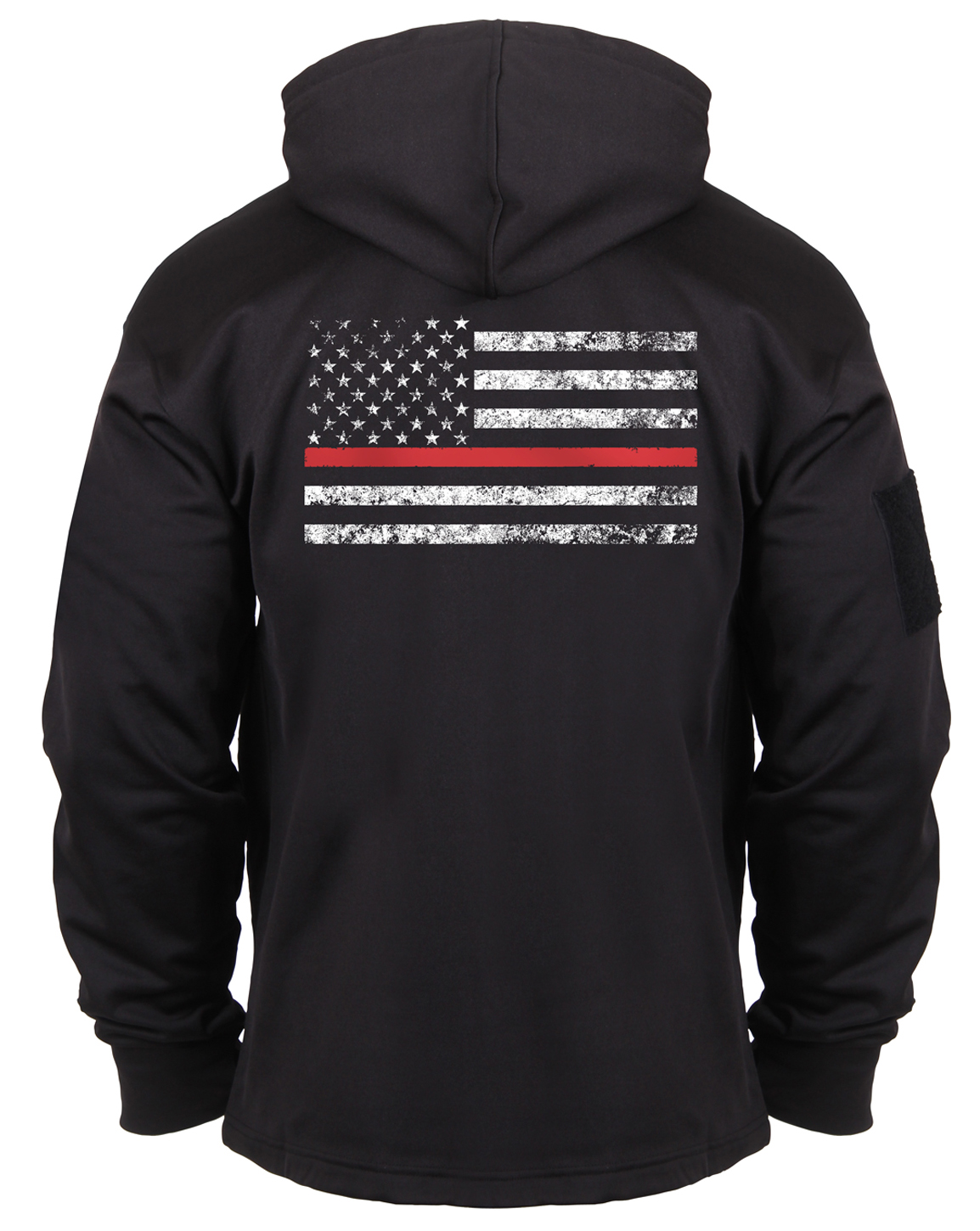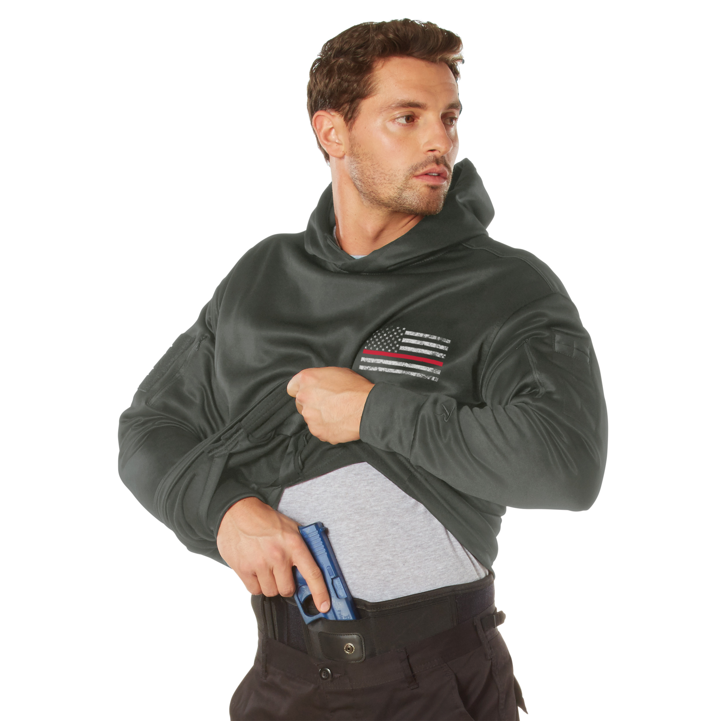 Our Concealed Carry Thin Red Line Hoodie features a distressed American Flag graphic on the left chest and across the back, showing respect and support for police and law enforcement officials.
