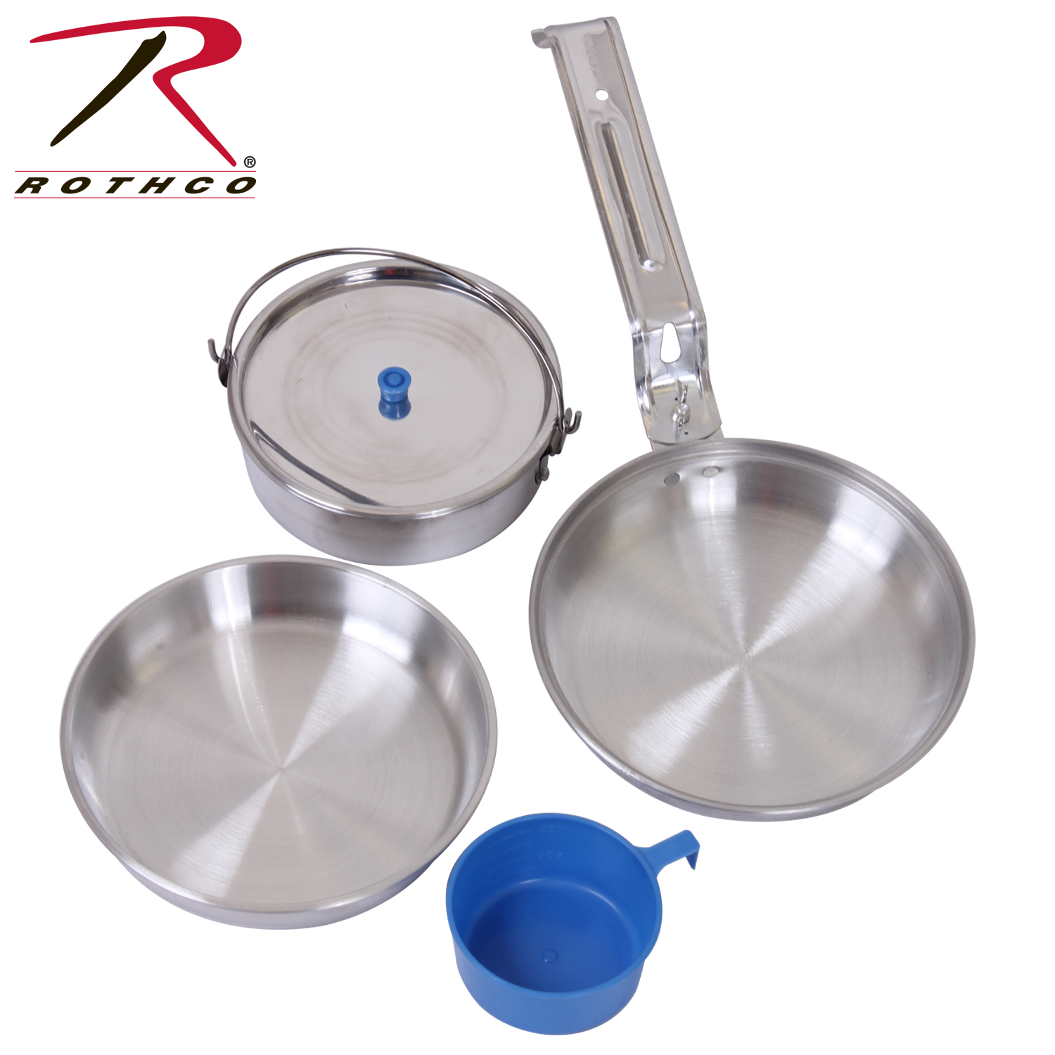 Rothco Deluxe 5 Piece Mess Kit features a heavy gauge polished aluminum for maximum durability and convenient carry. The kit contains a frying pan with handle, saucepan, lid, plate and plastic cup, that conveniently packs away into one piece and features a stay-cool handle.