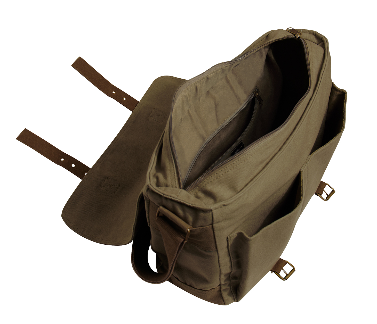 Rothco’s Vintage Unwashed Canvas Messenger Bag Is Designed To Be Your Dependable On The Go Courier. The Heavyweight Cotton Canvas Messenger Bag’s Features Double Stitched Construction For Long Lasting Durability. Measuring 15.5" X 11" X 5", The Spacious Main (Lined?) Compartment With Full Zipper Closure Provides Plenty Of Room To Store Books, Folders, A Small Laptop, And Many Other Items. The Main Compartment Features An Additional Small Zippered Pocket (7” X 9”) Two Open Top Front Pockets Located Under Front Flap Closure Allow For Quick And Easy Access To Essential Gear Such As Your Cell Phone. The Bag Is Equipped With Dual Adjustable Brown Canvas Strap Closures With Brass Buckle Hardware. With An Adjustable Padded Brown Canvas Shoulder Strap That Can Extend Up To 52”, You Can Carry Your Military Messenger Bag Across Your Body, Over Your Shoulder, Or In A Variety Of Ways That Best Suits Your Style.