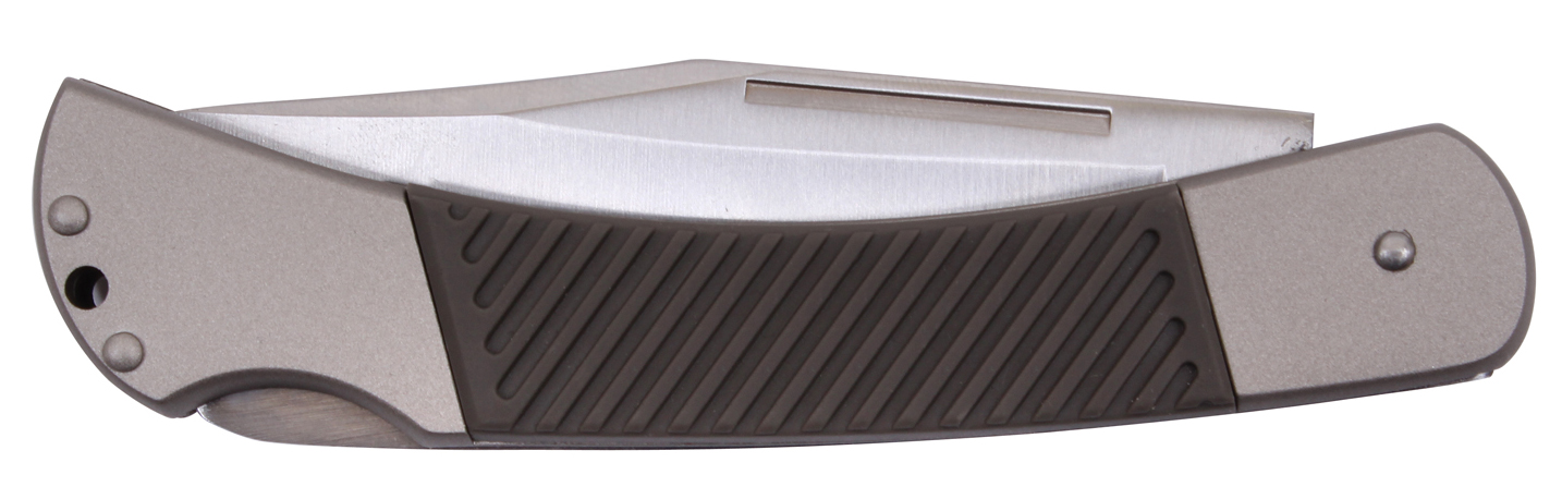 he Rothco Folding Pocket Knife combines classic style with reliable performance. This buck-style folding knife measures 8.5" in length and features a durable 3.5" stainless steel non-serrated blade with a 1/8" thickness for precision cutting. Designed for convenience, the knife includes a secure push-button closure, a 2.5" ergonomic grip for comfortable handling, and a keyhole at the bottom for easy attachment. Perfect for outdoor enthusiasts, tactical professionals, or everyday carry needs.