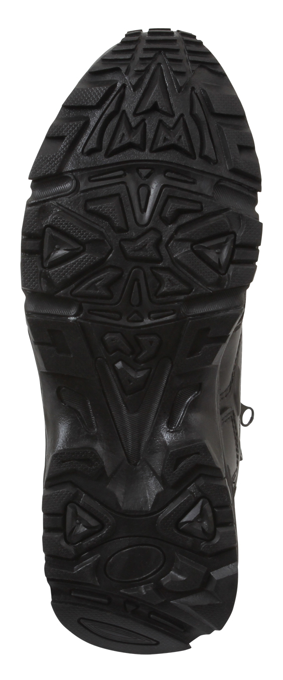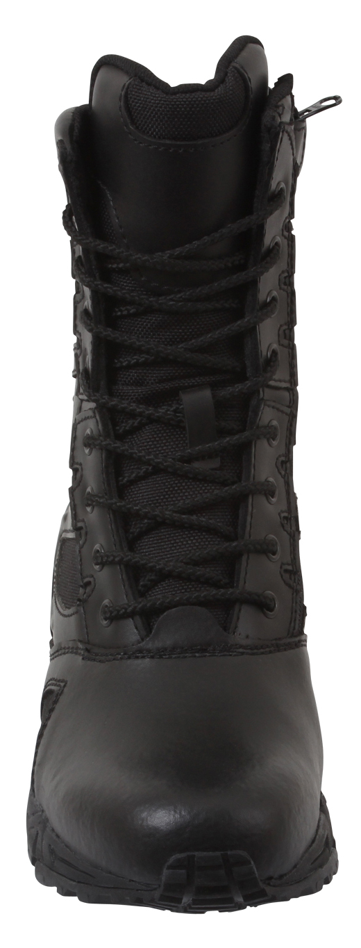 Engineered for comfort and built for action, Rothco’s Forced Entry Deployment Boots with Side Zipper deliver the support, durability, and quick on/off access you need in the field. These 8-inch tactical boots are ideal for military personnel, law enforcement, security professionals, and outdoor adventurers, offering a running shoe feel with rugged duty boot performance. Duty-Ready Performance: Designed for all-day wear, these 8-inch tactical deployment boots combine the lightweight comfort of a running shoe with the rugged durability required for military personnel, law enforcement, and security operations. Superior Traction: The tactical uniform boots feature a slip-resistant mountaineer rubber outer sole that delivers improved grip and traction across a variety of terrain, keeping you stable whether you're on patrol or in the field. Quick Access: A convenient side zipper with hook & loop tab allows for fast removal or entry without unlacing, making these duty boots ideal for rapid response scenarios. Breathable Support for Long Days: Constructed with durable nylon / leather uppers and breathable mesh panels, these 8-inch tactical boots keep your feet cool and dry. The cushioned EVA midsole, steel shank, and padded collar offer superior arch and ankle support for extended wear. Secure Fit: The side zip boots feature a rustproof eyelet lacing system that ensures a tight, customized fit that stays in place throughout intense activity, enhancing support and stability.