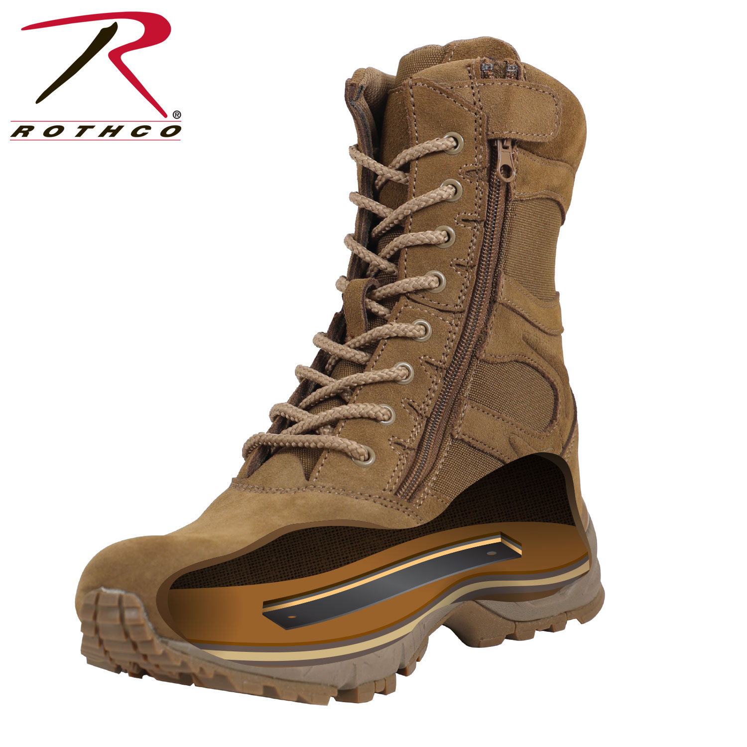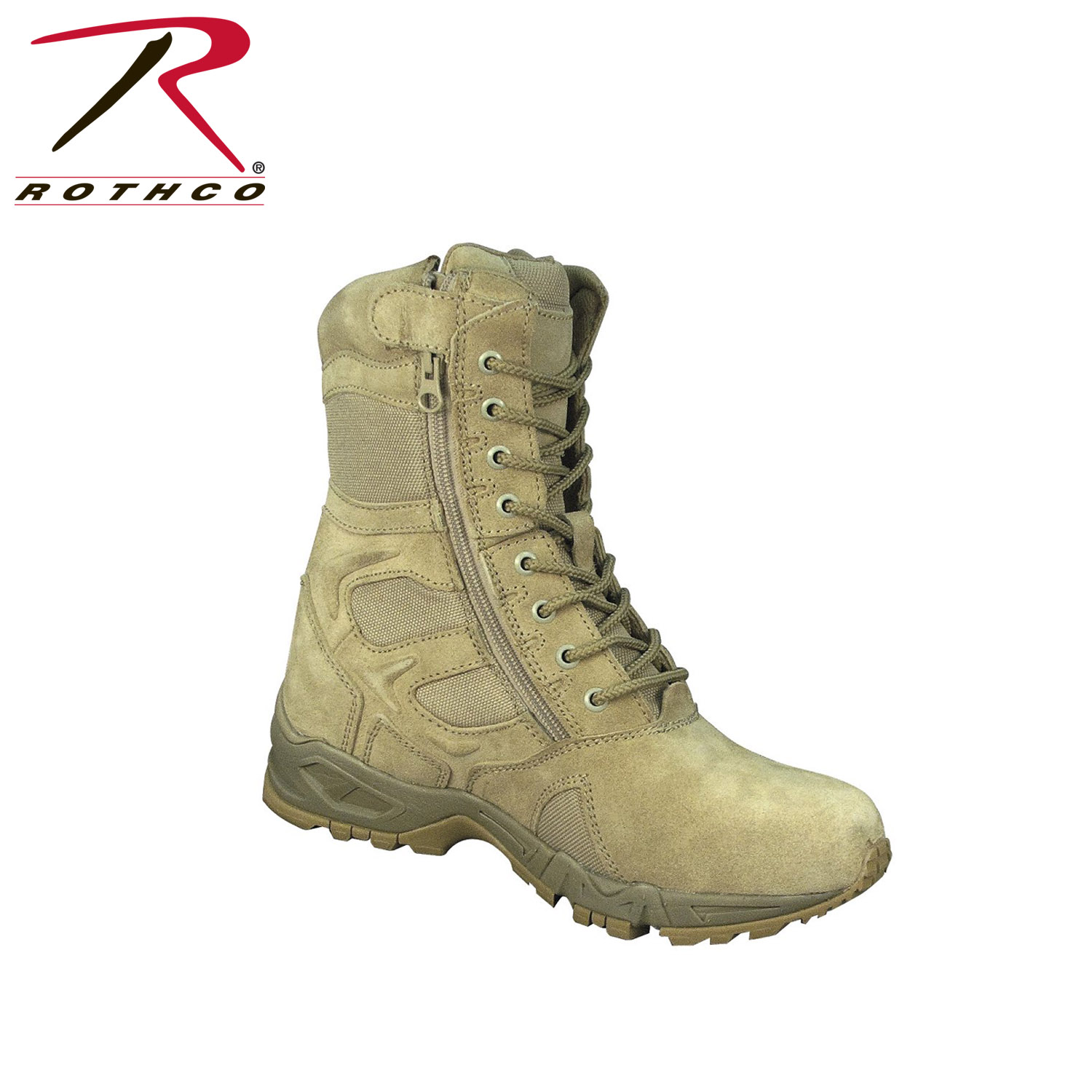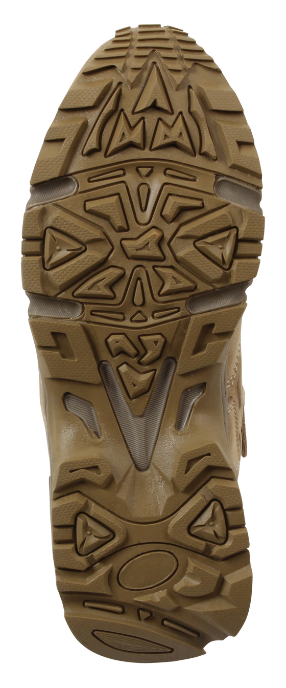 Experience unmatched comfort and efficiency with Rothco's Forced Entry 8-inch Deployment Boots. These boots combine the comfort of a running shoe with the durability of an active-duty boot. The mountaineer rubber outsole enhances traction for smooth movement. Save time with the side zipper closure and hook-and-loop tab, eliminating the need to tie and untie laces. The rustproof eyelet lace system keeps your tactical boots securely in place. Constructed with denier nylon, suede leather, and breathable mesh, these boots keep your feet cool and dry. The padded collar ensures a comfortable fit, and the EVA midsole and steel shank provide extra support. Elevate your tactical experience with Rothco's premium deployment boots. Designed with precision and built to withstand the harshest conditions, Rothco's collection of footwear and accessories combines durability, functionality, and unparalleled performance. From our Forced Entry Series which features our speedlace and waterproof technologies, to our V-Max Collection designed with lightweight running shoe soles, our diverse range of footwear provides unmatched comfort and protection for everyone from active-duty personnel to outdoor enthusiasts. With a rich heritage spanning over 7 decades, Rothco is the go-to brand for all things that keep you standing on your feet.