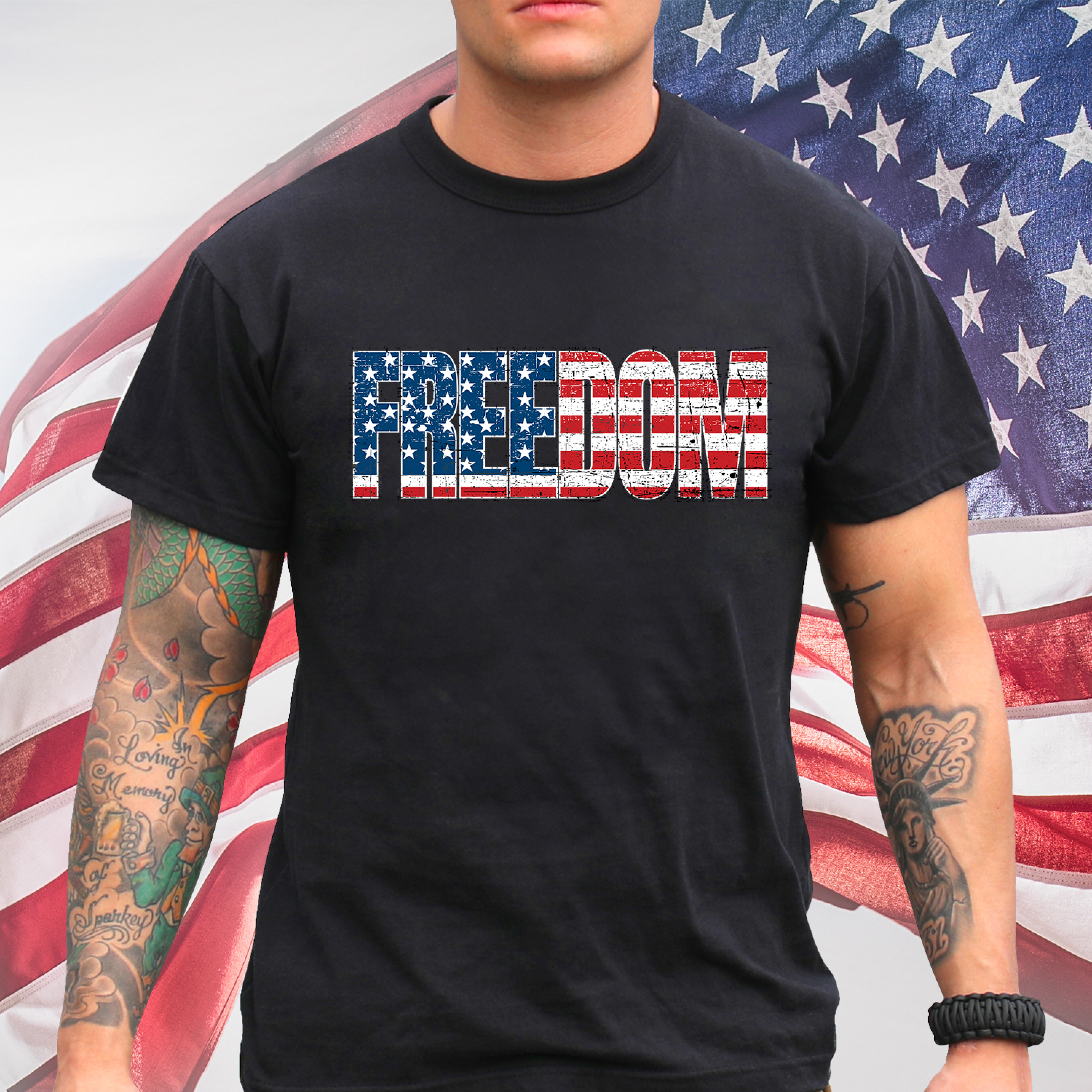 Fly your flag high and show your American spirit with our Freedom US Flag T-Shirt! This patriotic, military style shirt features a graphic design on the front with bold lettering containing a distressed American flag inside. Reliable and Long-Lasting: The breathable cotton fabric easily withstands strenuous activities while remaining soft and comfortable. For added durability, these graphic t-shirts feature a ribbed collar, tag-less neck label, and reinforced seams at the sleeves and bottom hem. Standard Fit: The short sleeve military t-shirt is designed with a standard fit, giving you room and flexibility for any activity. The crew neck shirt sits approximately at the waist for full coverage and comfort. Land of the Free: Whether you’re out on a weekend trip or casually walking around town, these print shirts are great for outdoor adventures, the gym, everyday use, and more. We’ve Got You Covered: Pair your patriotic tee with one of our Tactical BDU Cargo Pants or Vintage Paratrooper Cargo Shorts.