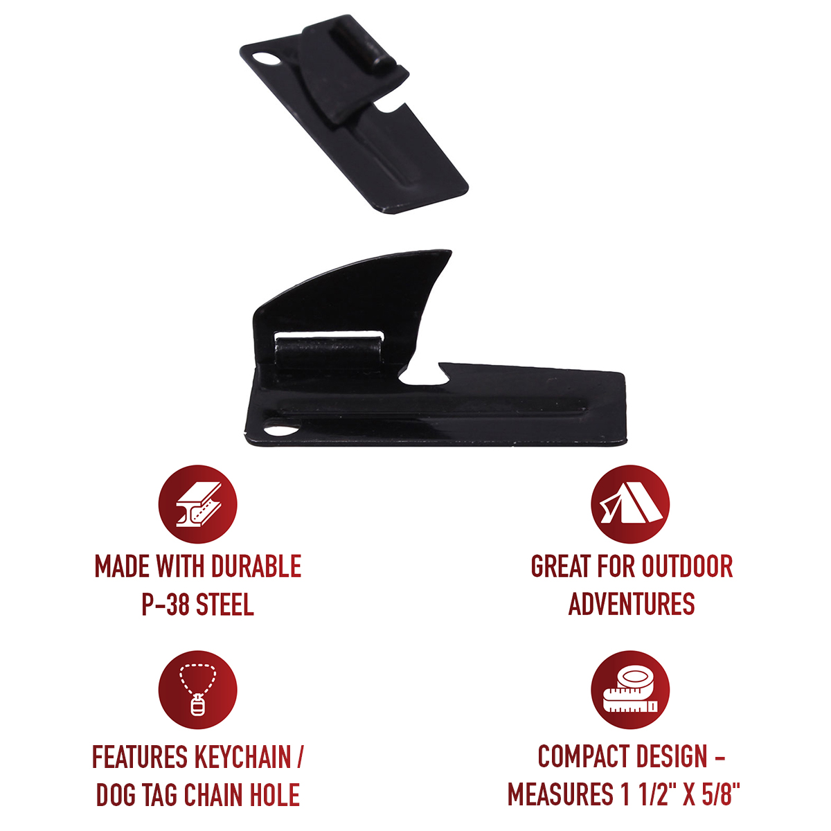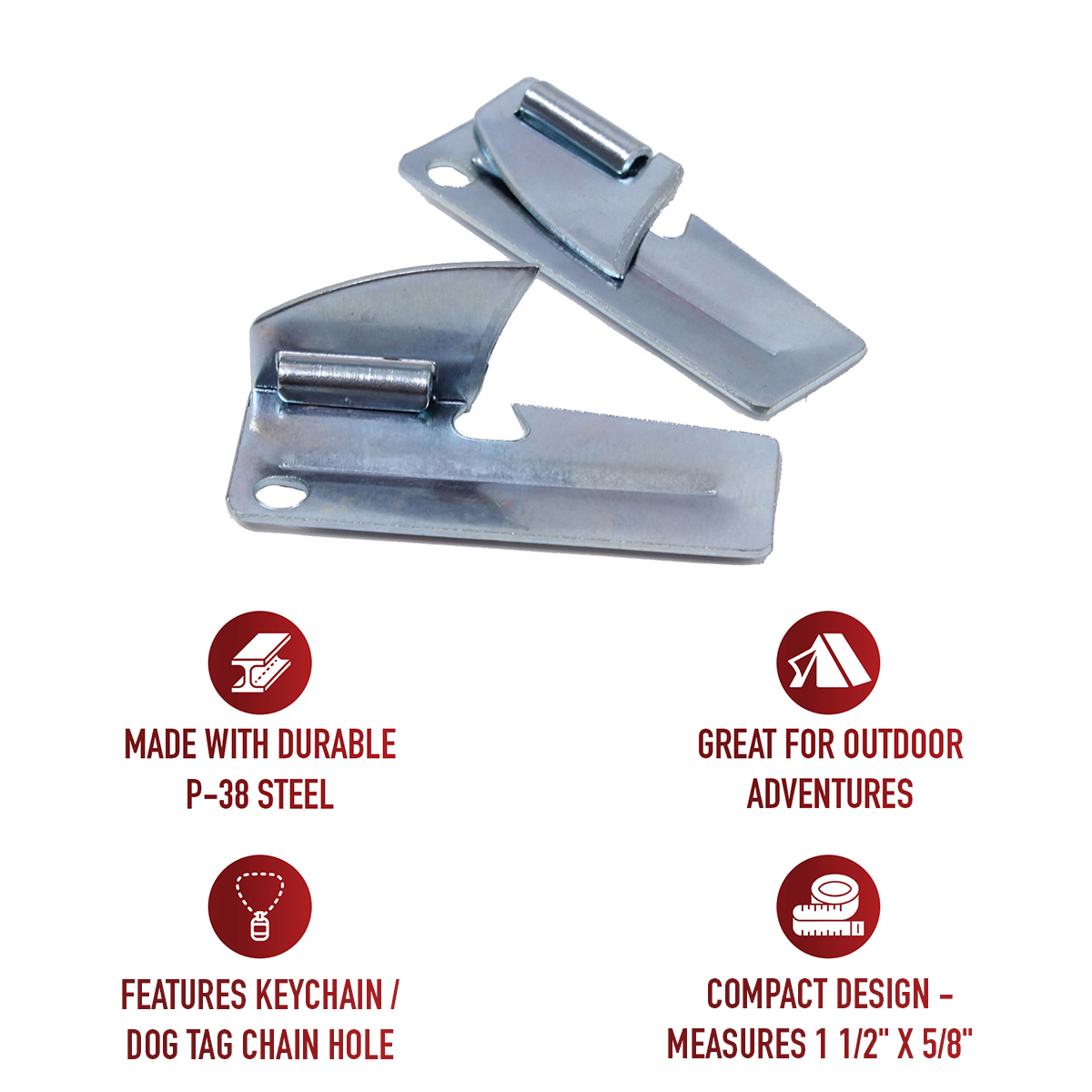 Rothco's P-38 Can Opener is an essential tool for survival. This government-issue steel opener, known as the "John Wayne Can Opener," is compact, measuring just 1.5 inch x 5/8 inch, making it easy to carry in your pocket or survival kit. It features a convenient keychain/dog tag chain hole for quick access and portability. With its MIL-J-0837 engraving, you can trust in its authenticity and quality. This versatile tool has been used by generations of active-duty personal and is perfect for camping, hiking, emergency preparedness, and everyday use. Add the P-38 Can Opener to your kit and be prepared for any situation.