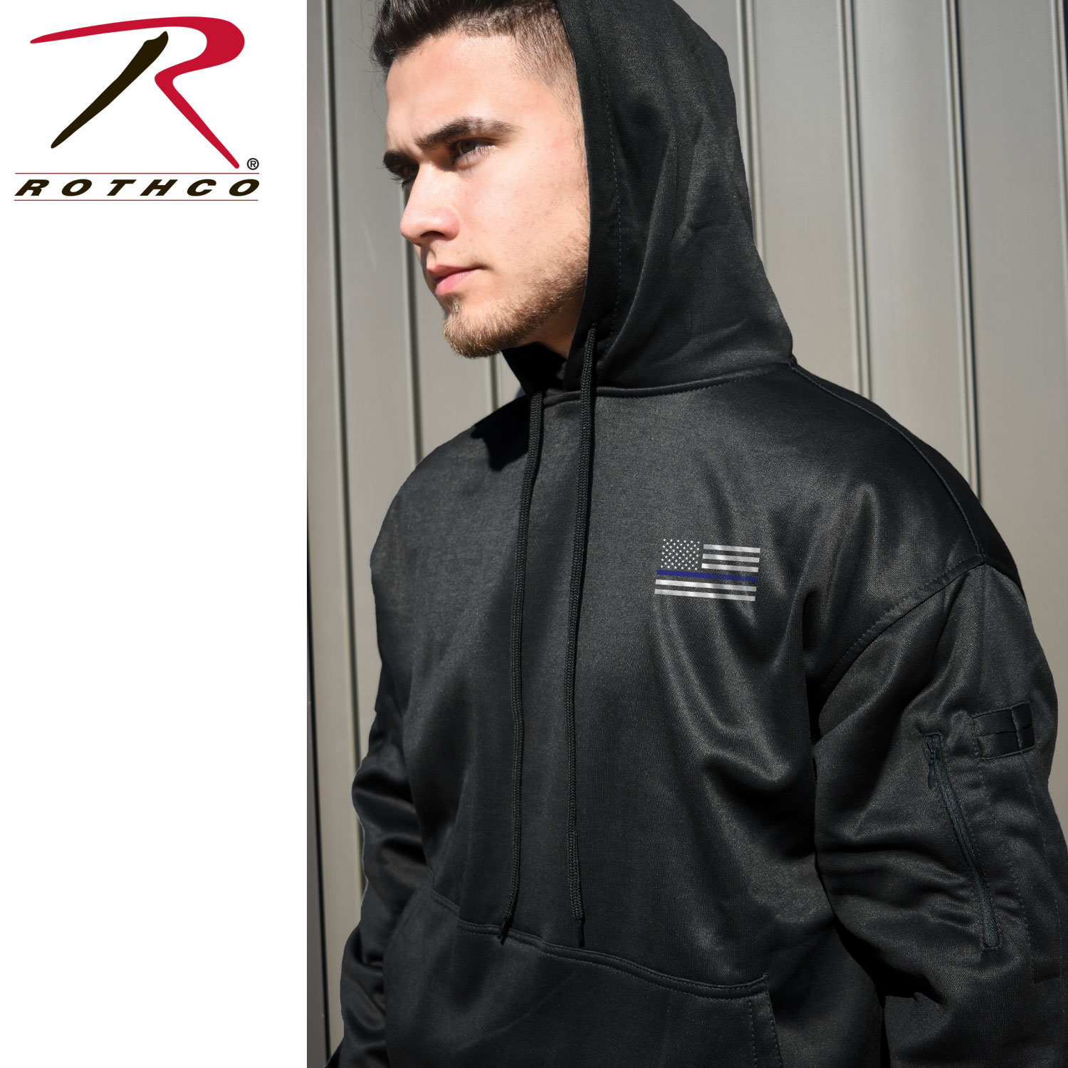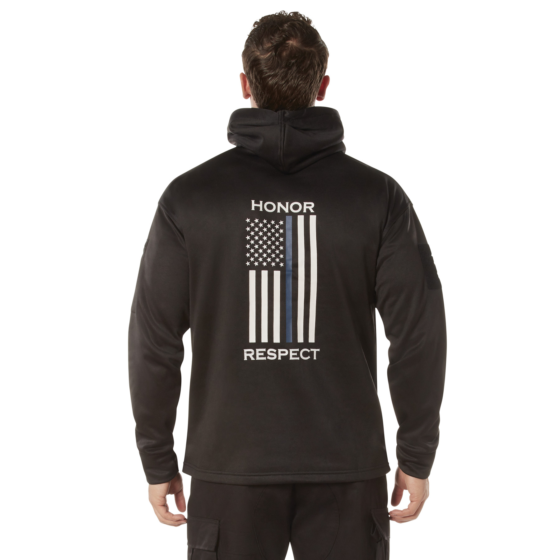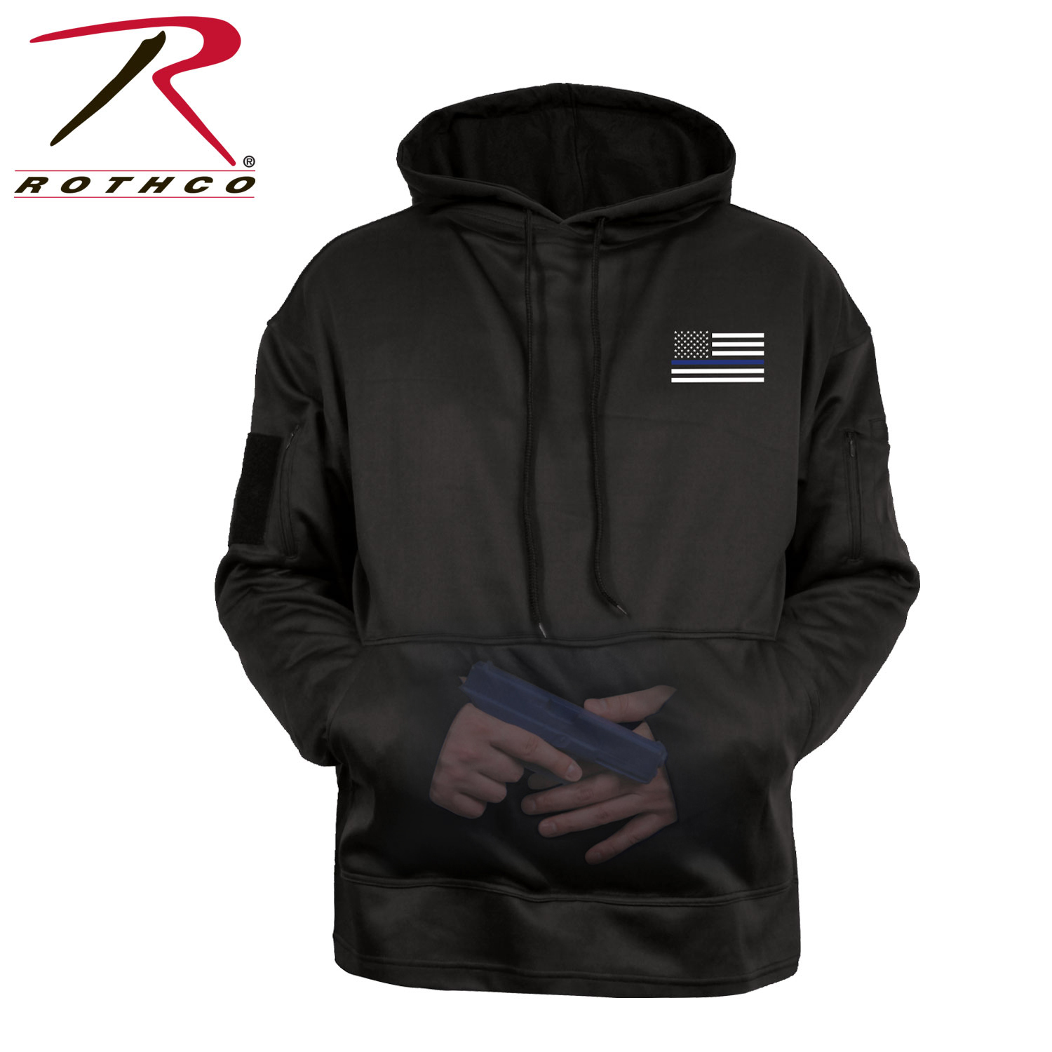 Rothco’s Honor and Respect Thin Blue Line Concealed-Ops Hoodie featurs Thin Blue Line flag graphics on the front and back, this hoodie combines style, functionality, and comfort. The large pass-through kangaroo pocket provides easy access to a waistband holster or appendix carry. Zippered pockets on both sleeves offer additional storage, with a loop patch on the right sleeve and 2 pen pockets on the left. The zippered left sleeve pocket includes a wire pass-through port for headphones. Thumb holes in the cuffs add extra coverage and prevent the sleeves from riding up. Made from a comfortable, moisture-wicking performance material, this hoodie is perfect for daily wear. Proceeds from this purchase benefit families of fallen first responders, allowing you to show your support while making a difference.