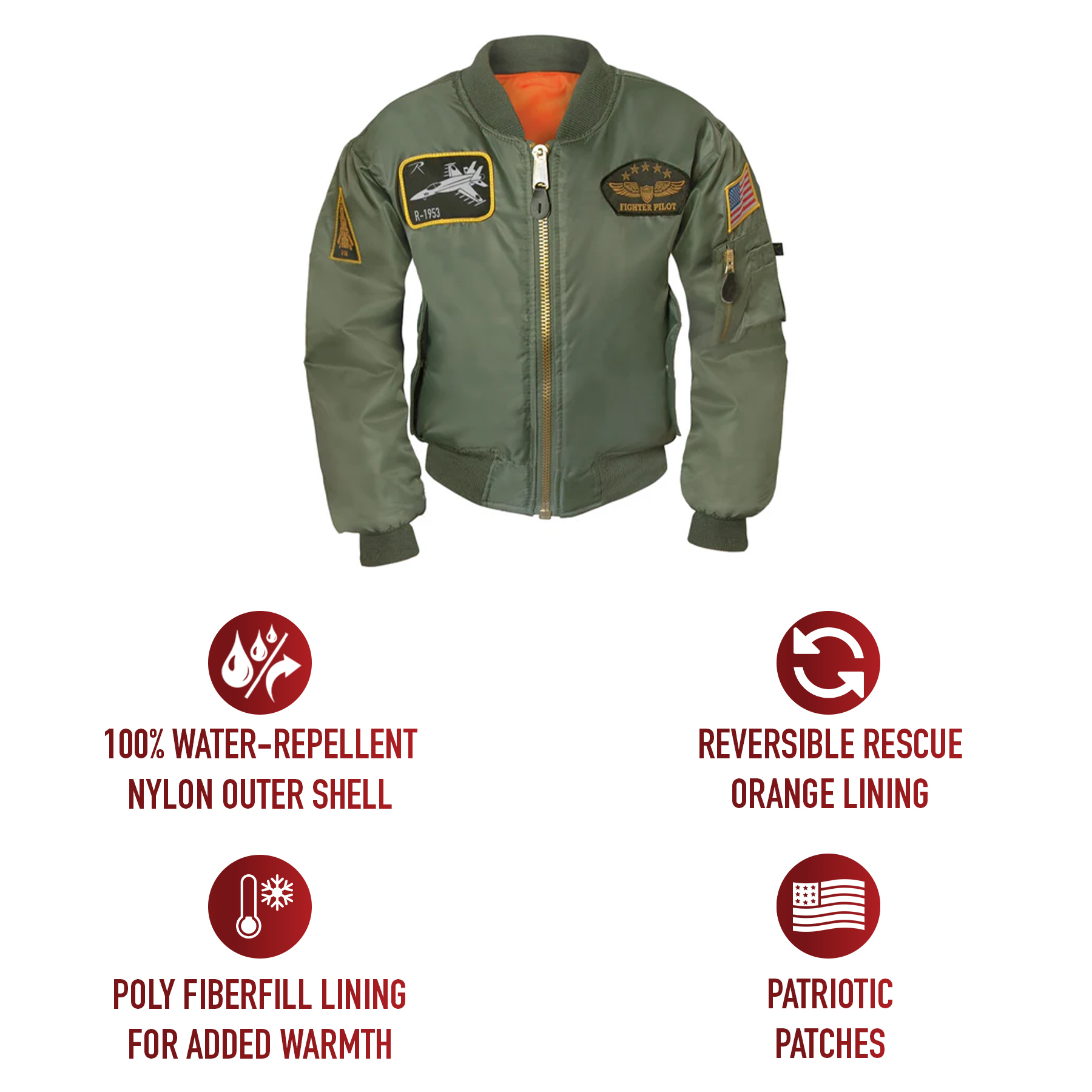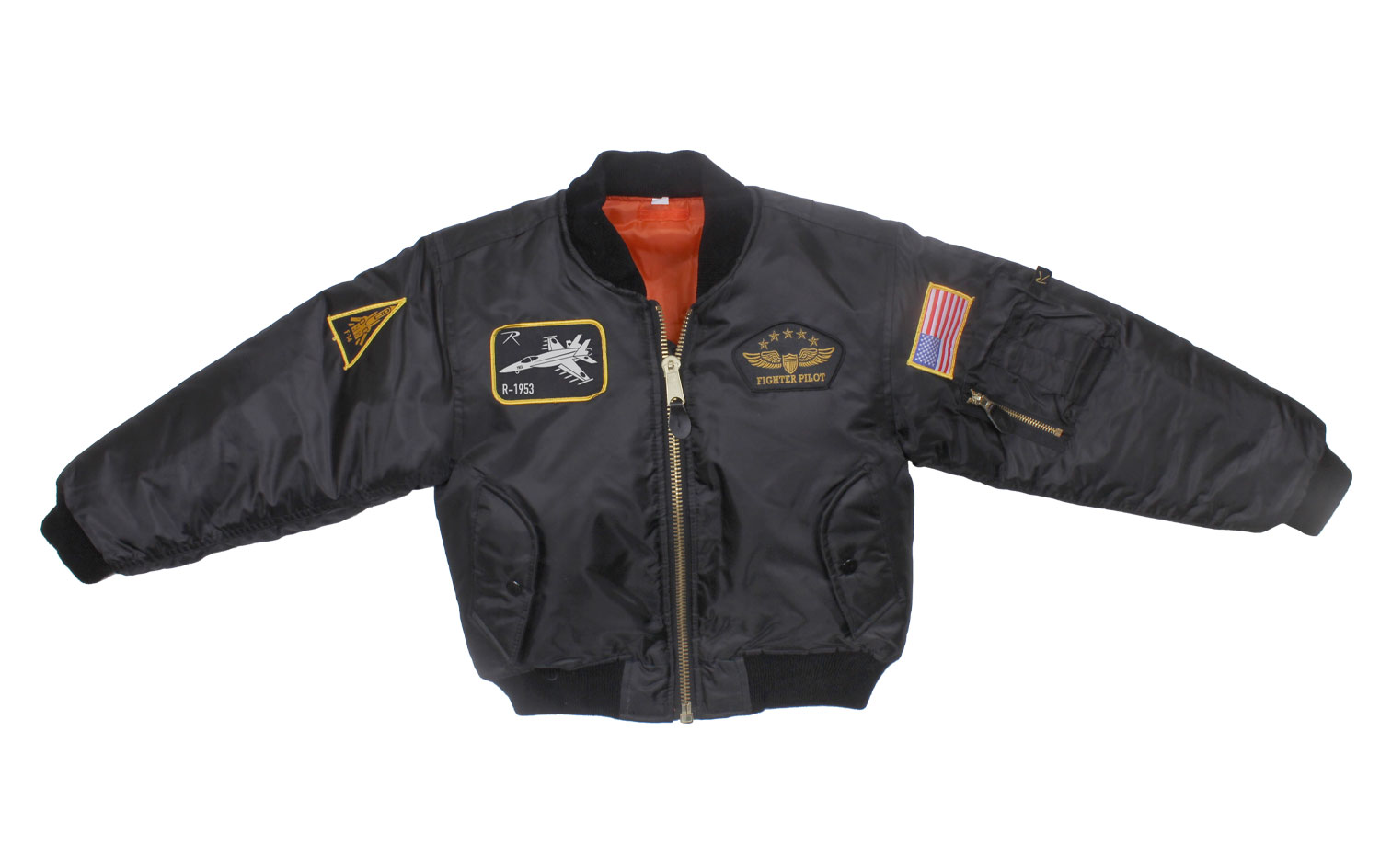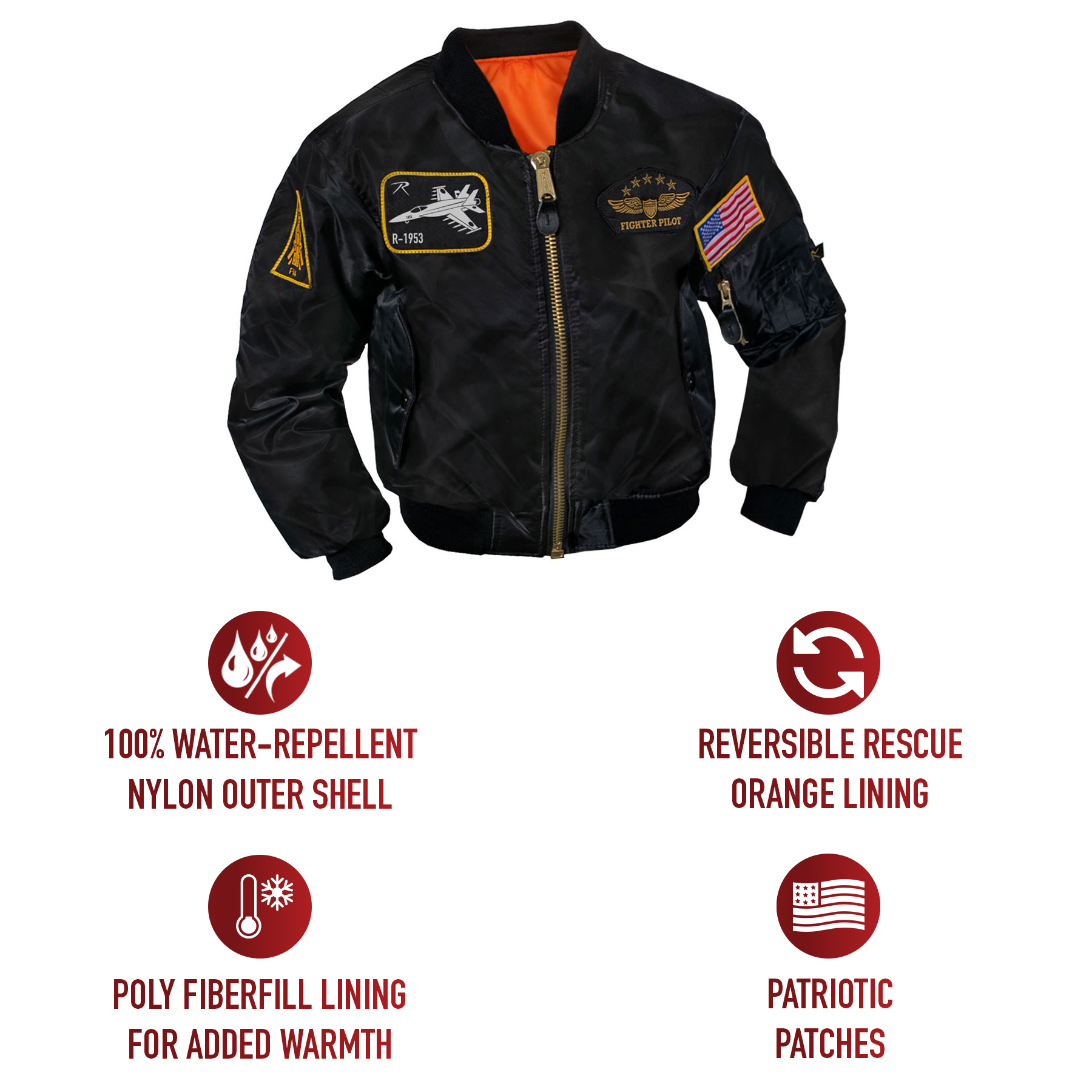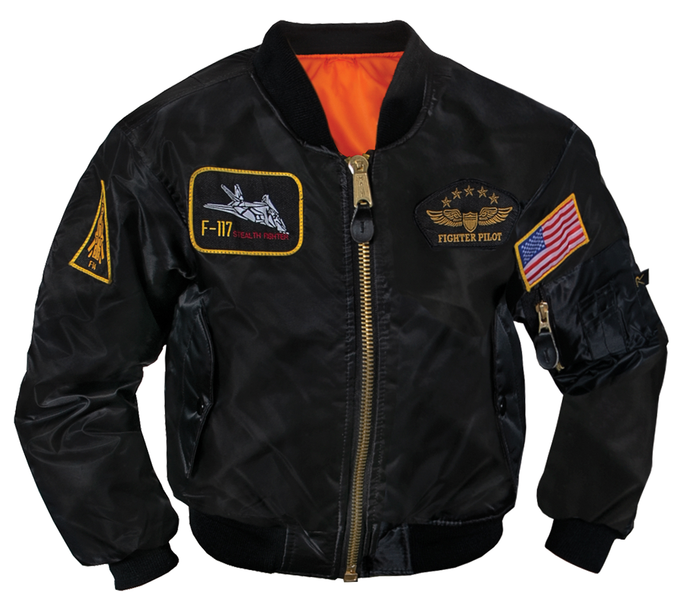Introduce your little one to the world of aviation with Rothco's Kids Flight Jacket. Crafted from 100% nylon with a water-repellent outer shell, this bomber jacket keeps them dry and comfortable. The poly fiberfill lining provides added warmth, while the reversible rescue orange lining enhances visibility in emergencies. Complete with aviation-inspired patches, including the American flag, F-14, F-117, and fighter pilot patches, this aviator jacket captures the essence of flight. Practical features include a zippered utility pocket on the left sleeve with pencil pockets, 2 front slash pockets, and 2 inner slash pockets for additional storage space. The front zipper closure with storm flaps offers protection against the elements, making this flight jacket a must-have for young aviation enthusiasts.