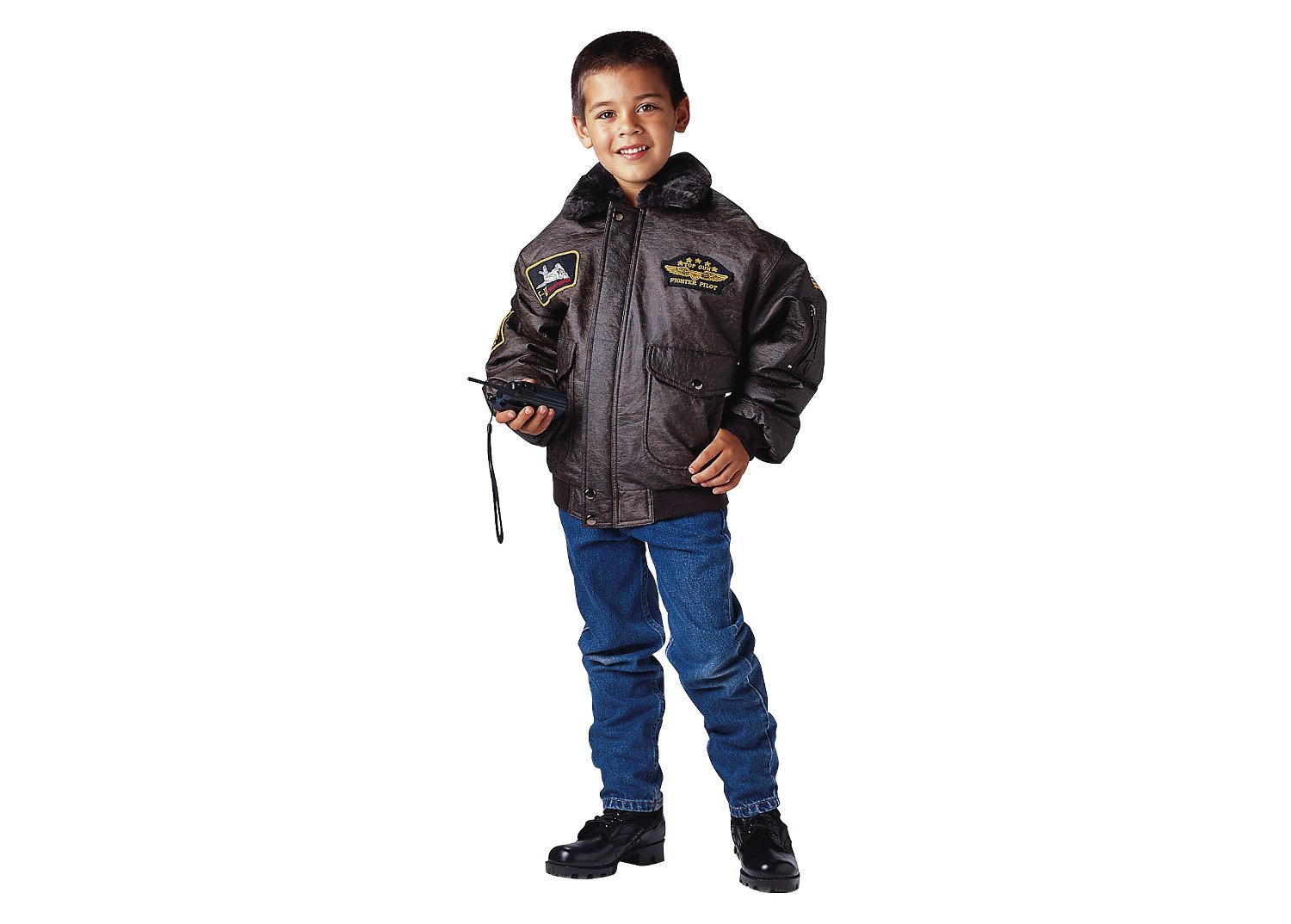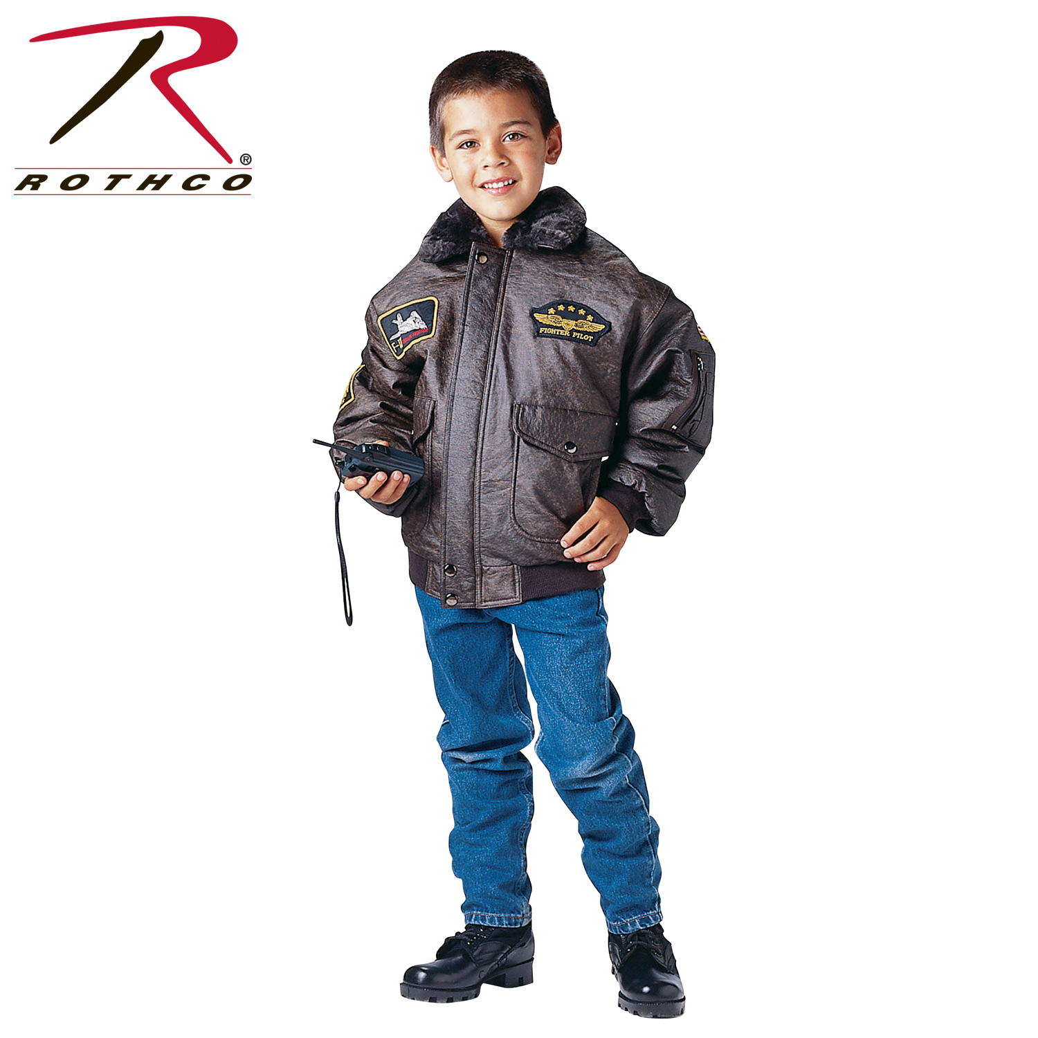 Prepare your child for take off in our Kids WWII Aviator Flight Jacket. Featuring a faux fur collar and quilted nylon lining in the sleeves, this kids flight jacket will keep your junior pilot warm and comfortable. The bomber jacket consists of washed synthetic leather outer shell for an authentic vintage appearance. The map print lining adds historical flair to the interior. The 2 front snap pockets and zippered utility pocket & pen pockets on the left sleeve offer additional space. In addition, the front zipper closure and storm flap keep the cold out while the elastic cuffs and waist add maximum comfort and room to stretch. This kids bomber style jacket comes with 4 patches: U.S. Flag, Fighter Pilot, 1953 Jet, and F-14 Jet. Elevate your child’s warmth and style with Rothco's Kids WWII Aviator Flight Jacket.
