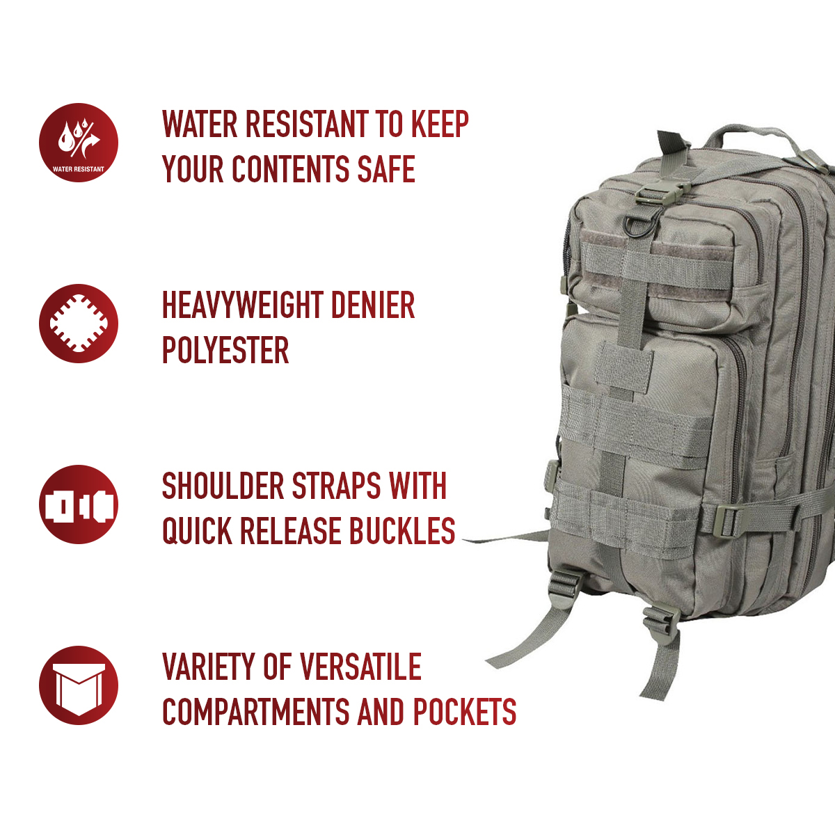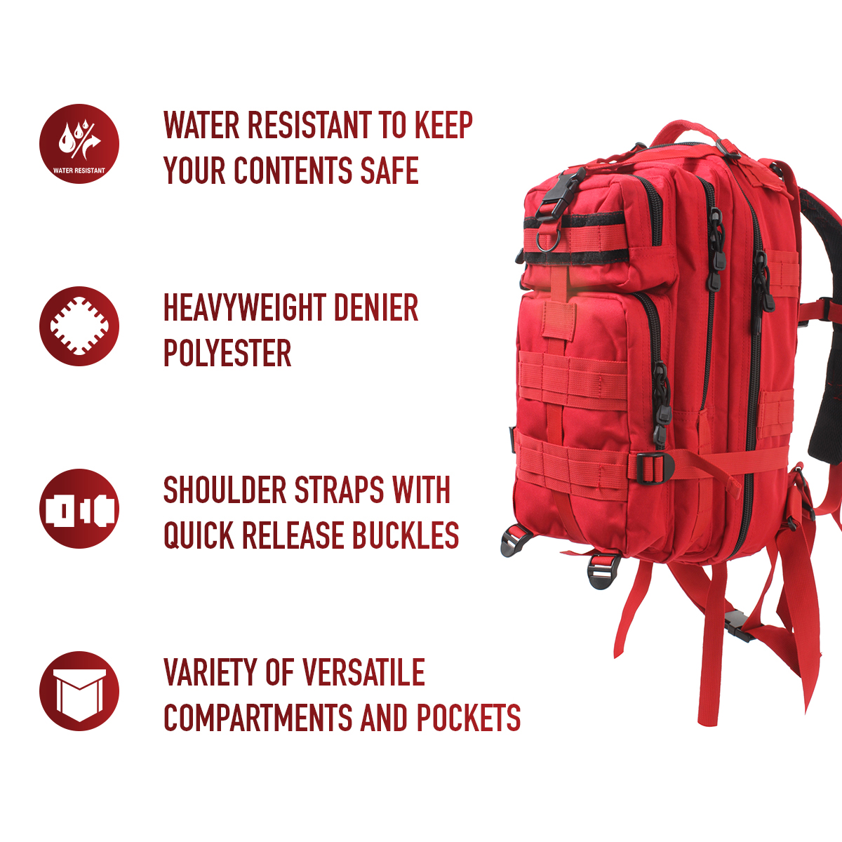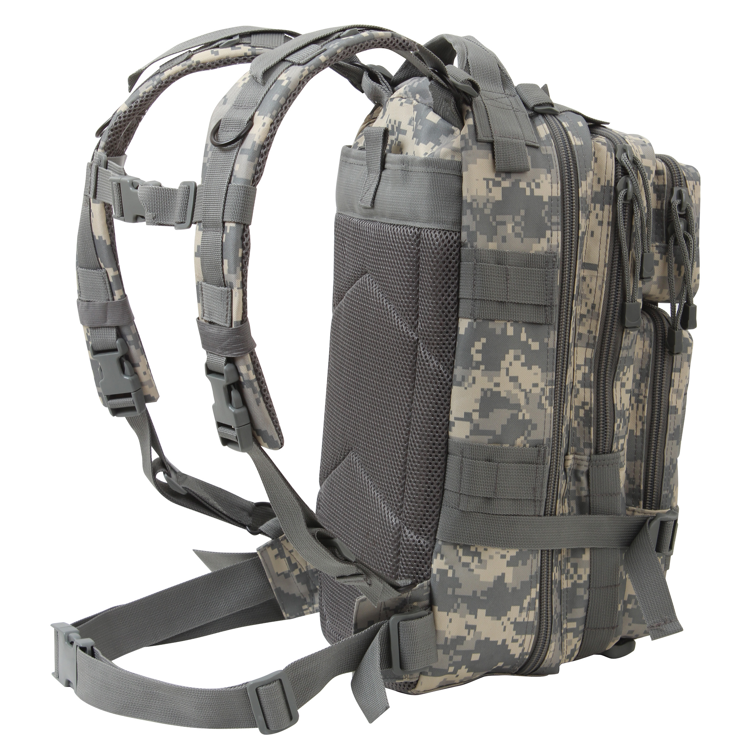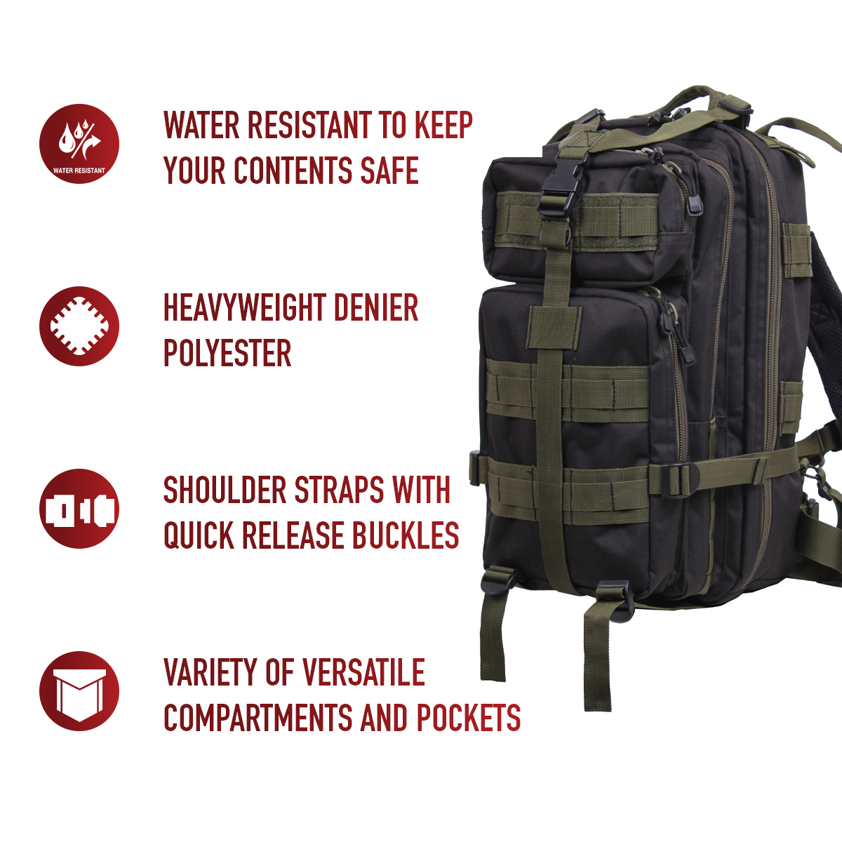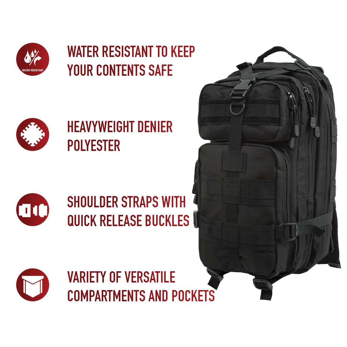 The Medium Transport Pack is your ultimate solution for tactical storage and outdoor readiness. With a 25L capacity, multiple compartments, and rugged military-grade construction, it’s built to withstand the toughest conditions. Whether you’re heading to the range, trekking through the wilderness, or preparing for emergencies, this versatile backpack has you covered with reliable organization and comfort. The military backpack is great for going to the range, trekking out into the great outdoors, or stocking up as a bug out bag. Rugged Construction: Engineered with 600D polyester and polypropylene webbing, these medium transport packs are built tough, withstanding strenuous activities while in the field. In addition, the storage compartments feature heavy-duty zippers and water-repellent lining. Ready for Action: The survival bag comes equipped with sternum straps and waist strap for weight distribution when carrying heavy loads. The compression straps ensure your gear stays secure. The get home bag features quick-release buckles for rapid and easy on/off. Versatile Carry Options: These tactical bags feature breathable mesh padding on the back and adjustable shoulder straps for a more comfortable carry. The top grab handle provides quick and easy handling for when you are on the go. Utility at the Forefront: These MOLLE compatible backpacks include d-rings and PALS webbing on the outside for mounting and securing additional tactical gear. The large capacity backpack features a rear hook & loop compartment designed for storing a hydration system (not included).
