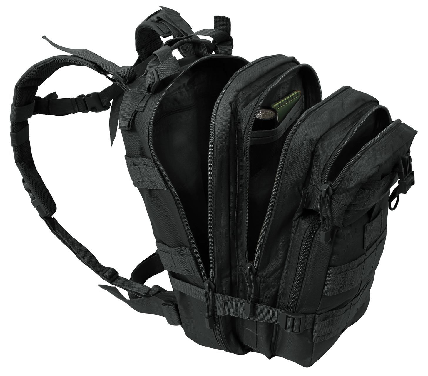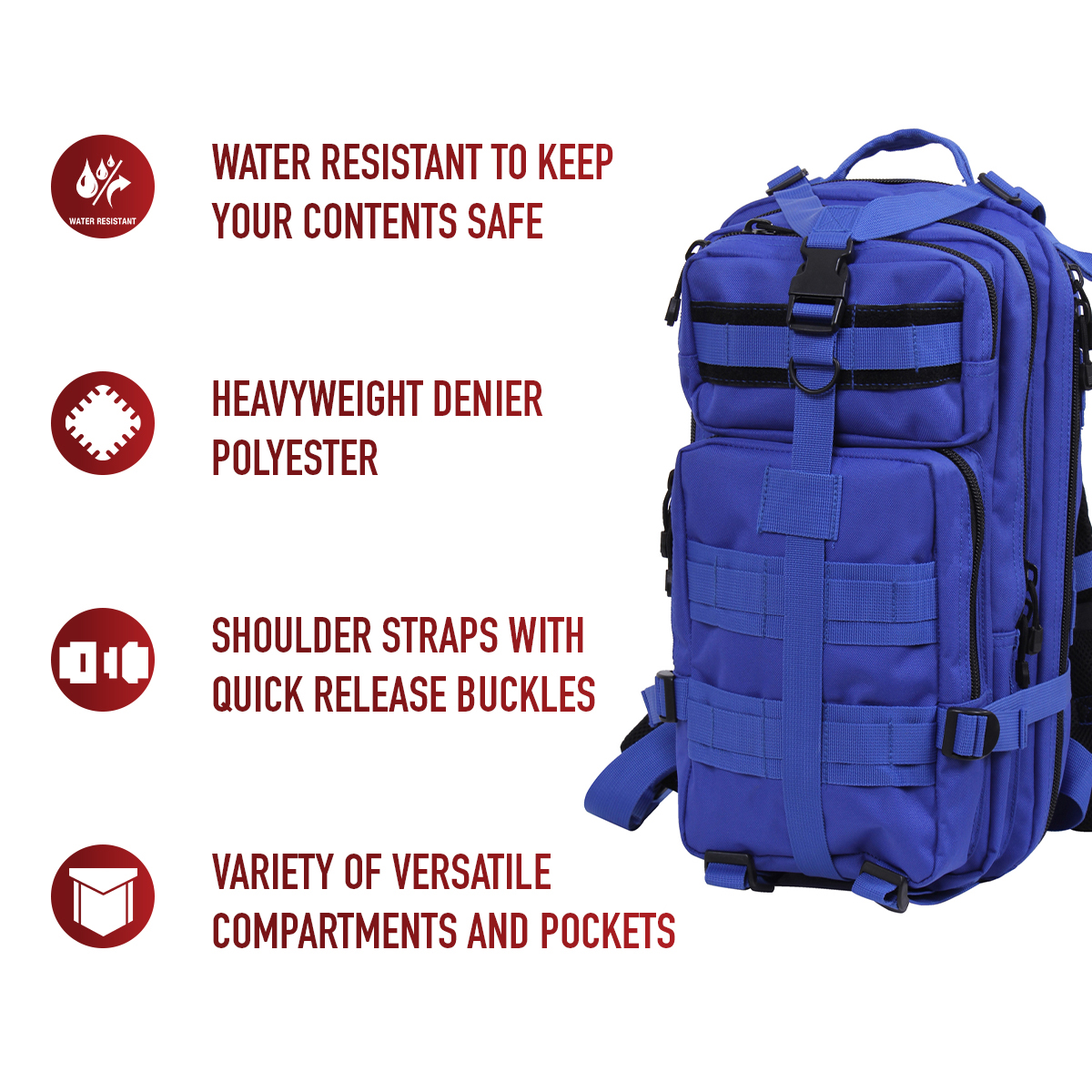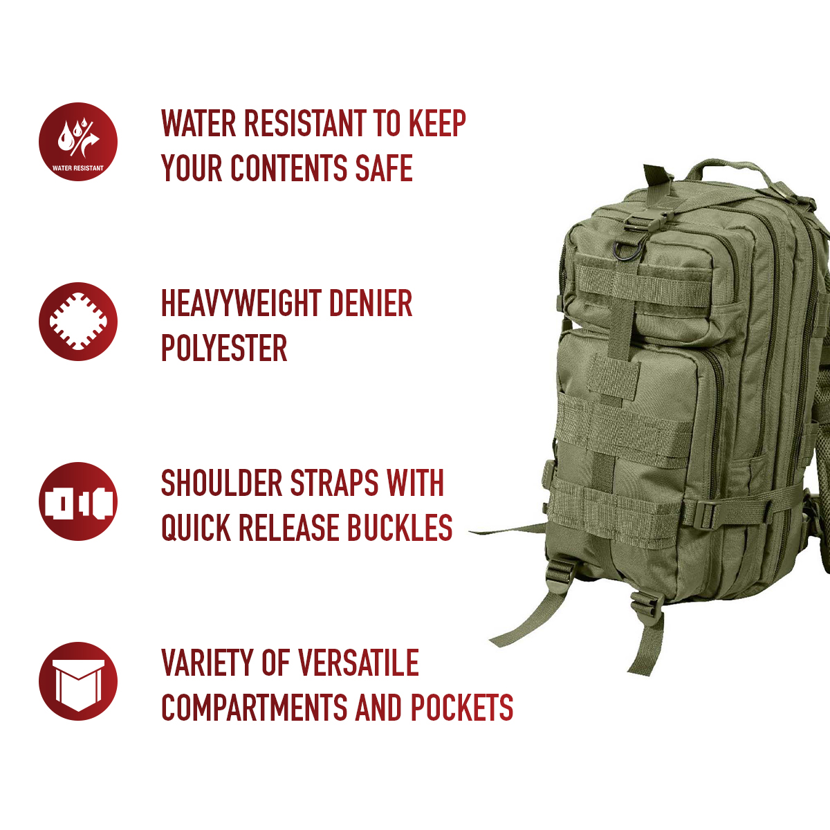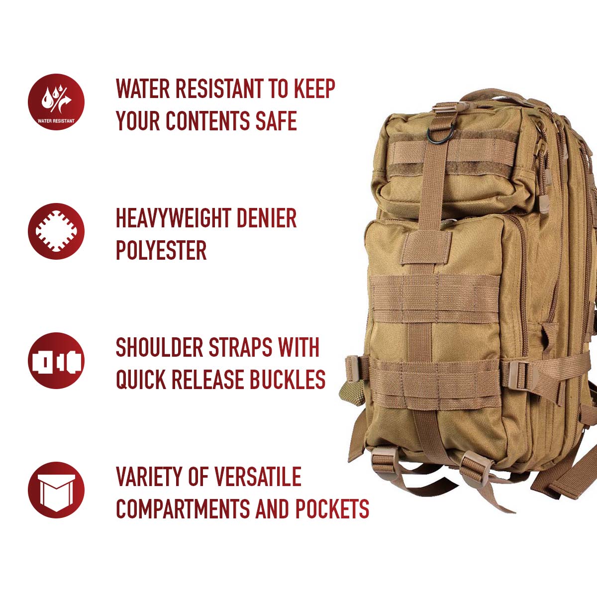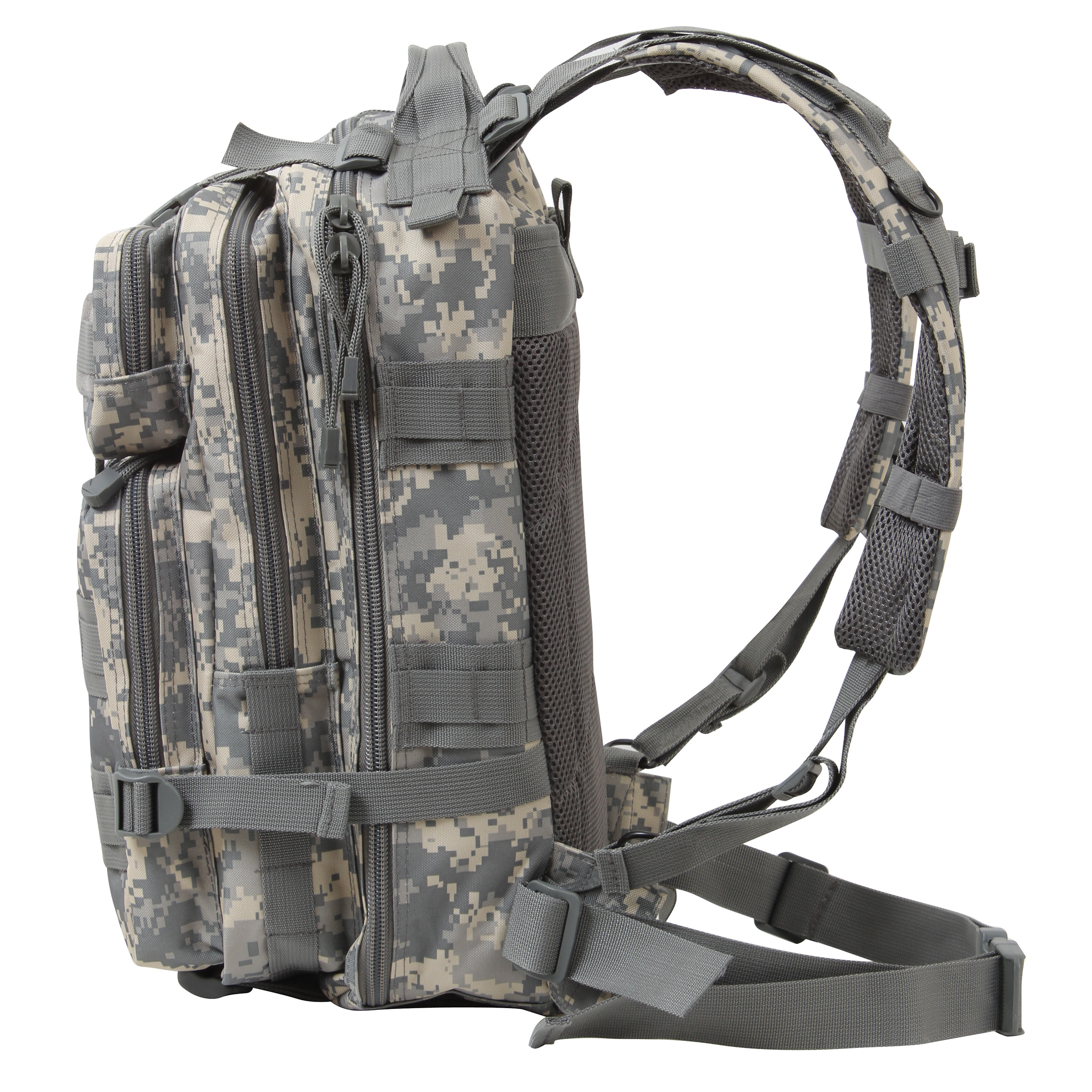 The Medium Transport Pack is your ultimate solution for tactical storage and outdoor readiness. With a 25L capacity, multiple compartments, and rugged military-grade construction, it’s built to withstand the toughest conditions. Whether you’re heading to the range, trekking through the wilderness, or preparing for emergencies, this versatile backpack has you covered with reliable organization and comfort. The military backpack is great for going to the range, trekking out into the great outdoors, or stocking up as a bug out bag. Rugged Construction: Engineered with 600D polyester and polypropylene webbing, these medium transport packs are built tough, withstanding strenuous activities while in the field. In addition, the storage compartments feature heavy-duty zippers and water-repellent lining. Ready for Action: The survival bag comes equipped with sternum straps and waist strap for weight distribution when carrying heavy loads. The compression straps ensure your gear stays secure. The get home bag features quick-release buckles for rapid and easy on/off. Versatile Carry Options: These tactical bags feature breathable mesh padding on the back and adjustable shoulder straps for a more comfortable carry. The top grab handle provides quick and easy handling for when you are on the go. Utility at the Forefront: These MOLLE compatible backpacks include d-rings and PALS webbing on the outside for mounting and securing additional tactical gear. The large capacity backpack features a rear hook & loop compartment designed for storing a hydration system (not included).