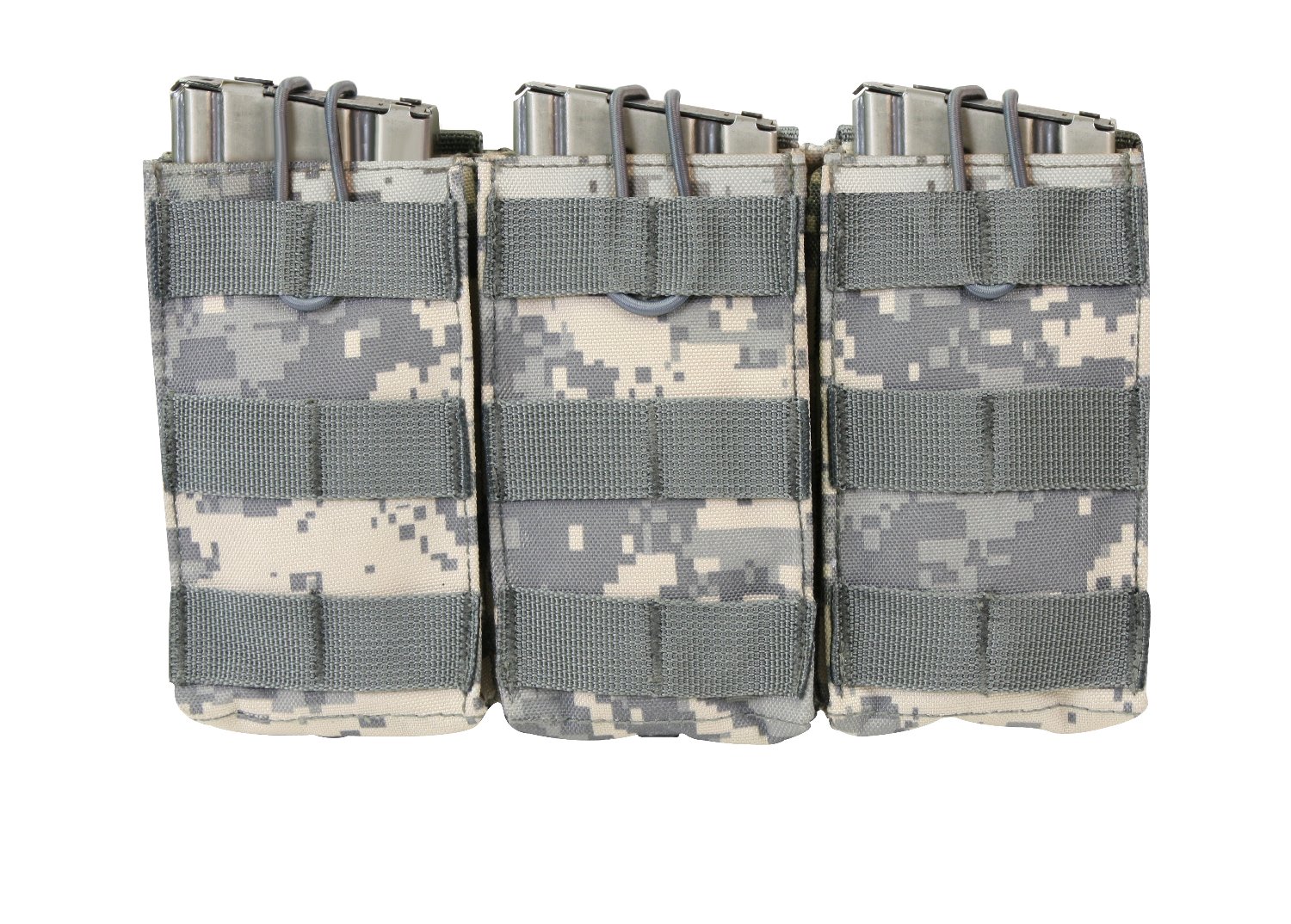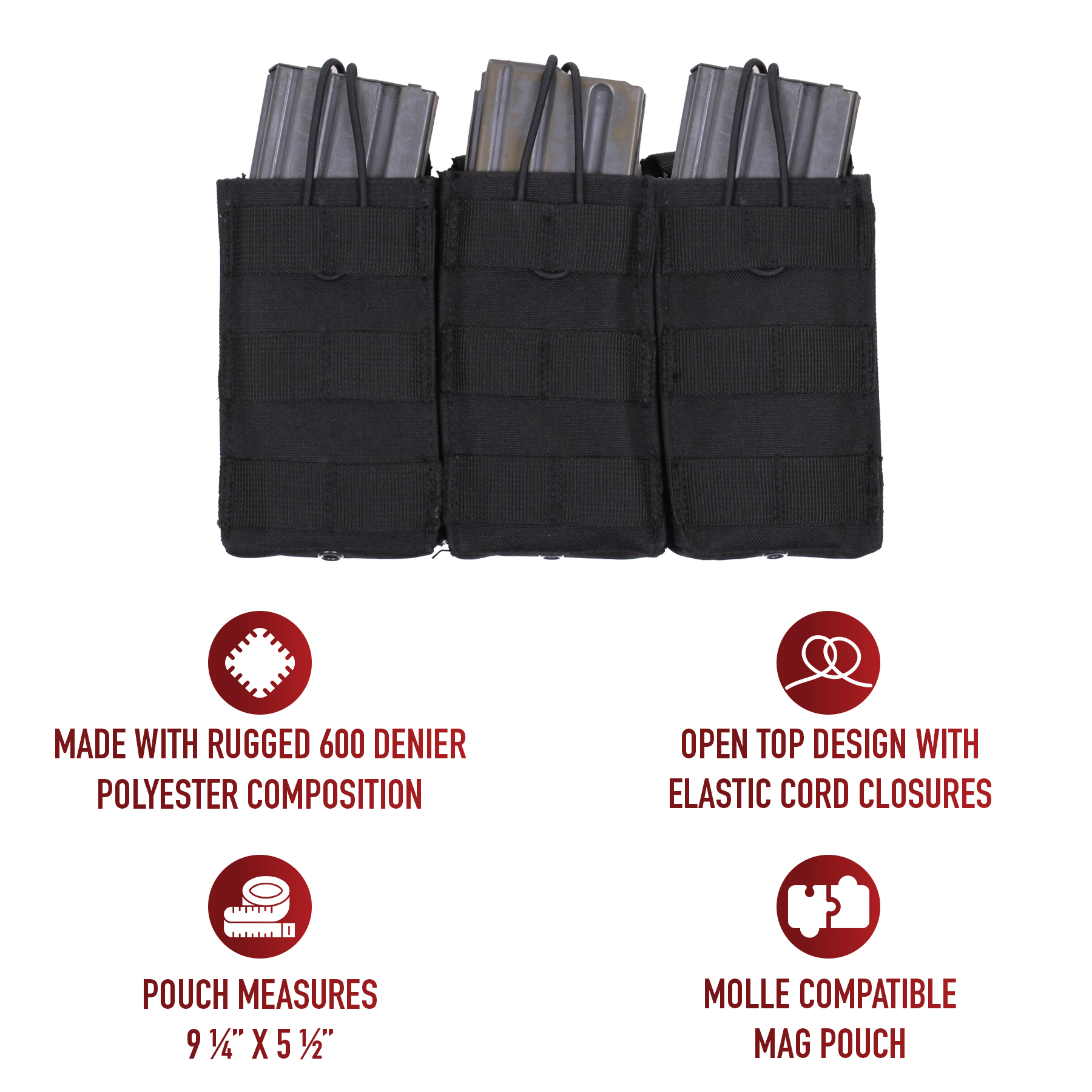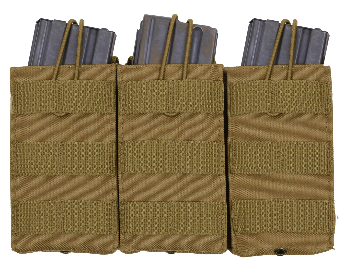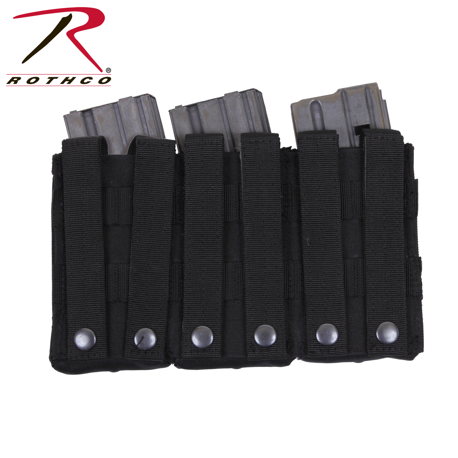 Elevate your tactical gear with Rothco’s MOLLE Open Top Triple Mag Pouch, the ultimate solution for carrying extra rifle mags. Crafted for versatility and durability, this pouch seamlessly integrates with your MOLLE-compatible plate carrier vest, tactical pack, or any gear featuring a MOLLE panel. Designed to accommodate 3 rifle mags, including AK-47 and M-16 magazines, it ensures you have quick and convenient access to ammunition when you need it most. The open-top design with elastic cord closures enables rapid reloading during critical moments. Constructed from rugged 600 Denier polyester, this pouch withstands the rigors of outdoor environments and tactical operations, ensuring long-lasting performance. Its compact dimensions, measuring 9 ¼ inches X 5 ½ inches, provide high-capacity storage without adding unnecessary bulk. Additionally, grommet drainage holes prevent moisture buildup, enhancing durability in adverse conditions. Whether you're on duty or engaged in recreational activities like airsoft or paintball, this triple mag pouch is an essential addition to your loadout. Versatile and dependable, it offers a secure and accessible solution for carrying your essential rifle magazines.