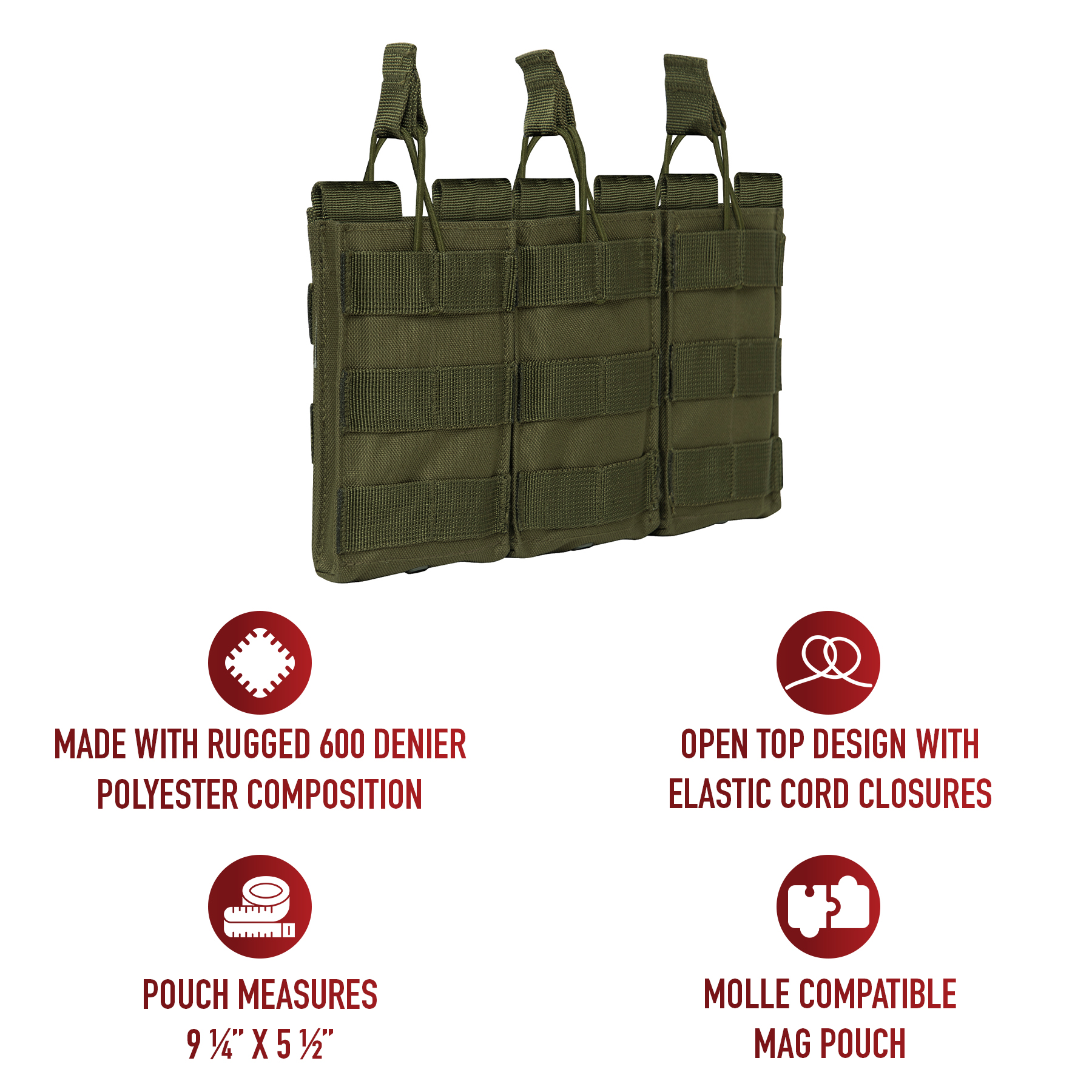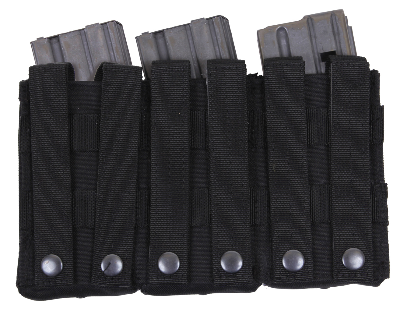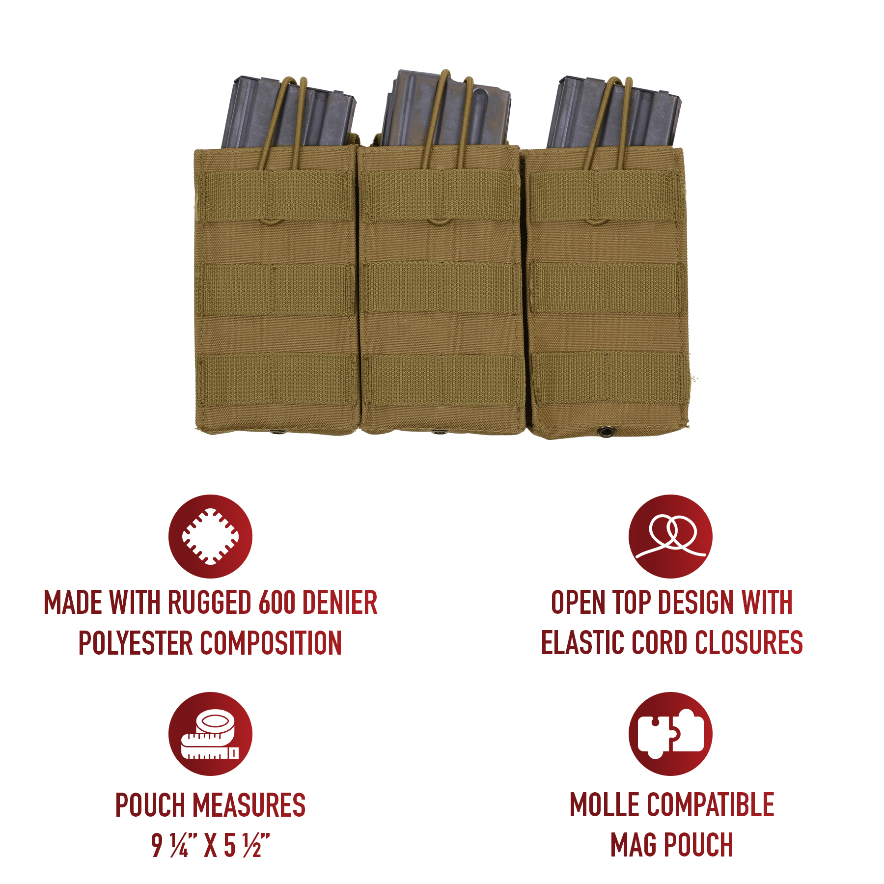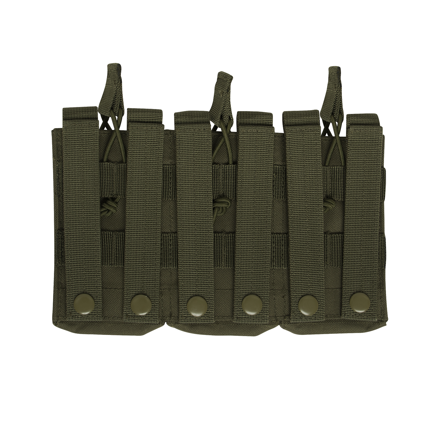 Elevate your tactical gear with Rothco’s MOLLE Open Top Triple Mag Pouch, the ultimate solution for carrying extra rifle mags. Crafted for versatility and durability, this pouch seamlessly integrates with your MOLLE-compatible plate carrier vest, tactical pack, or any gear featuring a MOLLE panel. Designed to accommodate 3 rifle mags, including AK-47 and M-16 magazines, it ensures you have quick and convenient access to ammunition when you need it most. The open-top design with elastic cord closures enables rapid reloading during critical moments. Constructed from rugged 600 Denier polyester, this pouch withstands the rigors of outdoor environments and tactical operations, ensuring long-lasting performance. Its compact dimensions, measuring 9 ¼ inches X 5 ½ inches, provide high-capacity storage without adding unnecessary bulk. Additionally, grommet drainage holes prevent moisture buildup, enhancing durability in adverse conditions. Whether you're on duty or engaged in recreational activities like airsoft or paintball, this triple mag pouch is an essential addition to your loadout. Versatile and dependable, it offers a secure and accessible solution for carrying your essential rifle magazines.