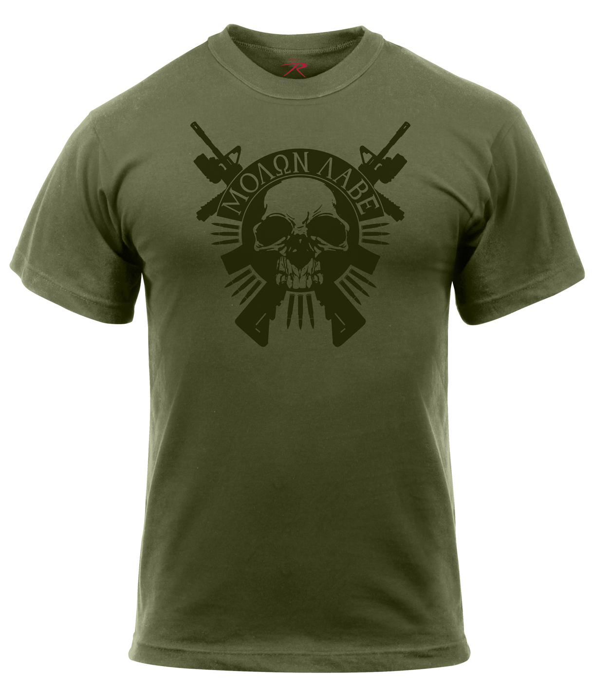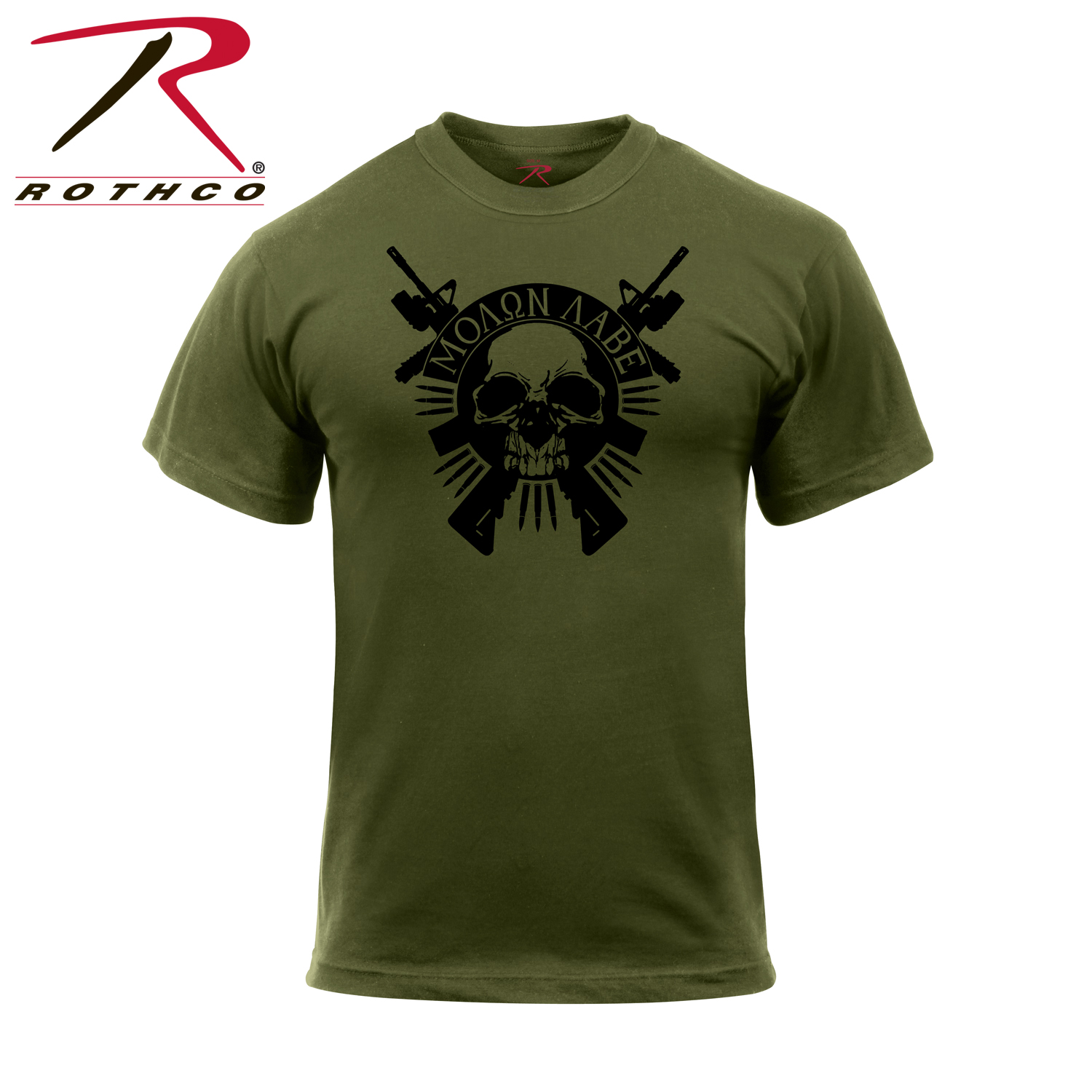 Rothco’s Molon Labe Skull T-Shirt brings a bold and historic message to your wardrobe, featuring a powerful graphic of a skull with 2 crossed rifles and the iconic “Molon Labe” phrase, which translates to "Come and Take It." This statement originates from King Leonidas of Sparta, symbolizing defiance and strength. Printed on a durable yet soft cotton / polyester fabric blend, the graphic shirt offers both comfort and longevity, making it perfect for everyday wear or as a standout piece for special occasions. The Molon Labe text is displayed across a banner beneath the skull graphic, adding depth and detail to the design. With a tag-less label for added comfort, you’ll enjoy a smooth, irritation-free fit. Whether for personal use or as a gift, Rothco’s Molon Labe Skull T-Shirt is perfect for those who value both history and style.