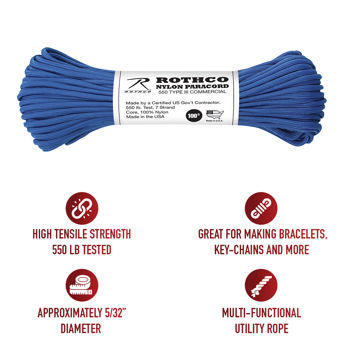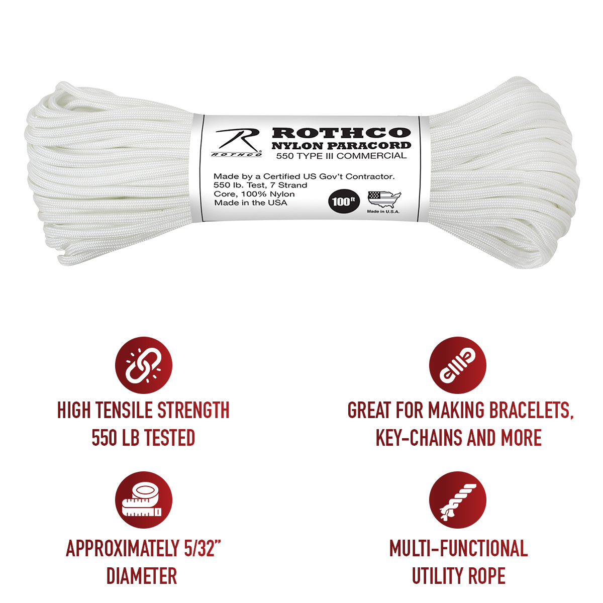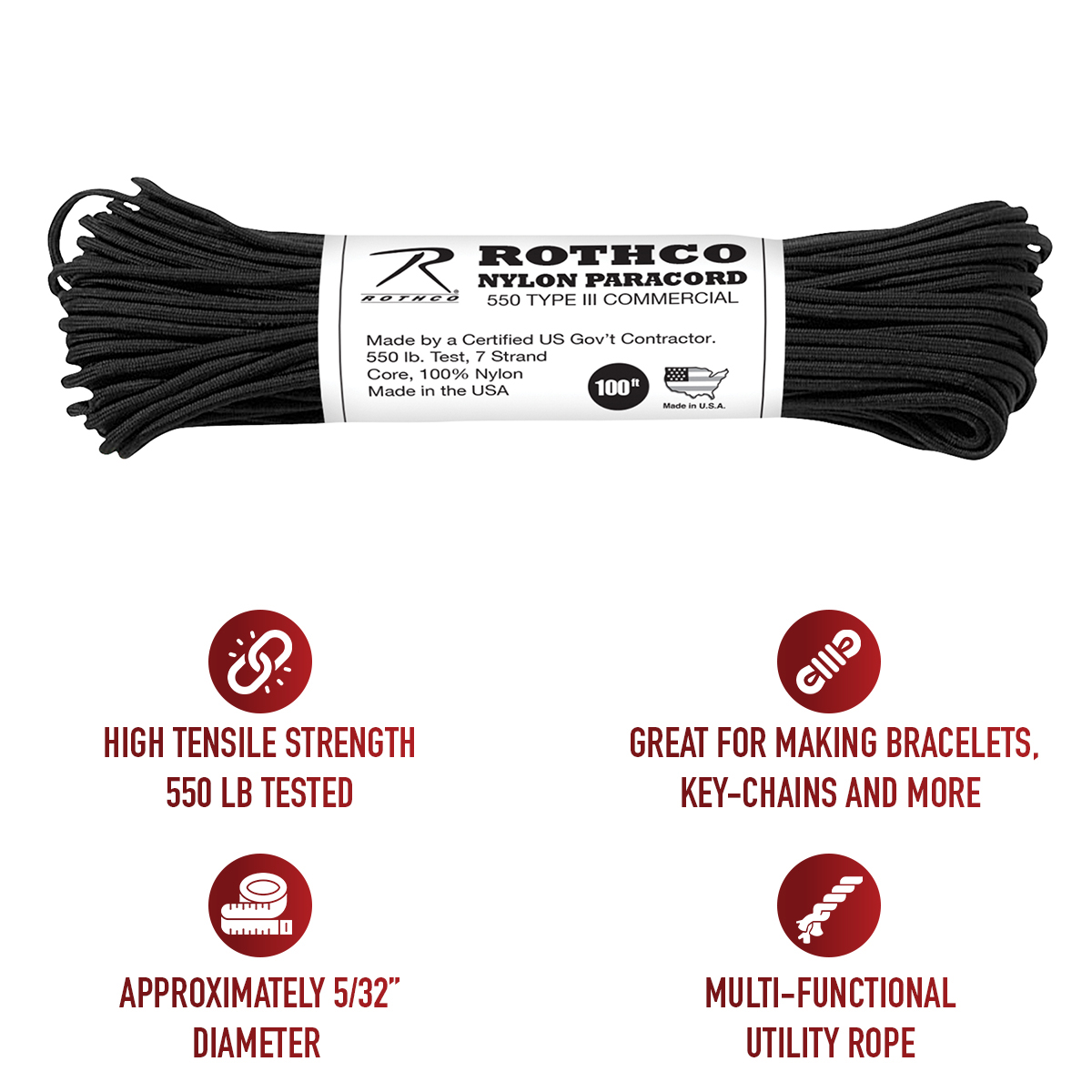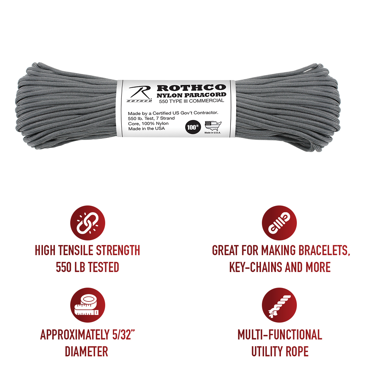 Rothco's Nylon Paracord Type III 550 LB is a pinnacle of strength and reliability, crafted in the United States. Tested to withstand 550 LB, this service-grade paracord features a durable 7-strand core and a 5/32 inches diameter, ensuring optimal tensile strength for various applications. Originally utilized by the service, this lightweight cord has become a go-to for camping, survival situations, and inclusion in Bug Out Bags. Its multi-functional utility extends to crafting bracelets, key-chains, and an array of rope accessories, making it an essential tool in everyday life. Produced in the USA, this paracord is a testament to American craftsmanship. Rothco's Nylon Paracord stands as a symbol of strength, versatility, and durability—perfectly suited for both professional and recreational applications. Elevate your preparedness and crafting endeavors with a paracord that meets the rigorous standards set by the U.S. Government.