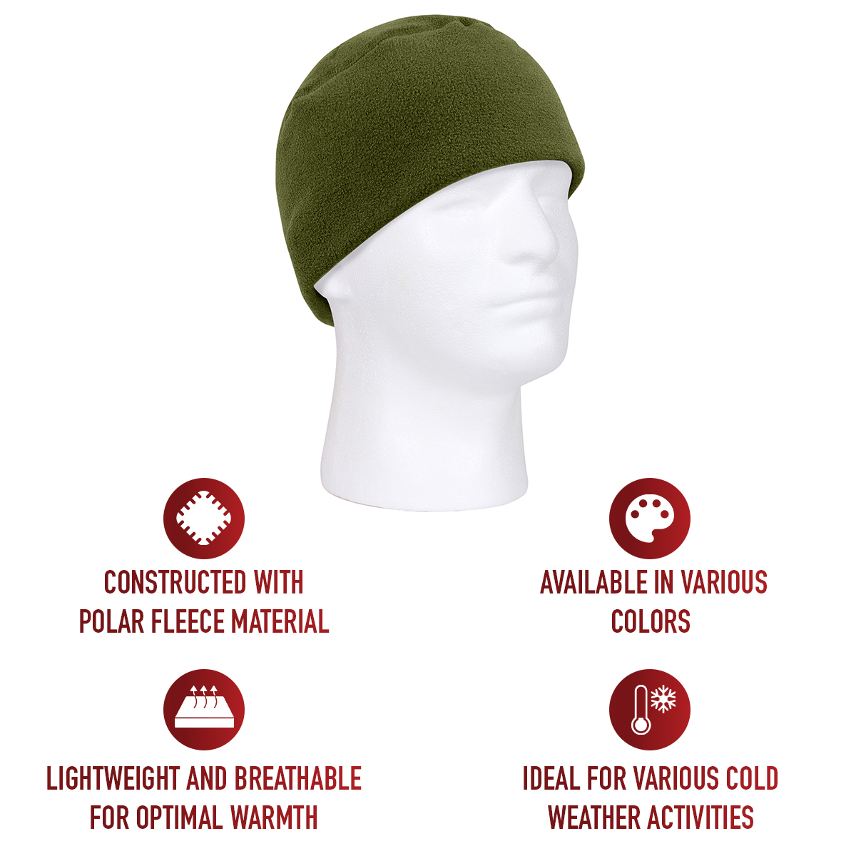 Keep incredibly warm this winter by wearing our Polar Fleece Watch Cap. These military winter hats offer unbeatable all-weather protection, provide additional coverage against the snow, are built to withstand rugged outdoor use, and will protect you wherever you go. They’re great for daily wear, camping, fishing, hiking, skiing, snowboarding, skating, biking, and other outdoor activities. Keep one in your car for those spontaneous adventures that your friends or family came up with on the fly! Optimal Warmth: The military-styled watch cap features lightweight and breathable polar fleece fabric that offers enhanced warmth and protection, creating a helpful and convenient barrier against cold weather. Comfortable Fit: In addition to keeping you warm, the soft beanie hat is extremely comfortable. Wear your winter cap all day (and night) without any discomfort. One Size Fits Most: Our comfortable outdoor hats are for both men and women, and will accommodate most head sizes. The fleece material aids in its unmatched versatility, and is designed to cover the ears for added warmth. We’ve Got You Covered: Looking for additional winter accessories? Stay warm and dry with one of our Wool Scarves, a pair of our Fingerless Wool Gloves, or a pair of 8 Inch Extreme Cold Weather Hiking Boots that feature Rothco’s Thermoblock Tech insulation.