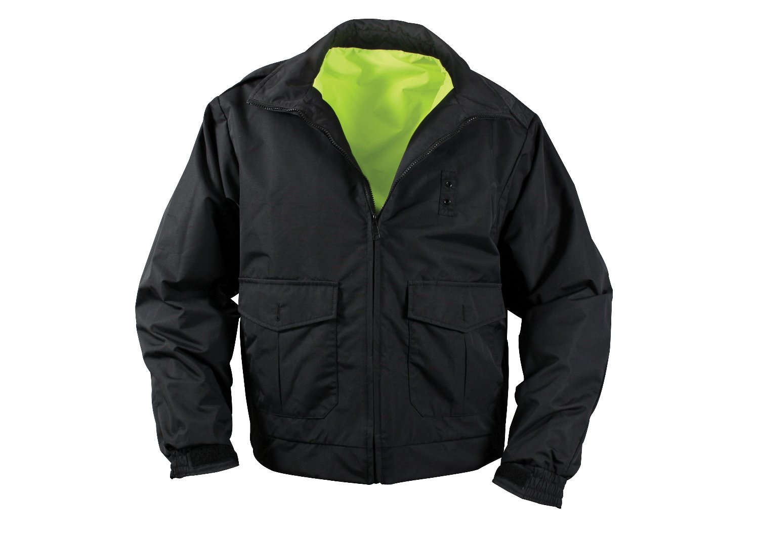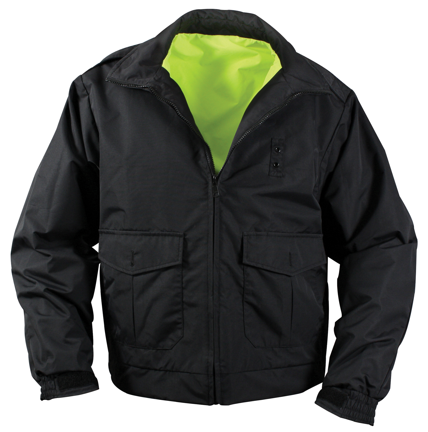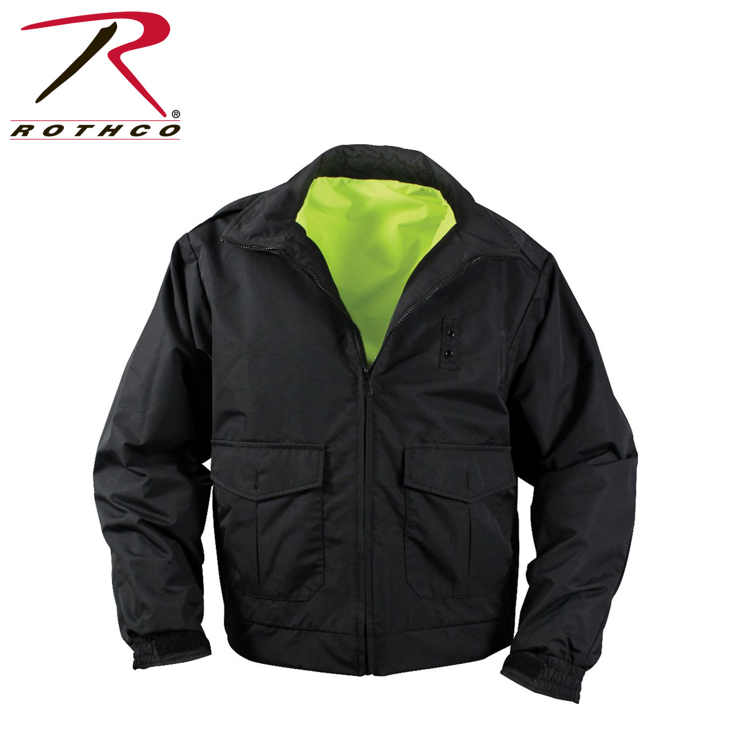 Gear up with Rothco’s Reversible Hi-Visibility Uniform Jacket. This reversible jacket offers waterproof protection and hi-vis functionality with reflective striping, featuring badge tabs and large pockets for public safety personnel. Convenient utility features include side zippers that allow quick access to inside pockets, while large lower pockets on the black side offer ample storage space for essential gear and equipment. Maintain your professional appearance with epaulets on the black side to add an extra touch of professionalism, making this uniform jacket suitable for various public safety roles. This reversible rain jacket is ideal for law enforcement officers, security guards, emergency responders, and other public safety personnel who require reliable, high-visibility outerwear. Stay visible and protected whether you're directing traffic, patrolling the streets, or responding to emergencies, this jacket provides the visibility and protection you need to perform your duties effectively. Stay dry and comfortable with waterproof construction and breathable fabric, this uniform jacket ensures you stay dry and comfortable even during prolonged exposure to inclement weather. Built to last, constructed from durable materials and designed for long-lasting performance, this hi-vis jacket is built to withstand the rigors of daily use in demanding environments. Trusted brand - Rothco is a trusted brand known for its high-quality tactical gear and apparel, making the Reversible Hi-Visibility Uniform Jacket a reliable choice for public safety professionals.
