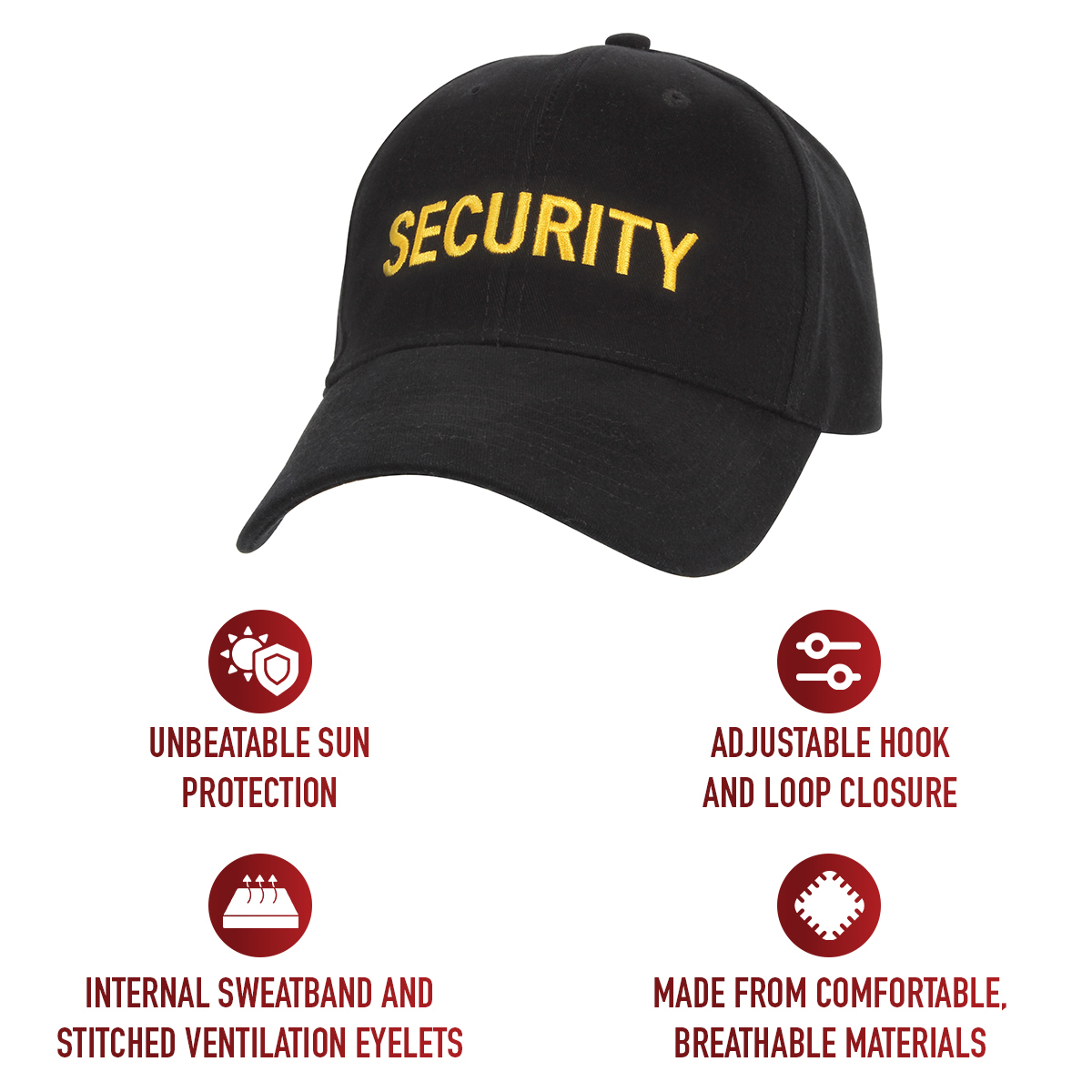 Designed for security guards and public safety, our Supreme Low Profile Insignia Cap features embroidered “SECURITY” text, brushed cotton twill, and a padded sweatband for comfort.. Adjustable strap and ventilation holes ensure a perfect fit and cool wear. Keep your head in the game with Rothco’s collection of headwear and accessories. Designed with precision and purpose, our headgear is built to withstand the harshest conditions. Whether you’re tackling the cold in one of our Watch Caps or Balaclavas, or out on a mission in a Boonie Hat or Fatigue Cap, our diverse range of headwear provides unmatched comfort and protection for everyone from active-duty personnel to outdoor enthusiasts.