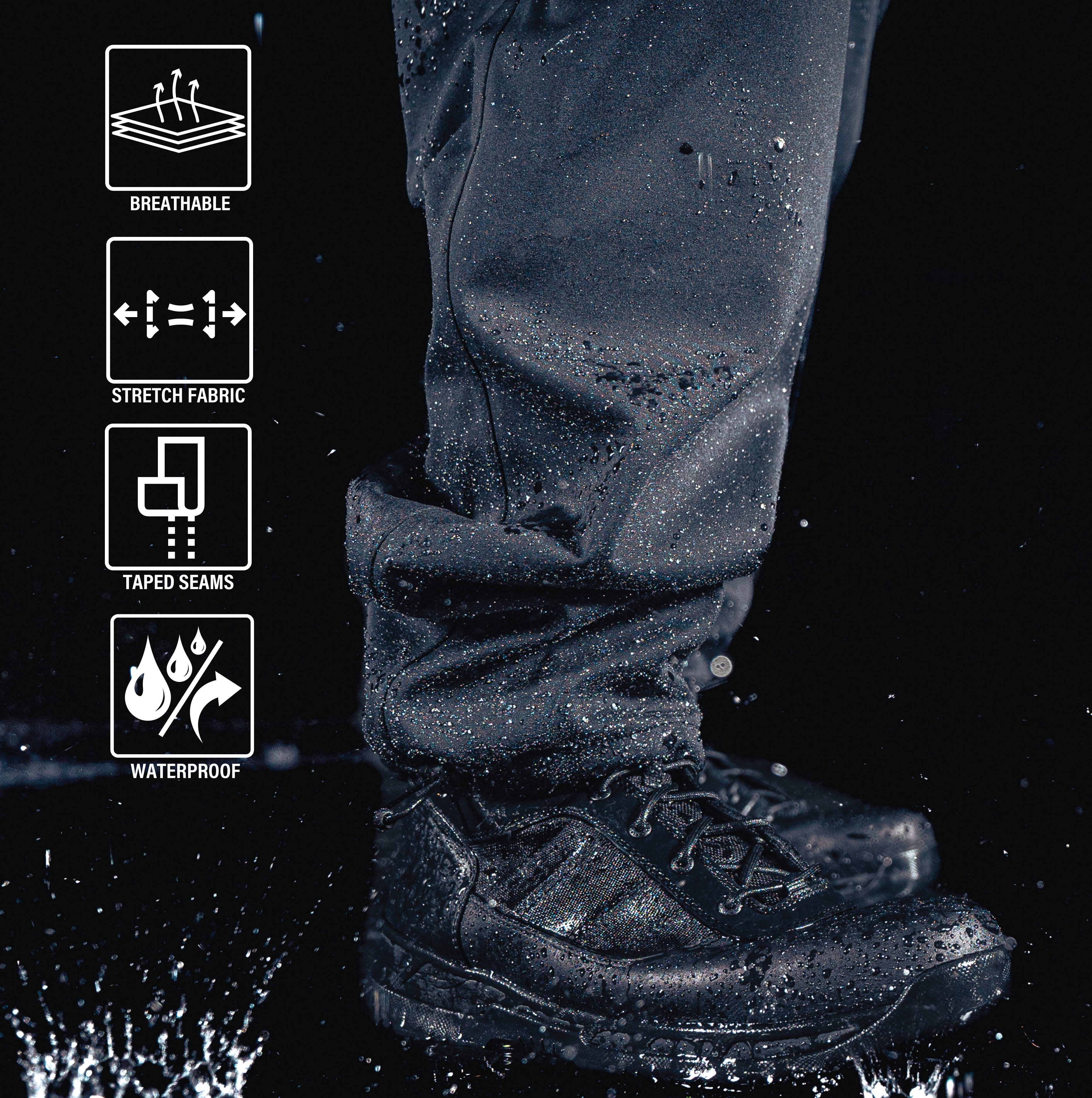 Silence the storm with our Shadow Ops Waterproof Rain Pant. These high-performance, ultra-light rain pants provide unparalleled wind and rain protection while offering extreme comfort. The outdoor hiking pants have a waterproof rating of 5,000mm that easily endures harsh outdoor weather conditions. Move with Silent Precision: Built to keep you comfortable and on-the move, our Active Flex stretch technology is ready to tackle any challenge, offering flexibility and ease of movement. These rain pants feature a sleek and silent design that utilizes our Shadow Ops fabric that is engineered with waterproof properties and a fabric that is quiet while you move. Storage Pockets: The rain pants come equipped with 3 waterproof zipper pockets: 2 front slash pockets and 1 back pocket on the right for keeping your EDC essentials secure and dry. Utility at the Forefront: These waterproof hiking pants feature a zipper fly with a heavy-duty button closure for an easy on and off while maintaining a secure fit. The drawstring ankle with cord lock keeps wind and rain out. Ready for Action: The comfort stretch outdoor pants are great for camping, hiking, hunting, fishing, boating, and other outdoor activities. From the forest and mountains to concrete jungles and everyday wear, these rugged rain pants are with you every step of the way.